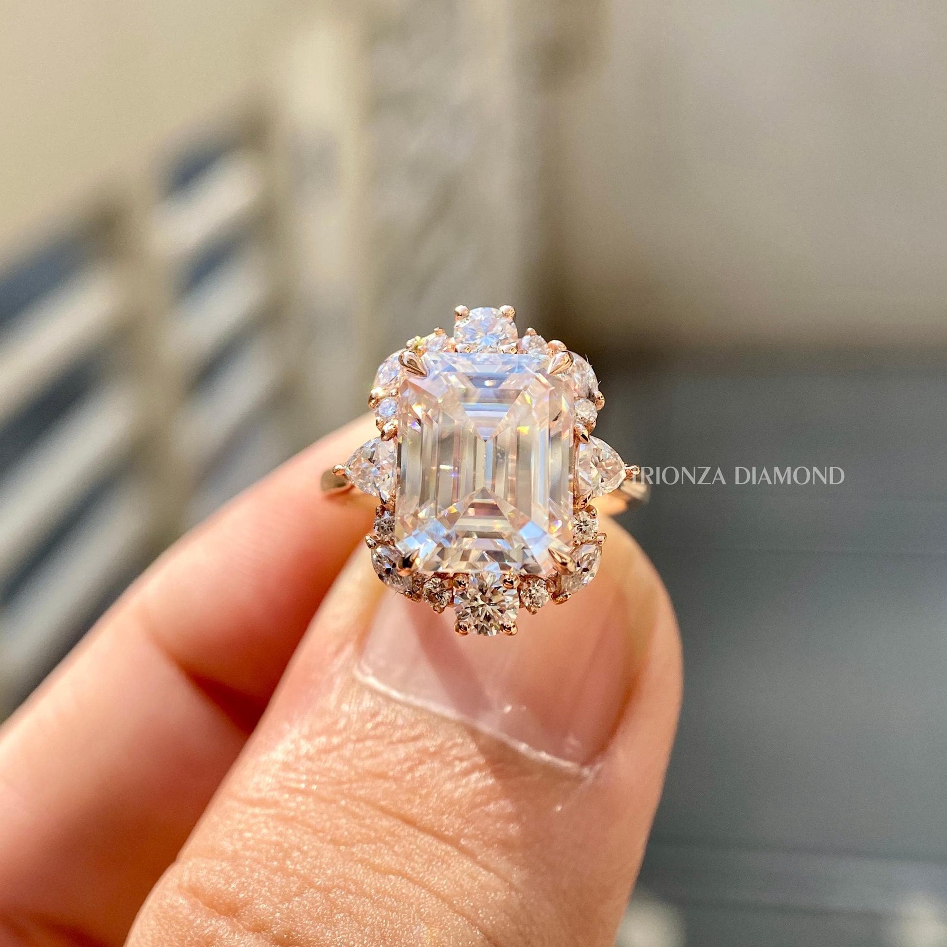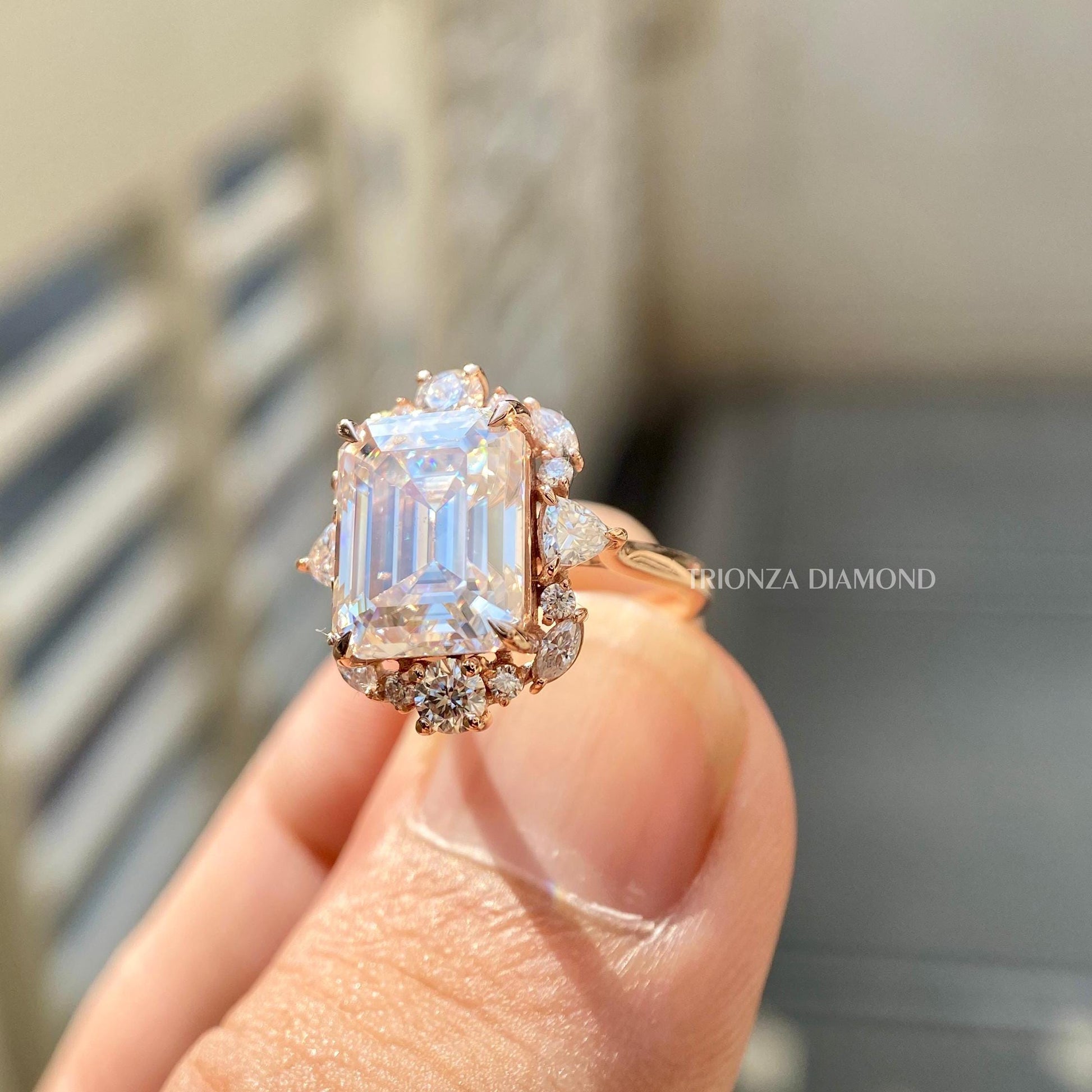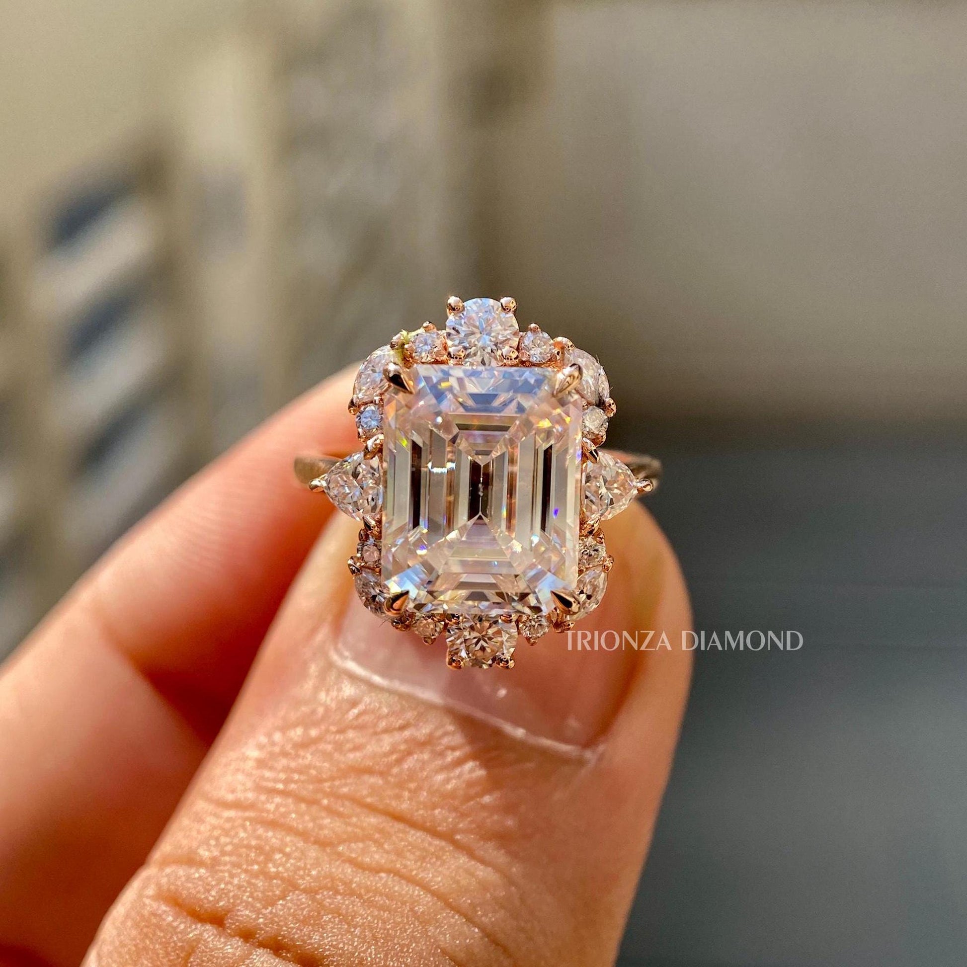 Discover our stunning 4 CT Emerald Cut Lab Grown Diamond Ring, featuring a captivating Marquise Trillion Halo design. This exquisite lab-created vintage engagement ring offers a beautiful, conflict-free, and eco-friendly alternative to natural diamonds.