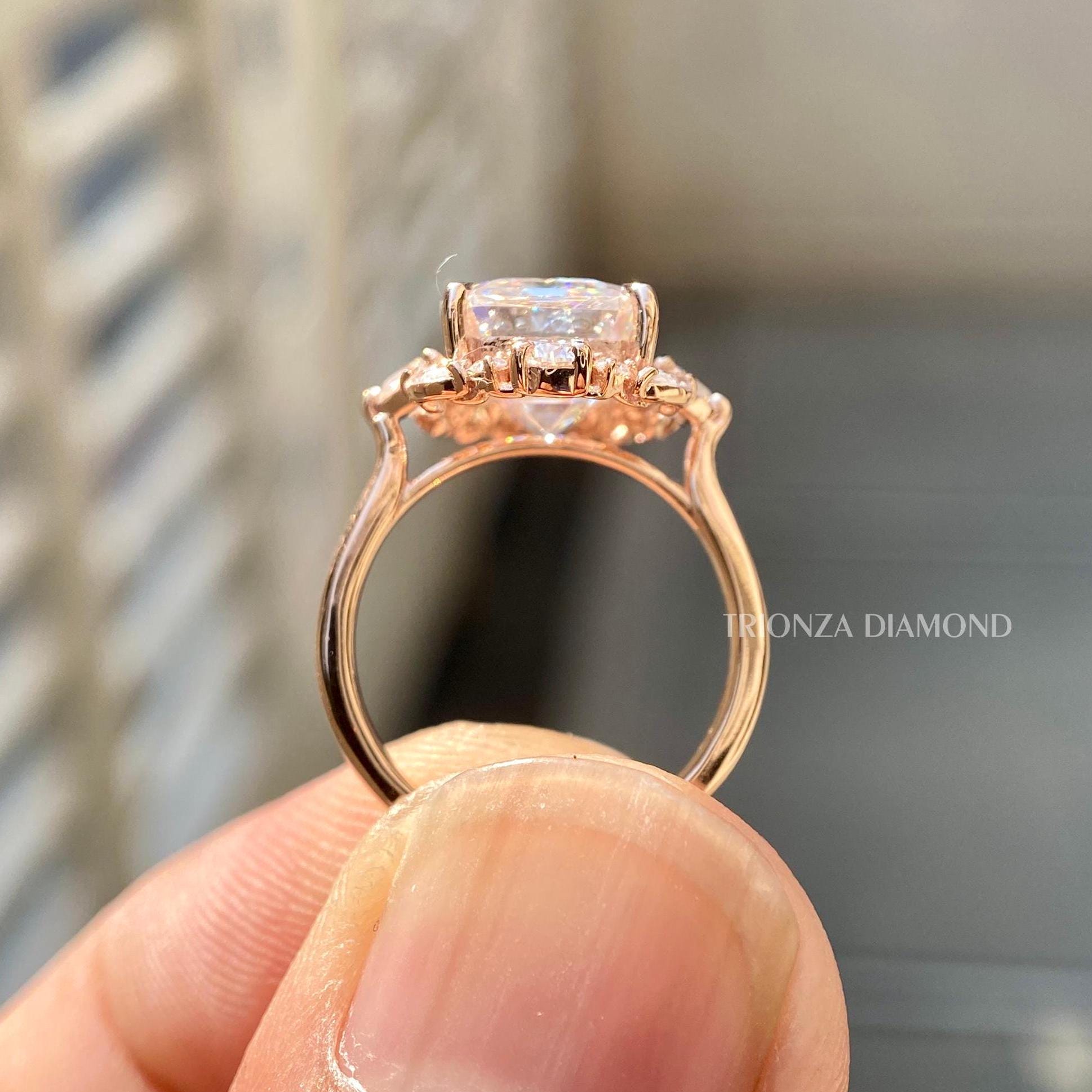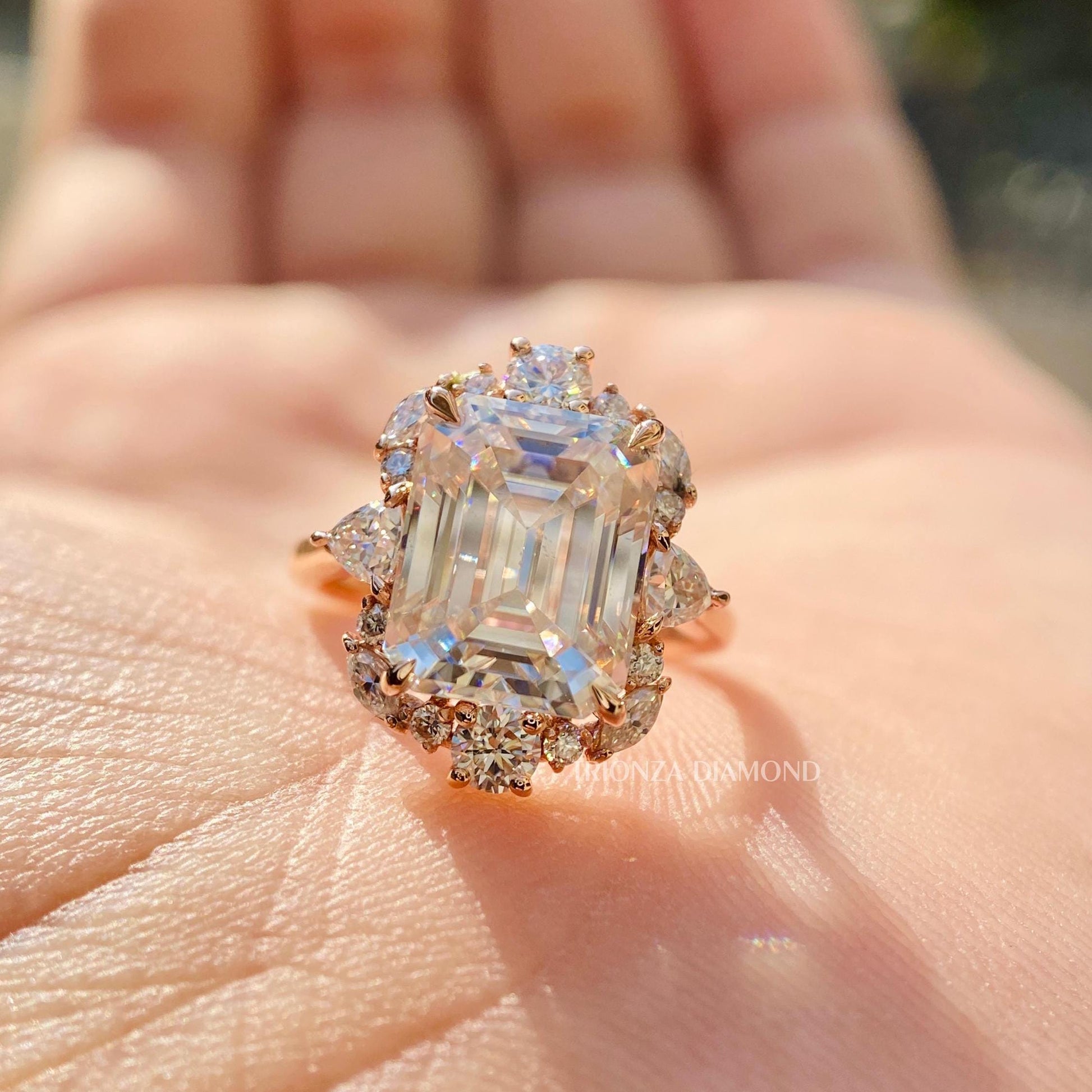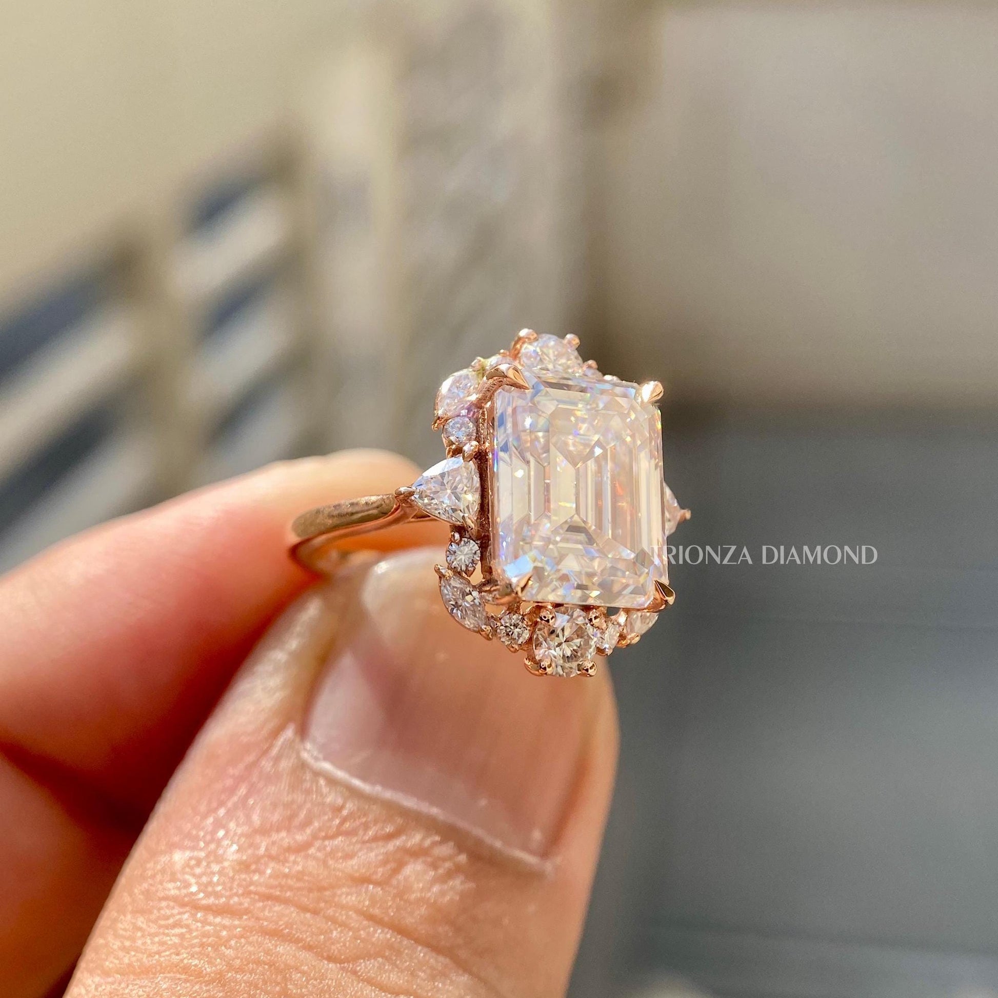 Discover our stunning 4 CT Emerald Cut Lab Grown Diamond Ring, featuring a captivating Marquise Trillion Halo design. This exquisite lab-created vintage engagement ring offers a beautiful, conflict-free, and eco-friendly alternative to natural diamonds.