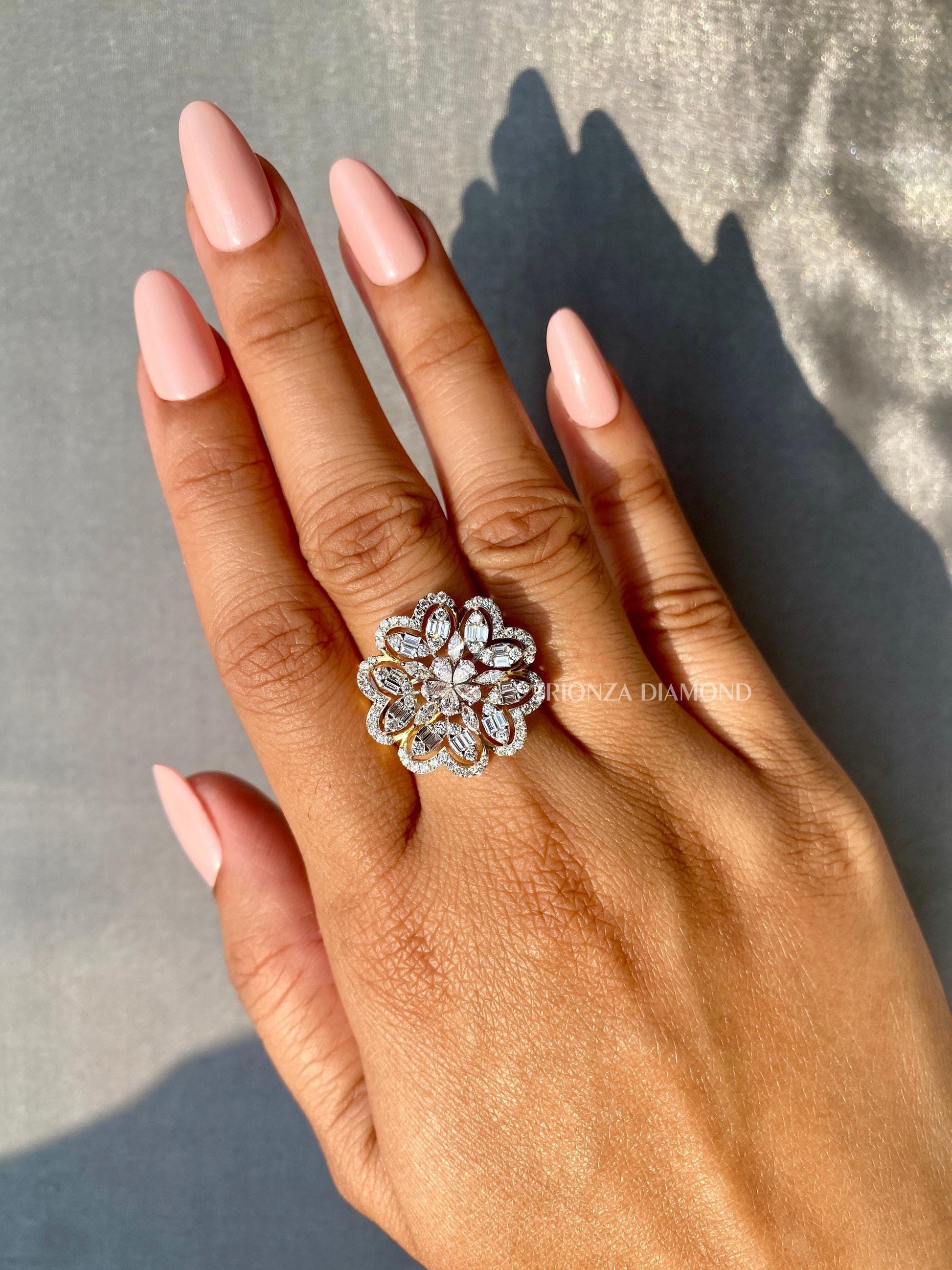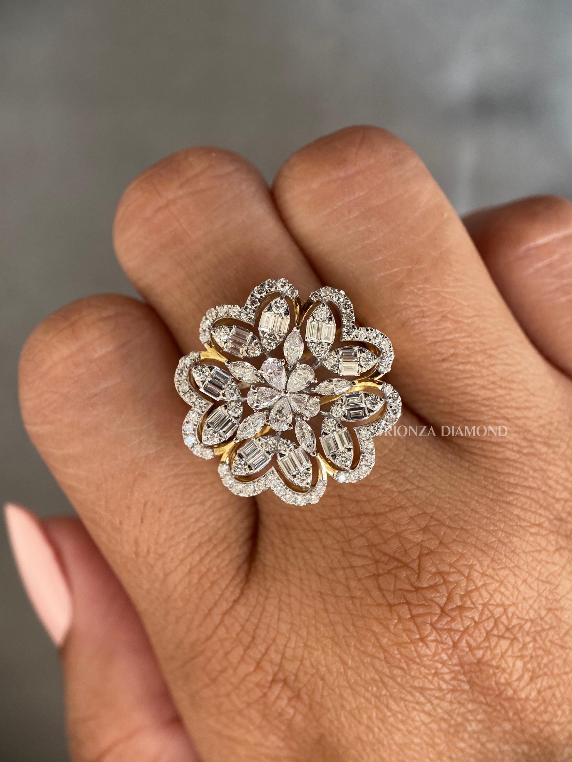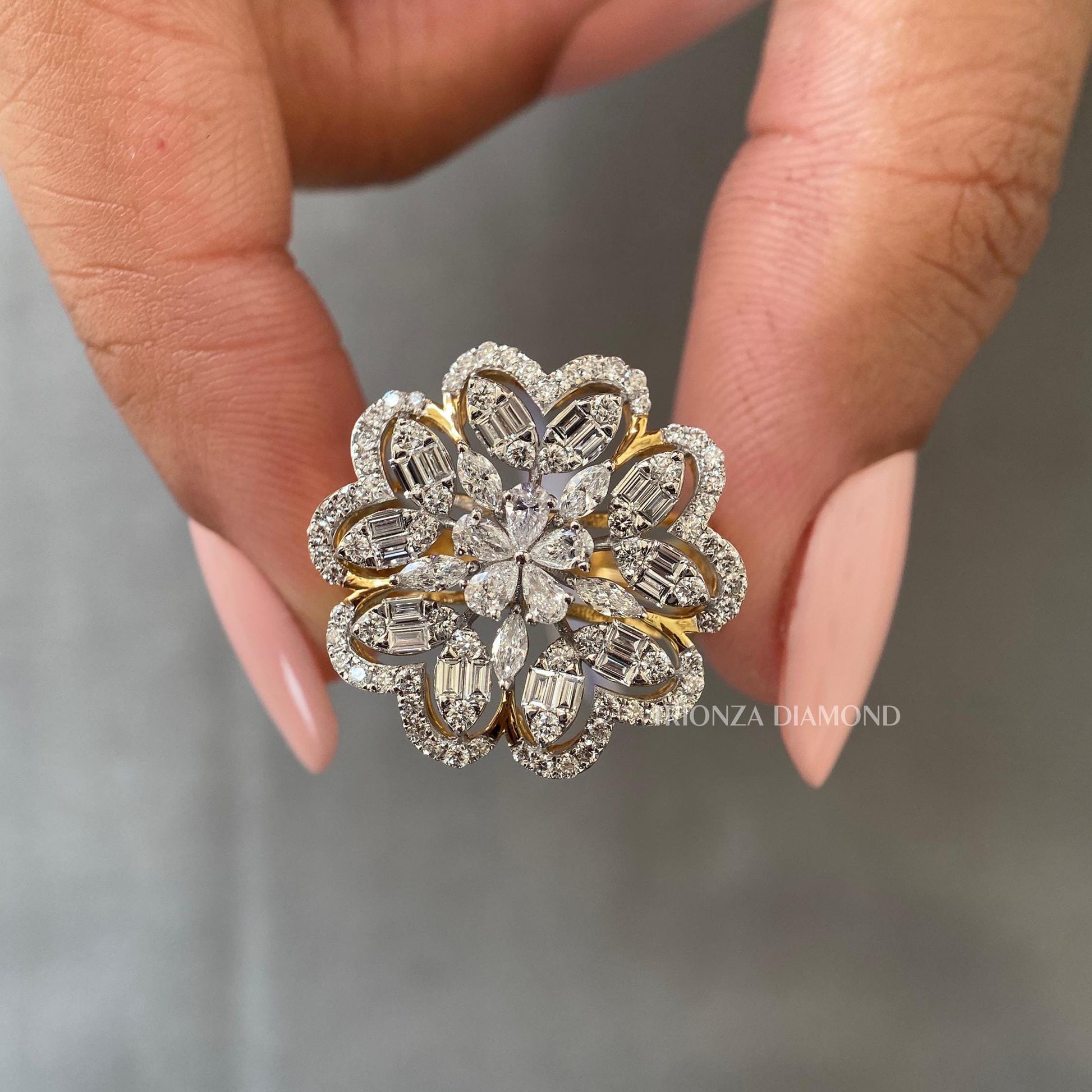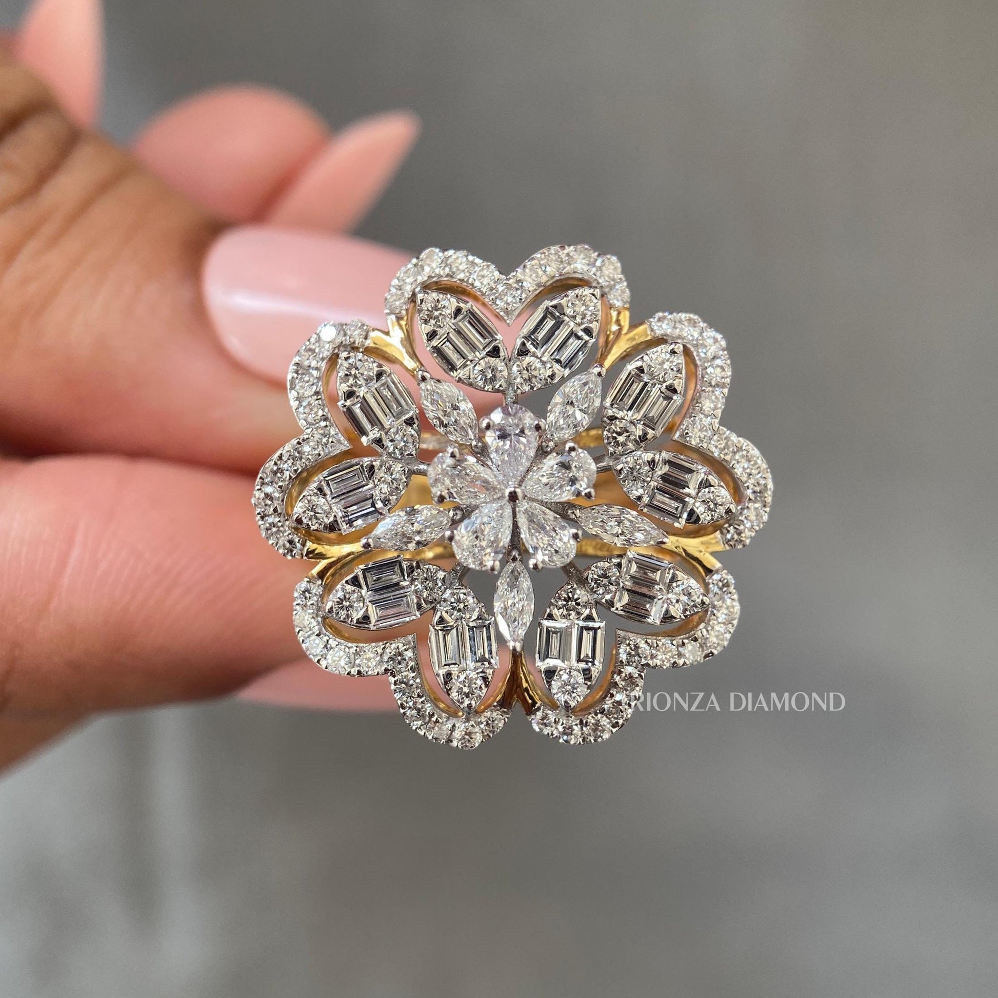 Celebrate your love with our exquisite Floral Design Lab Grown Diamond Wedding Ring, featuring stunning Marquise and Pear cut diamonds with a total of 4 TCW. This IGI Certified designer ring is the perfect anniversary or birthday gift for her, offering an eco-friendly and conflict-free alternative to natural diamonds.
