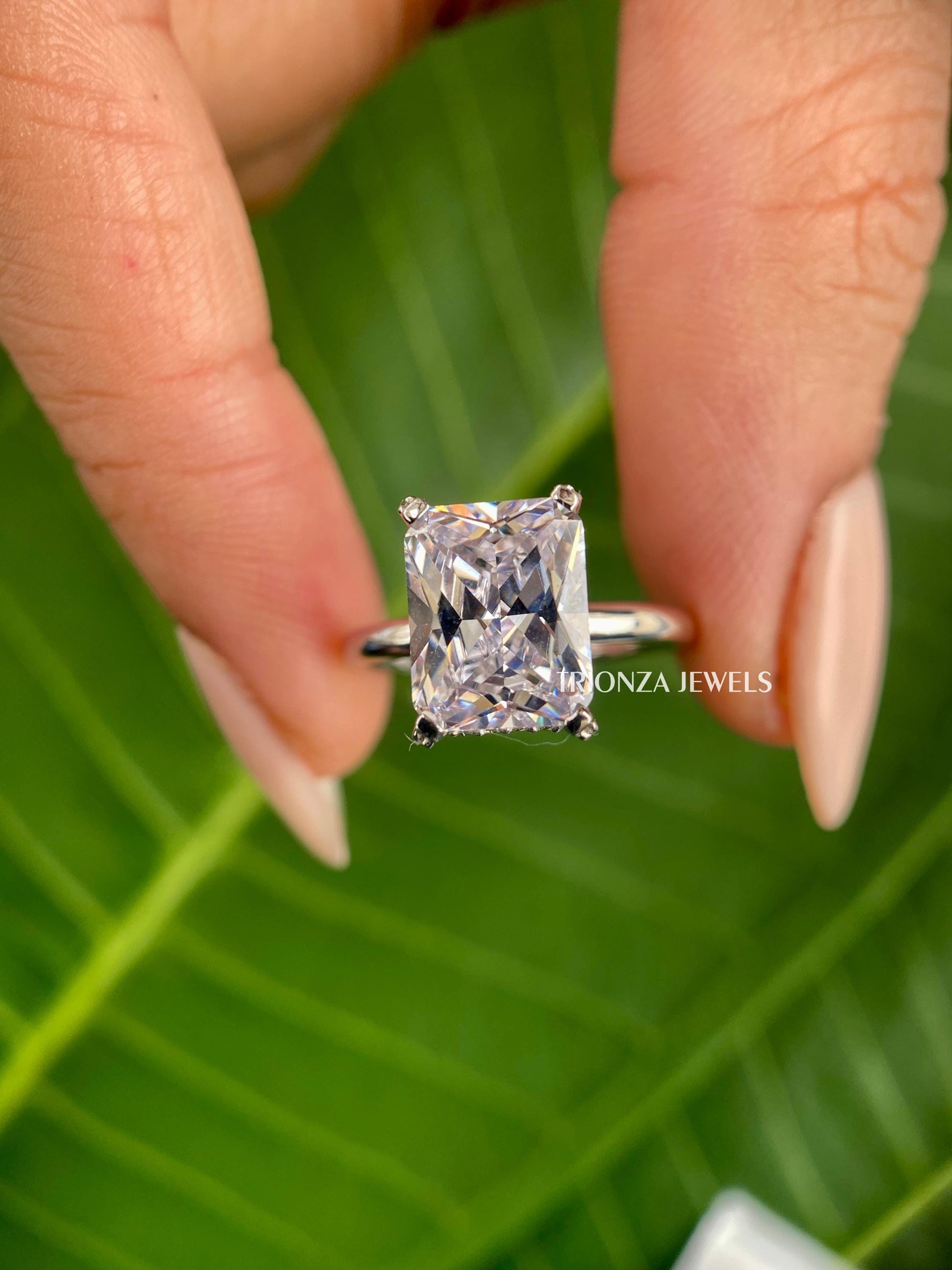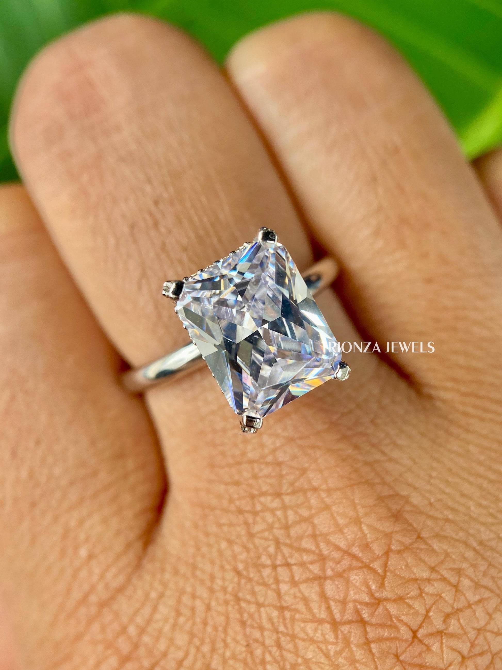 Discover our stunning 4CT Radiant Moissanite Solitaire Engagement Ring, featuring a captivating colorless hidden halo. This exquisite piece serves as an ideal promise ring, anniversary gift, or birthday surprise, crafted from 14K solid gold. It's also available in silver for a timeless look.