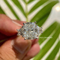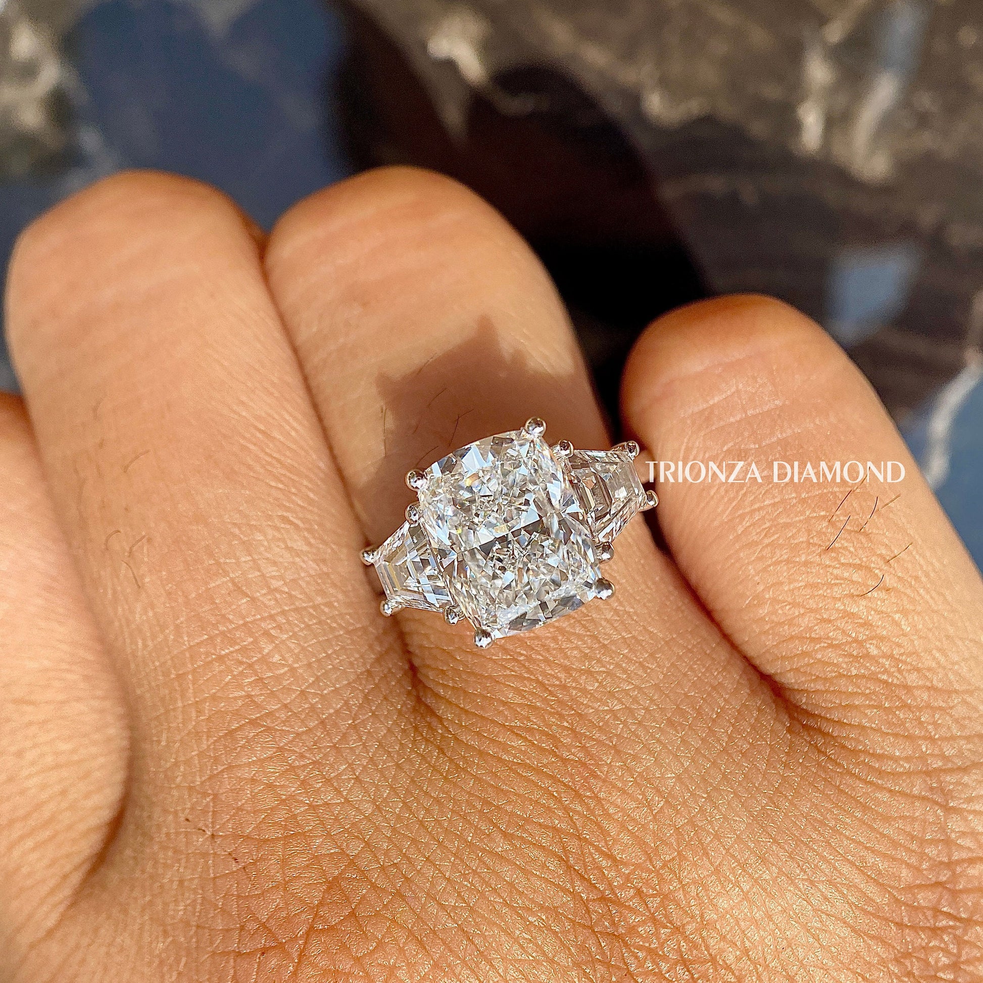 Discover our exquisite Two-Tone Cushion Cut Lab Grown Diamond Engagement Ring, featuring a stunning 5 carat IGI Certified E Color VVS2 Clarity center stone. This three-stone ring is beautifully accented with side trapezoid diamonds and a comfortable fit band. TRIONZADIAMOND offers eco-friendly, conflict-free diamonds, handcrafted with love.