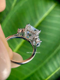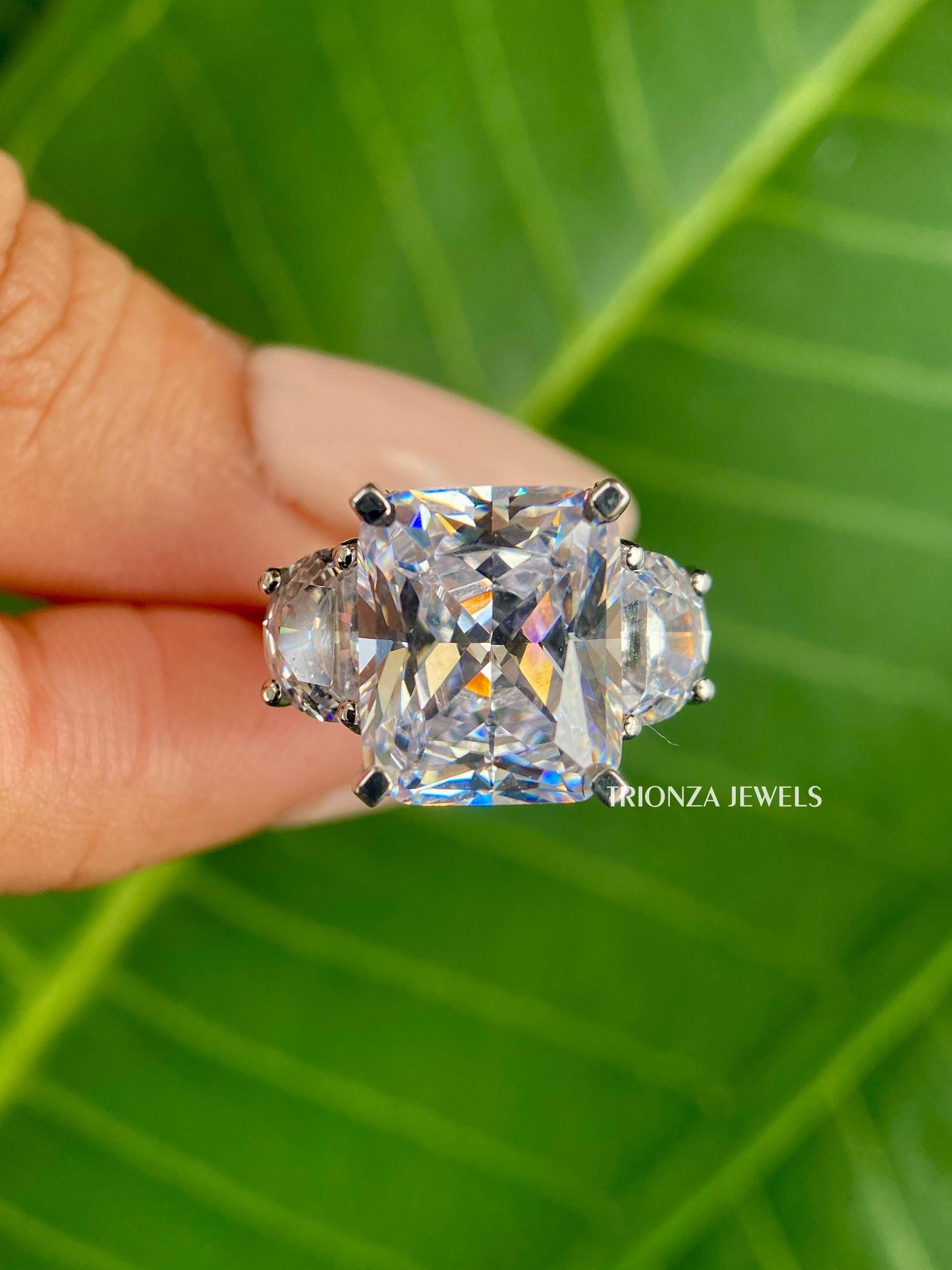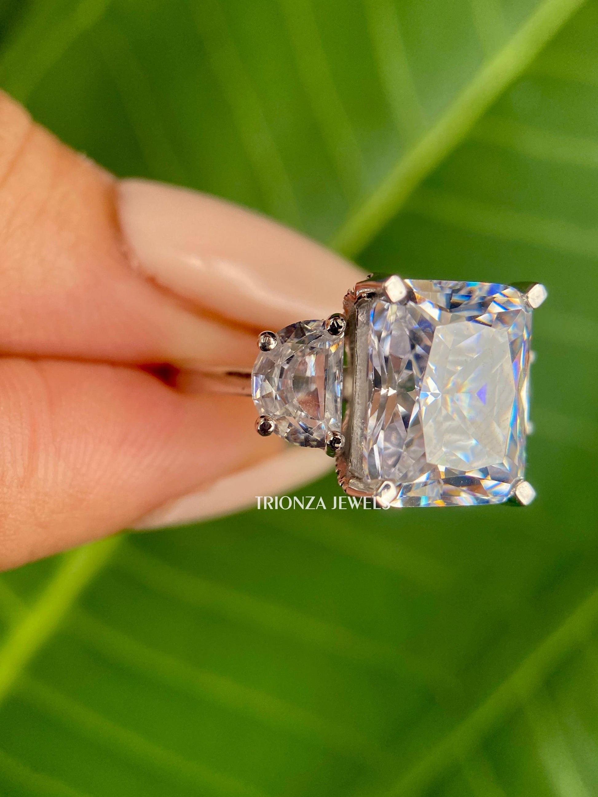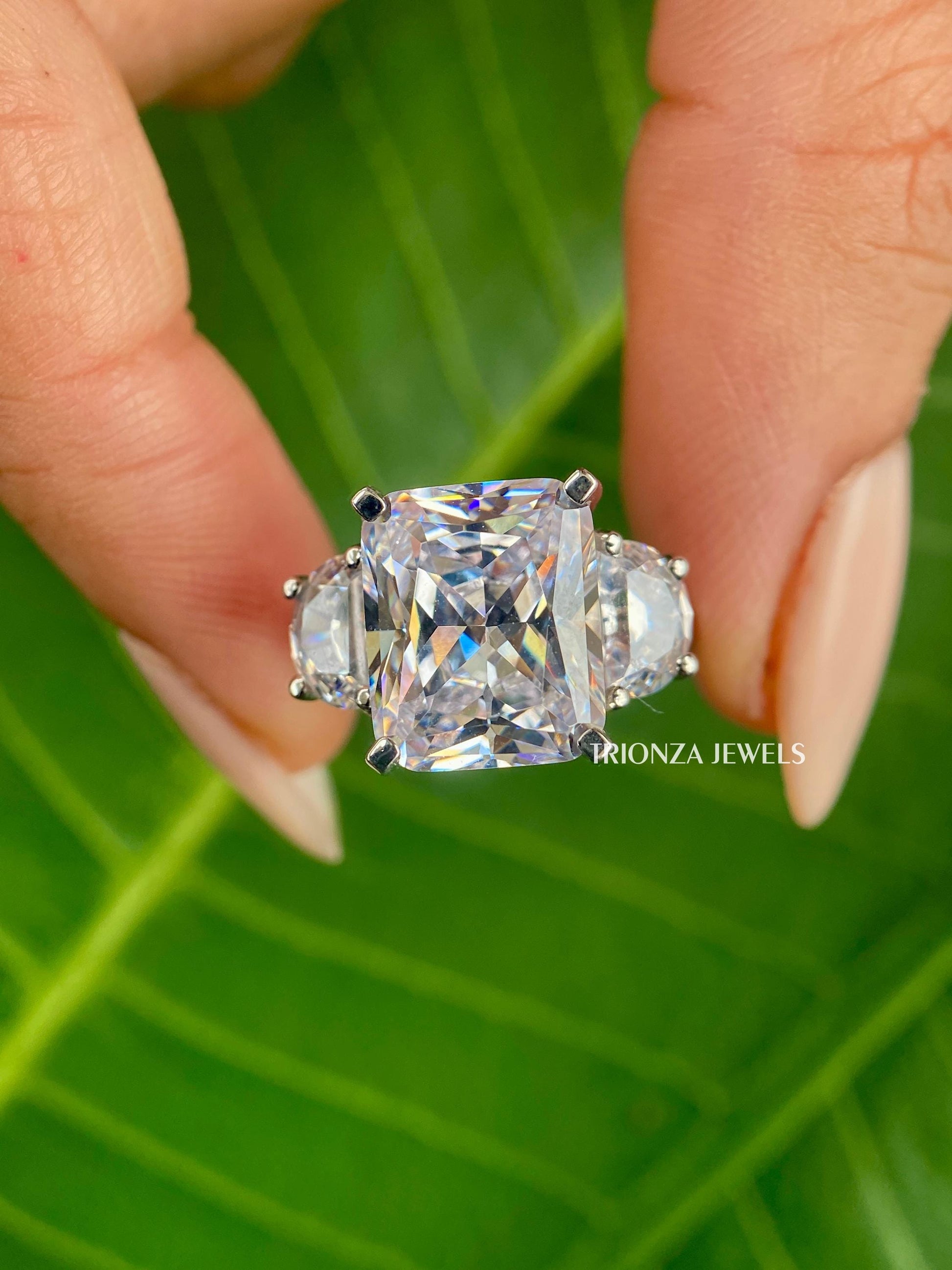 Discover this stunning 7.10 TCW Ice Crushed Radiant Cut Moissanite Three Stone Engagement Ring, featuring elegant Half Moon cut side stones. Perfect for proposals, weddings, or anniversaries, this ring is available in 14k Solid Gold and comes with options for a matching band. A delicate and dainty choice for her.