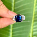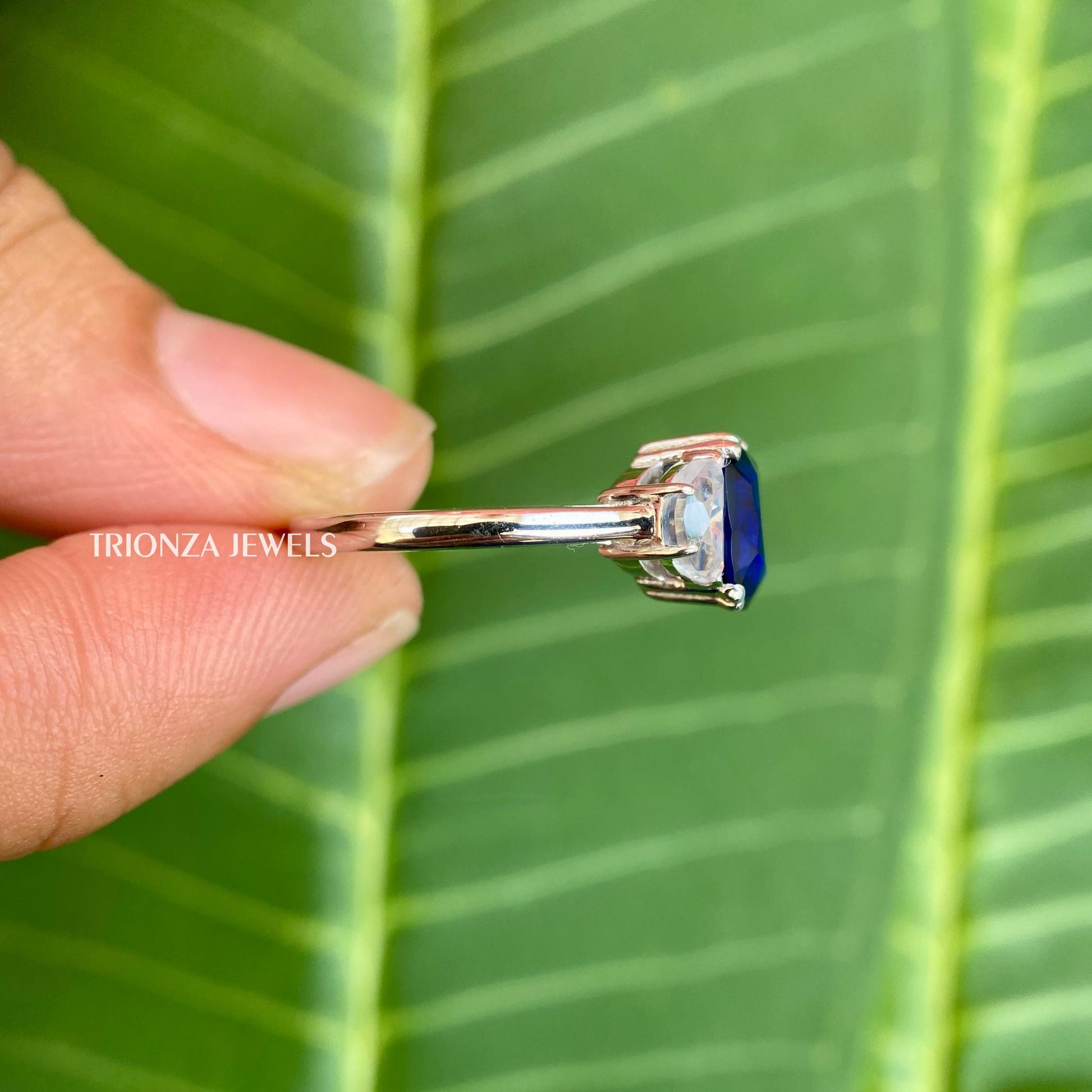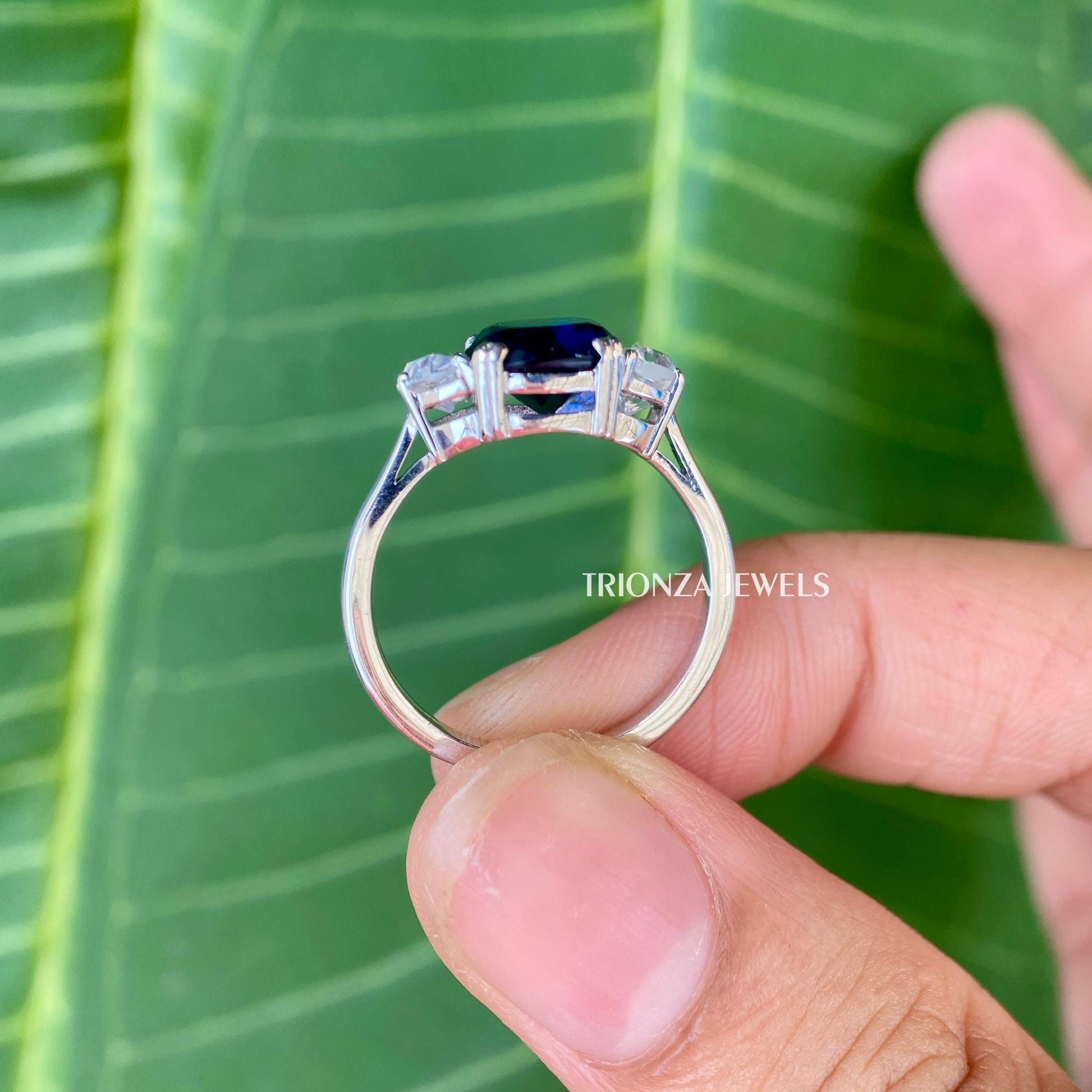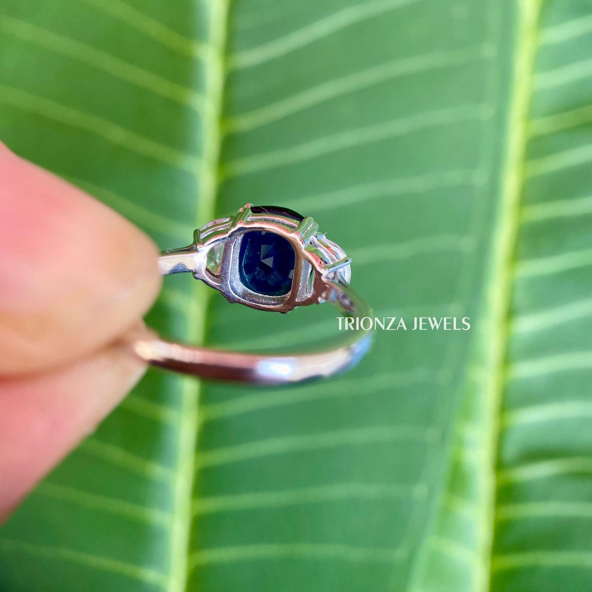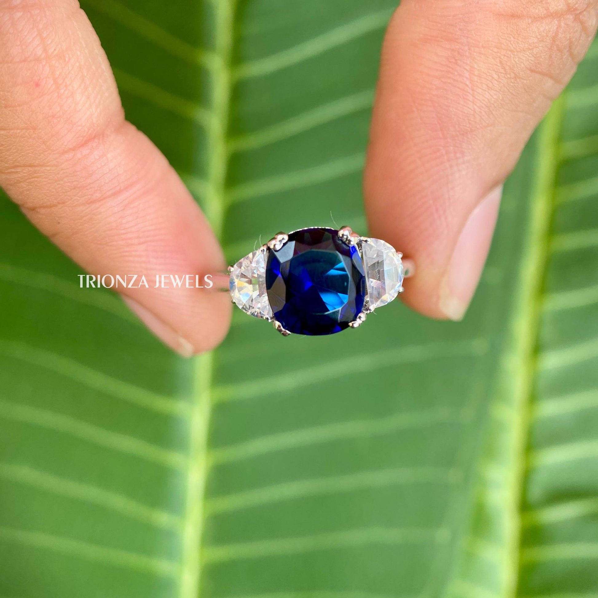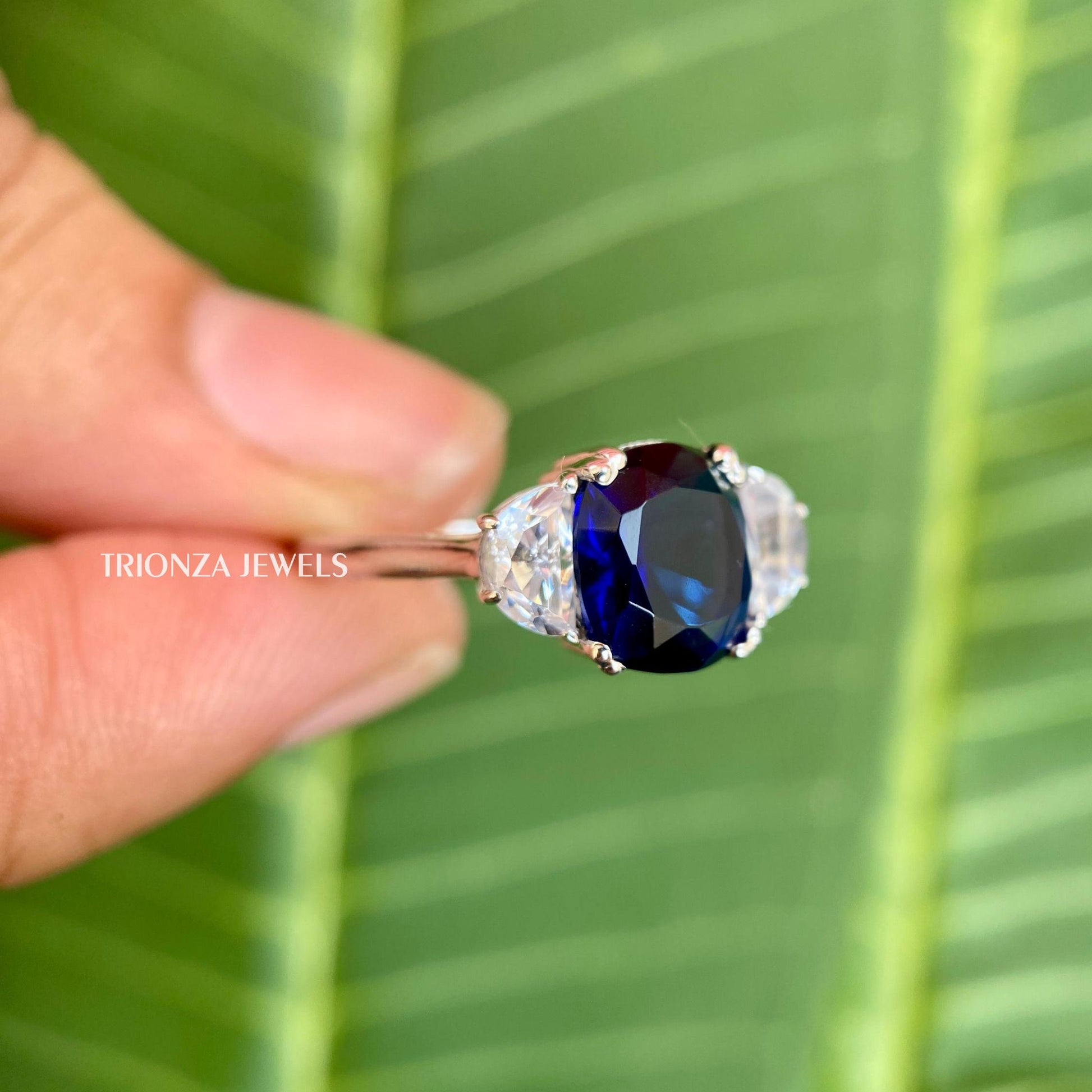 Blue Cushion Moissanite Three Stone Ring | Half Moon Diamond | Gift Her