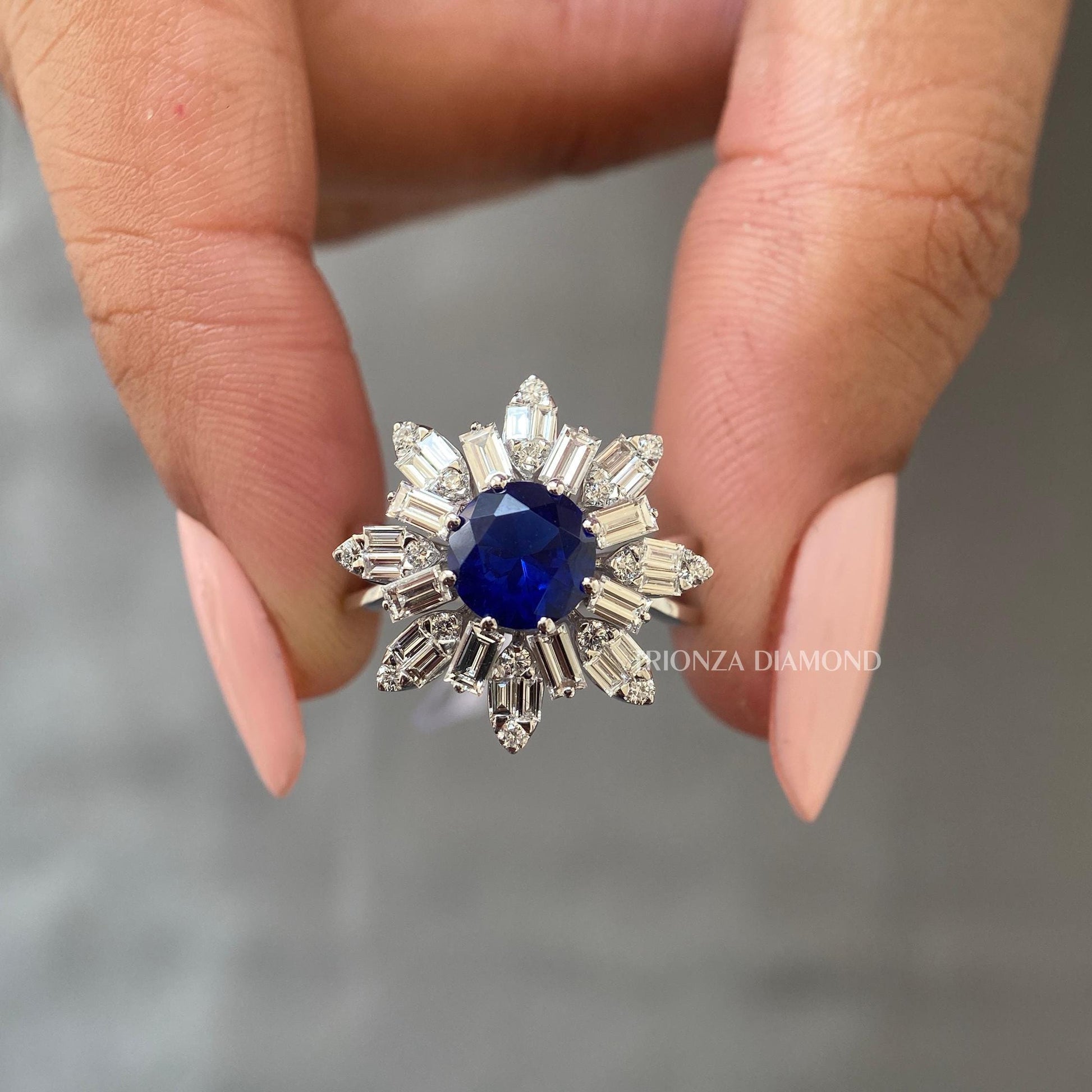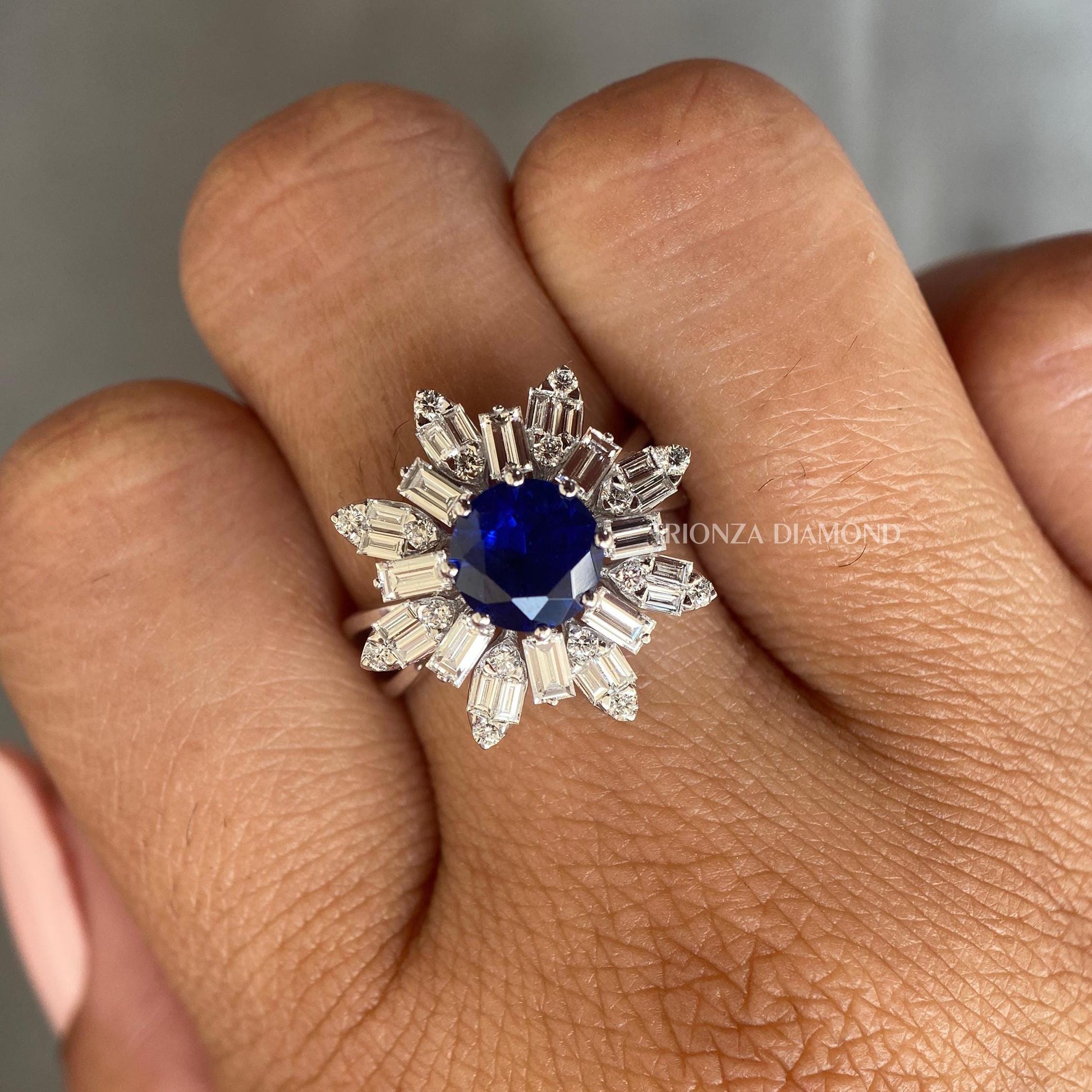 - Shapes: Round & Baguette Cut (IGI/GIA Certified Natural Mined Diamonds), Blue Round Cut (Moissanite)