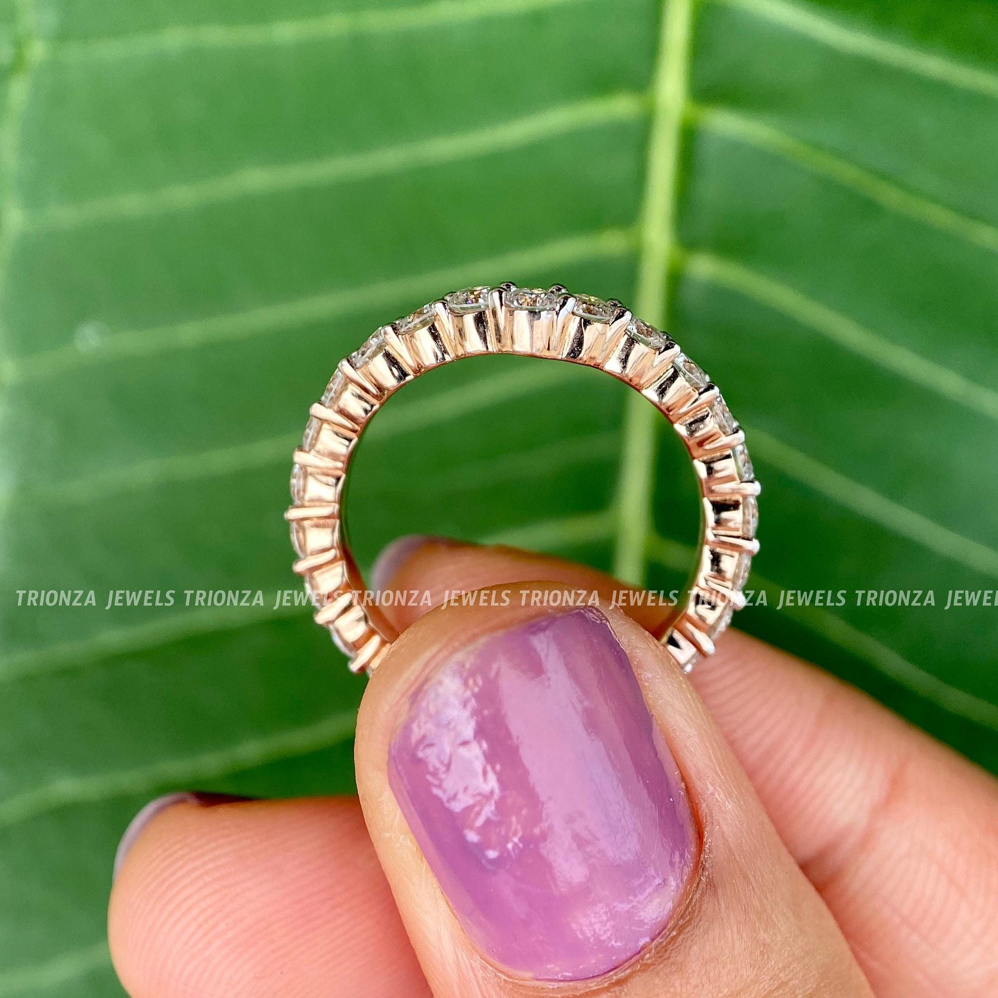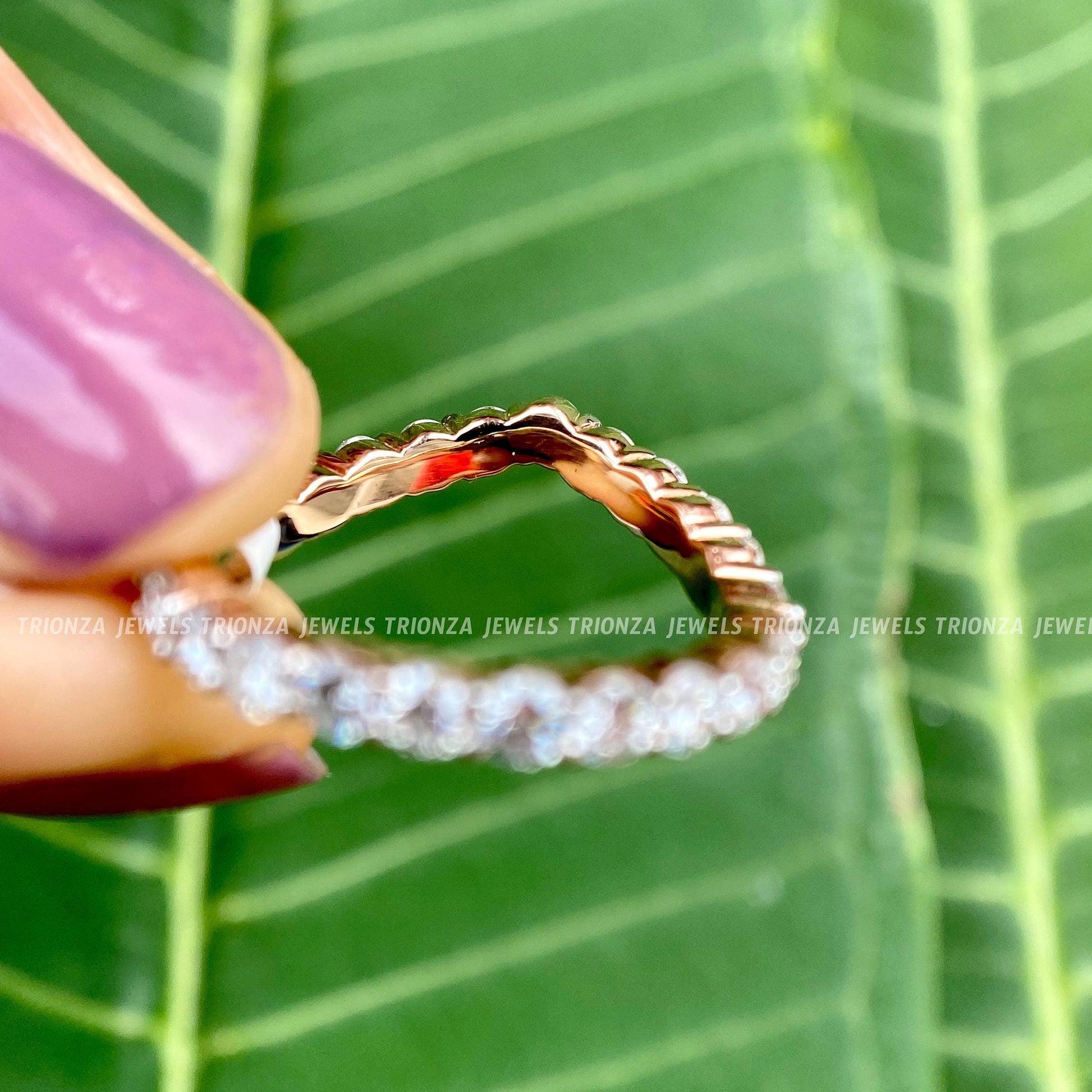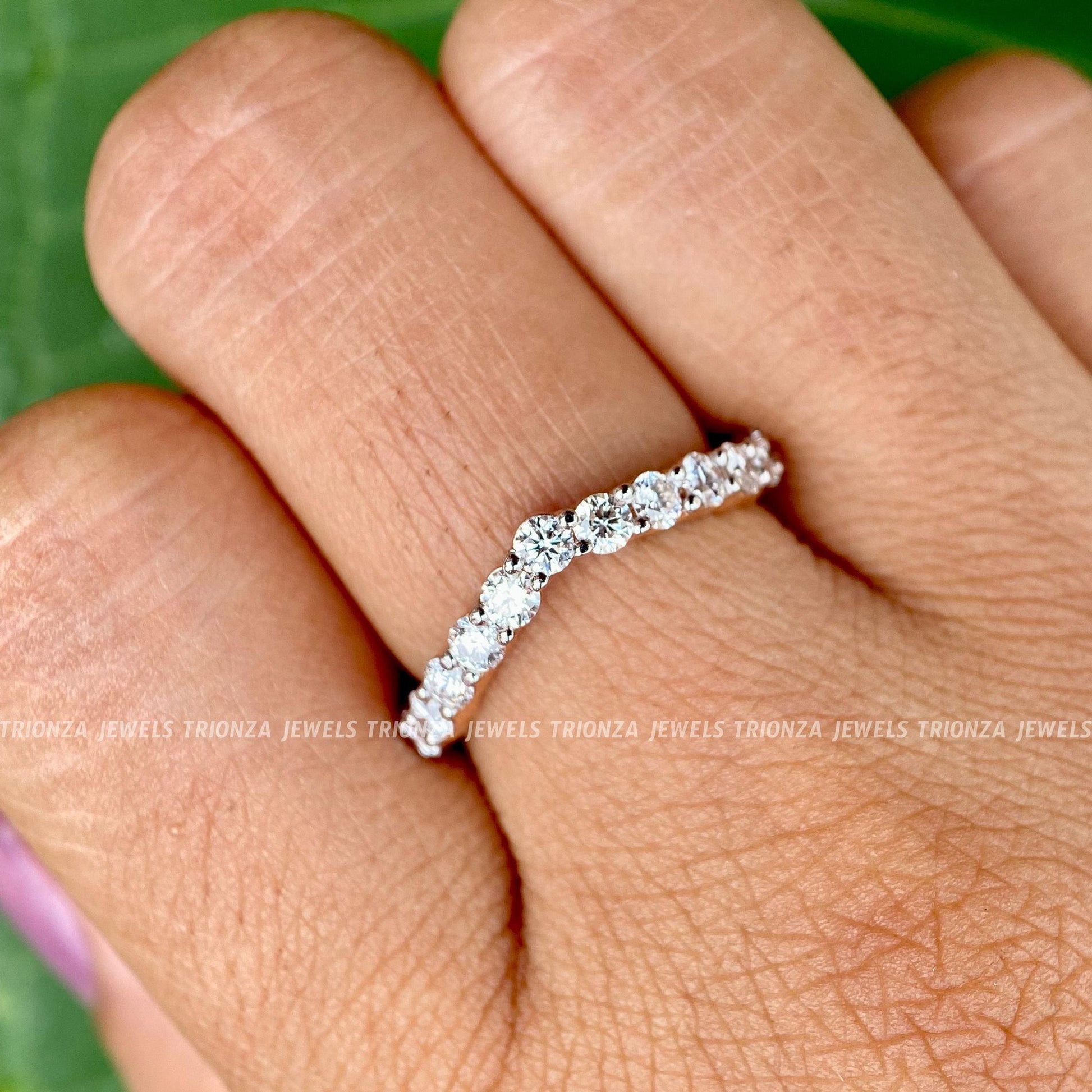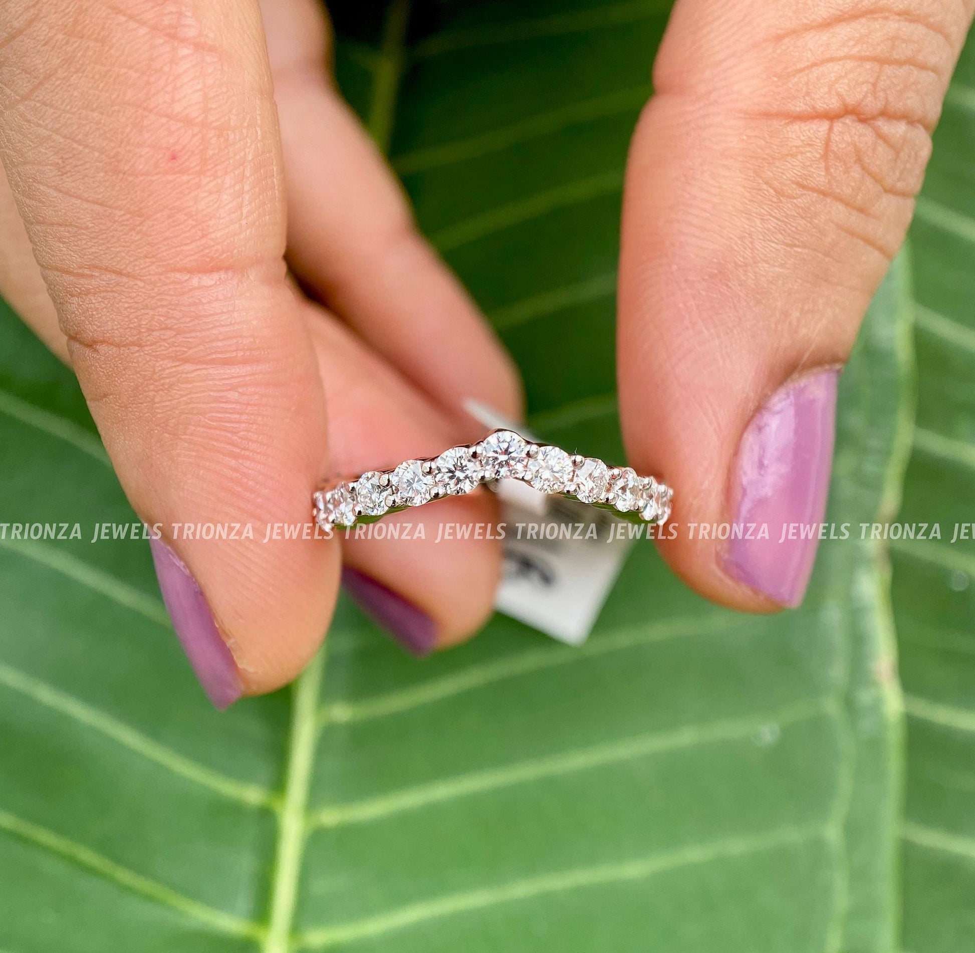 Celebrate your love with this exquisite Dainty Curved Moissanite Engagement Band. Featuring a 0.90 TCW round full eternity design, this stackable band is a perfect anniversary gift, bridal set addition, or a thoughtful present for her.