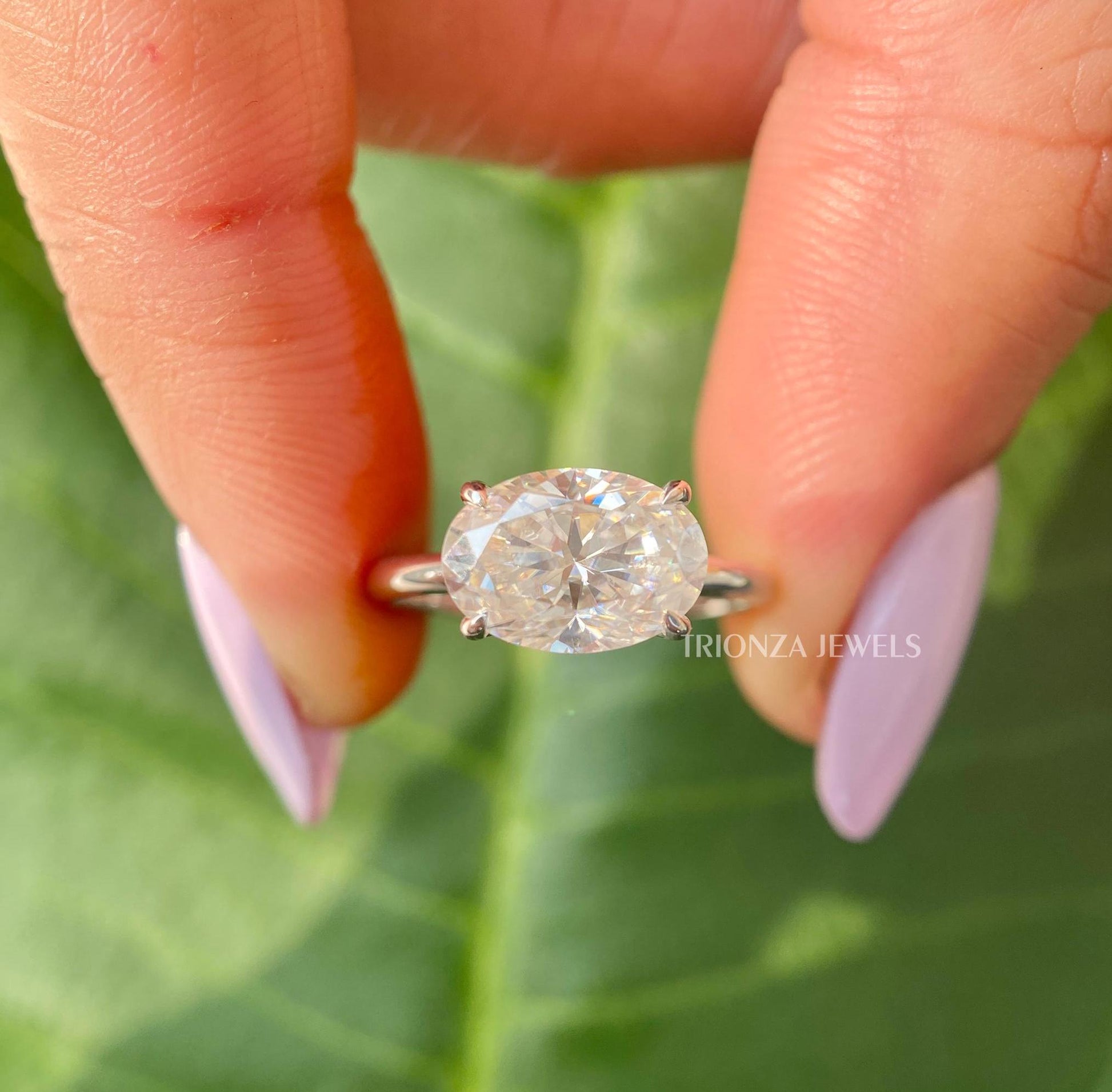 Discover the stunning East-West Oval Moissanite Engagement Ring by TRIONZA JEWELS. This exquisite two-tone solitaire ring is perfect for engagements, weddings, anniversaries, or as a special gift. Our moissanite diamonds are conflict-free, eco-friendly, and ethically sourced, offering brilliant sparkle with a clear conscience.