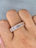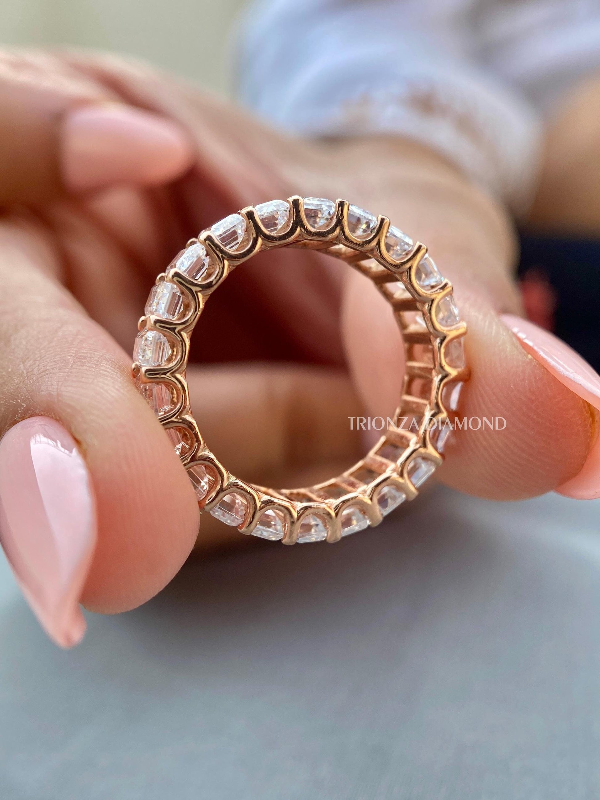 This elegant Emerald Cut Lab Grown Diamond Eternity Band features U-Prong settings in warm rose gold. A stackable full eternity ring, it's perfect as a bridal wedding band or a sophisticated anniversary ring, offering modern elegance and timeless appeal.
