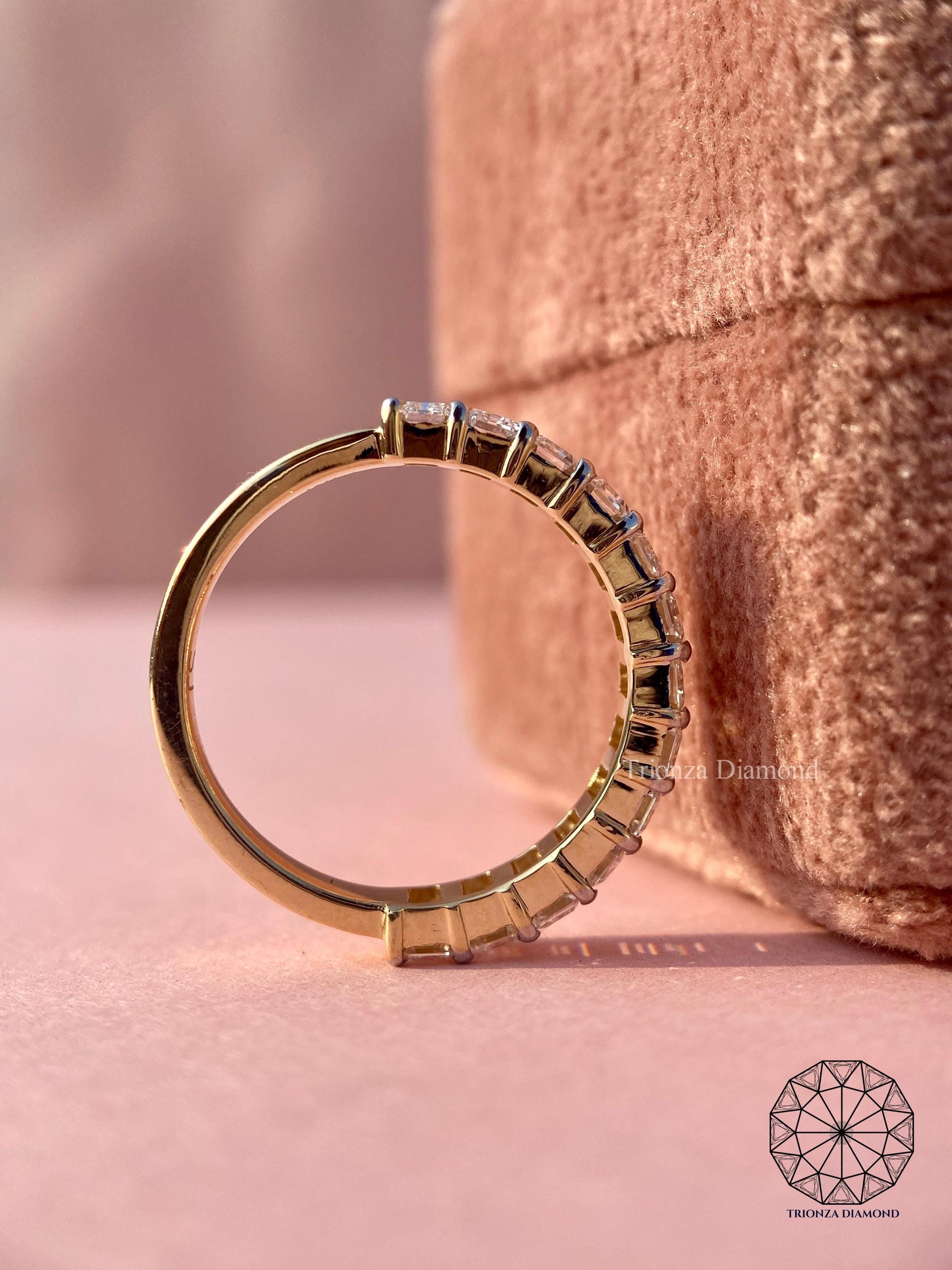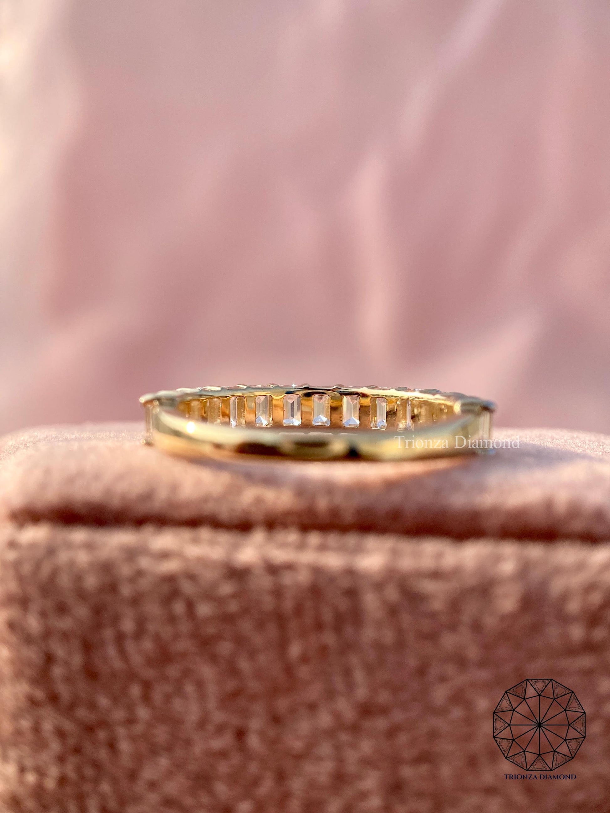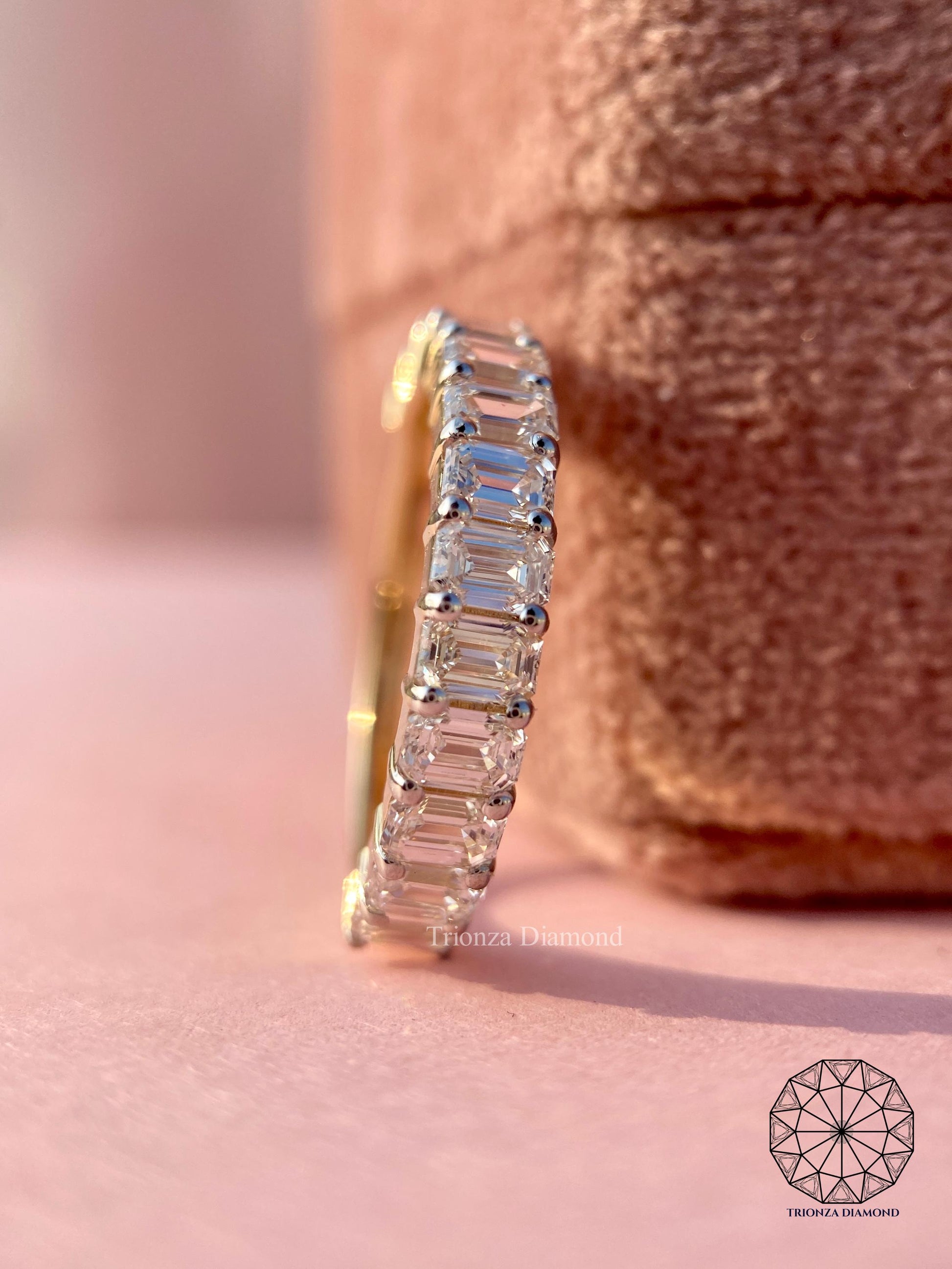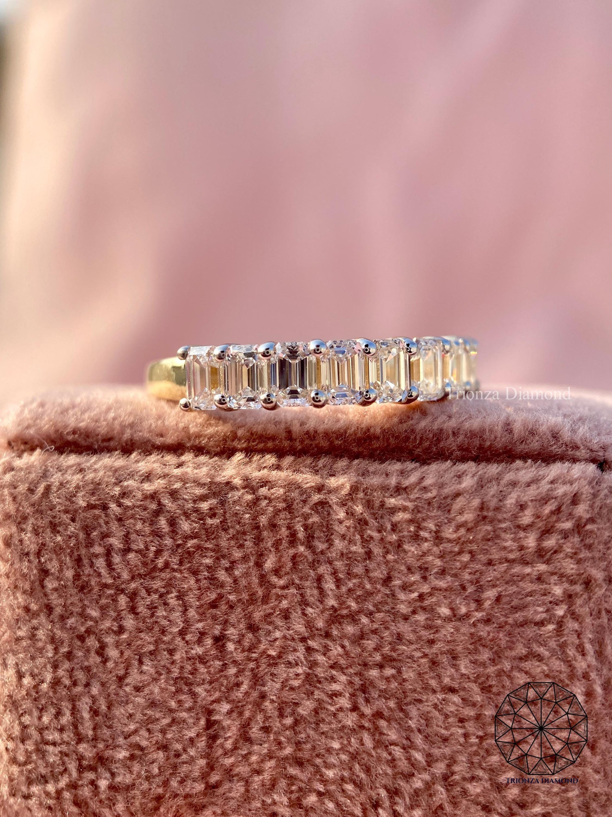 This dazzling Emerald Cut Lab Grown Diamond Half Eternity Band is perfect for everyday wear or as part of a bridal set. It pairs beautifully with solitaire rings or other stackable bands, offering comfort and luxury with its slender profile.