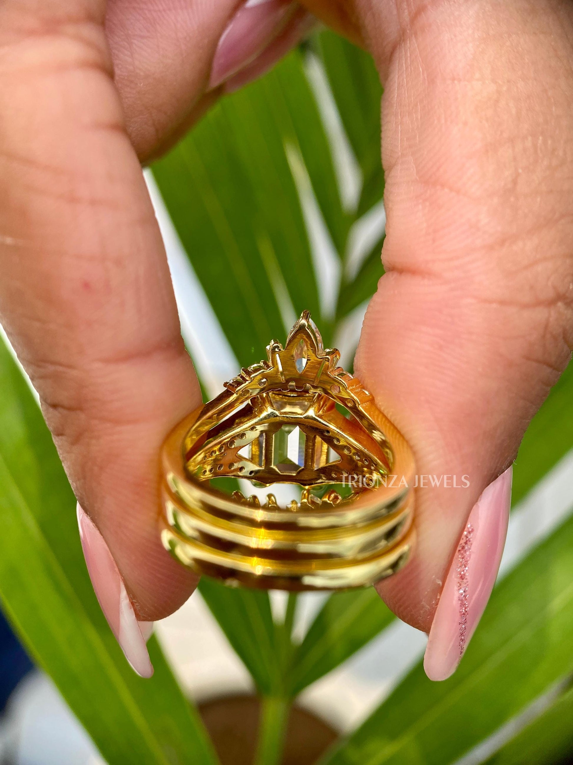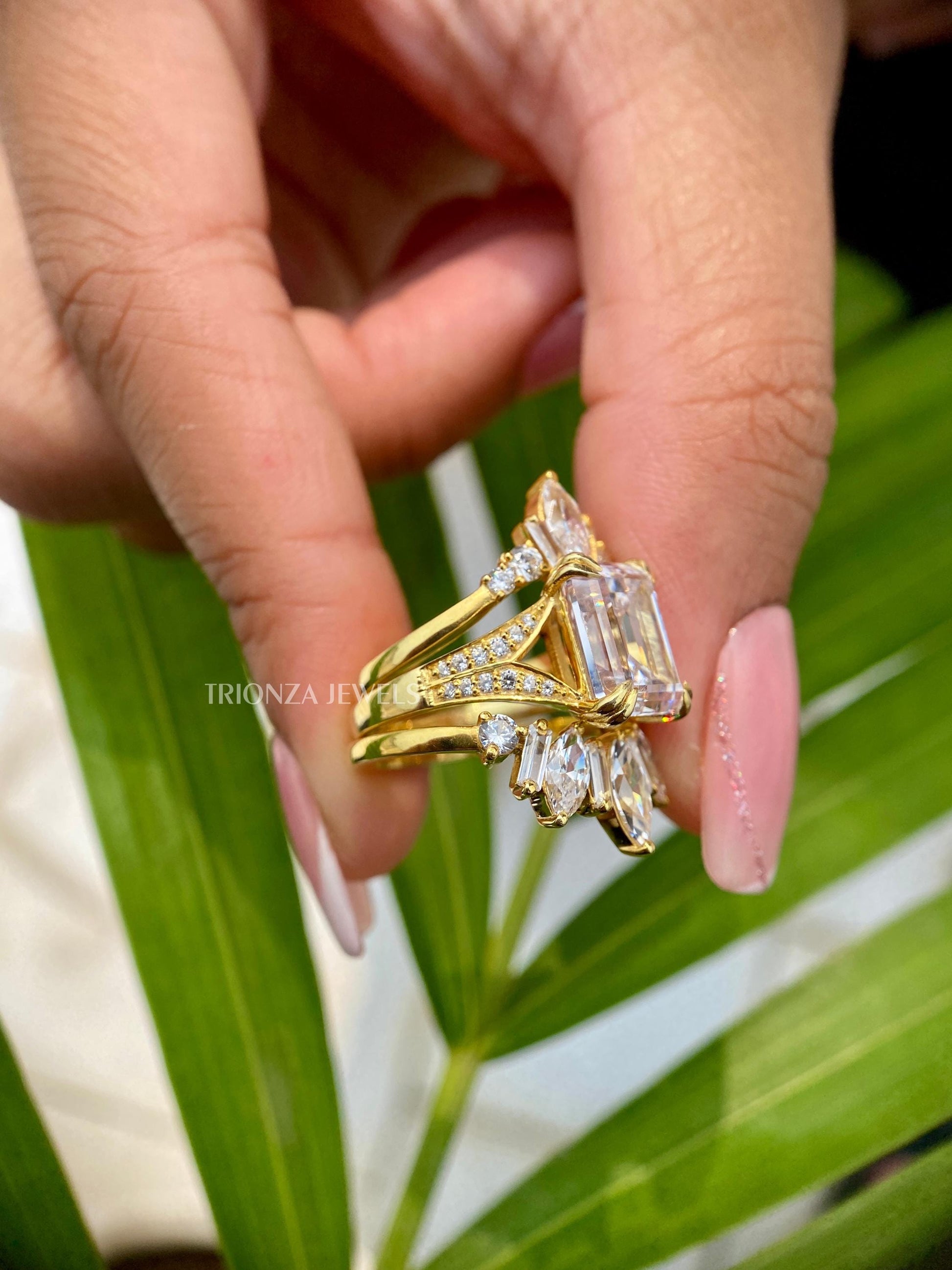 Elevate her special day with this stunning Emerald Cut Moissanite Bridal Set, meticulously crafted in 14K Gold. This exquisite 3 Carat set features a brilliant emerald cut moissanite, perfect as an engagement ring, wedding band, or a cherished anniversary gift.