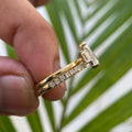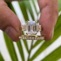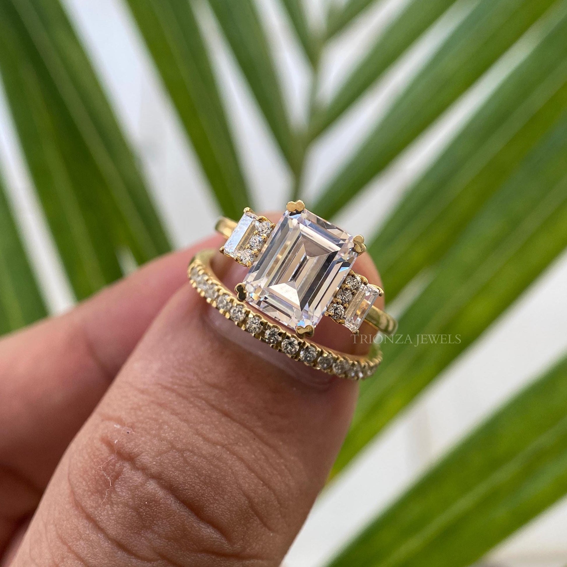 This stunning Emerald Cut Moissanite Diamond Bridal Set features a 2 ct Emerald Cut Moissanite Wedding Ring for her, complemented by a delicate Baguette Moissanite Ring. Perfect as an Anniversary Gift, Promise Ring, or a special handmade women's ring.
