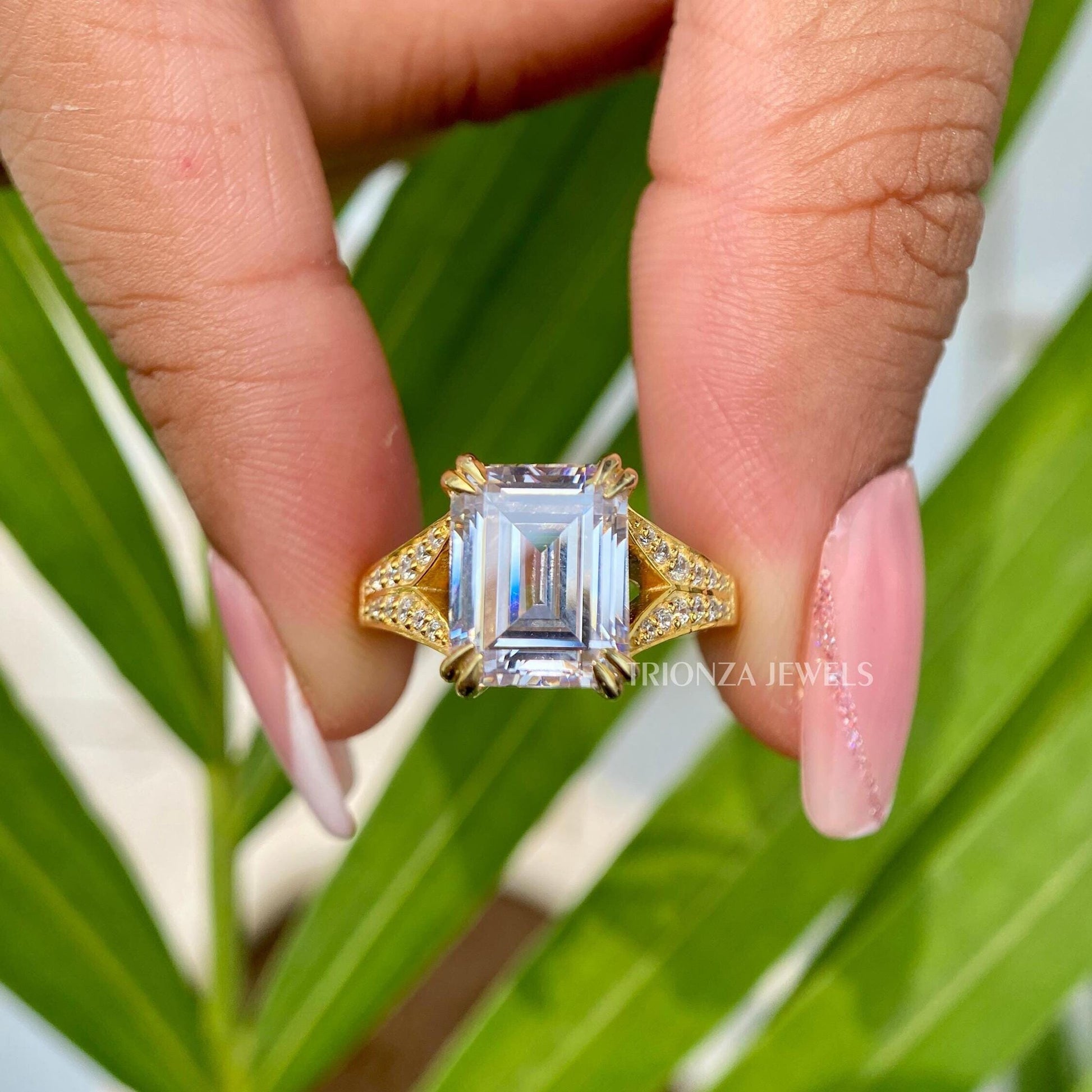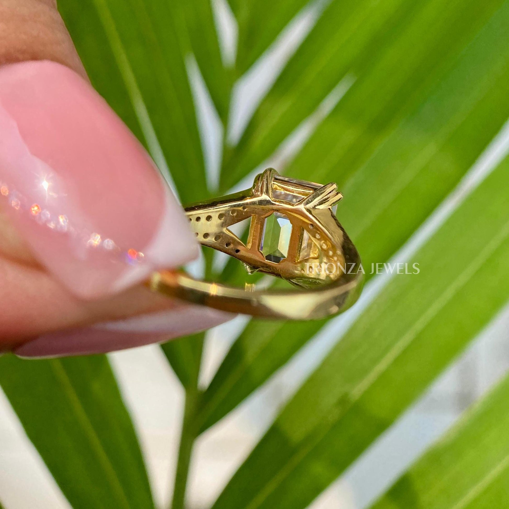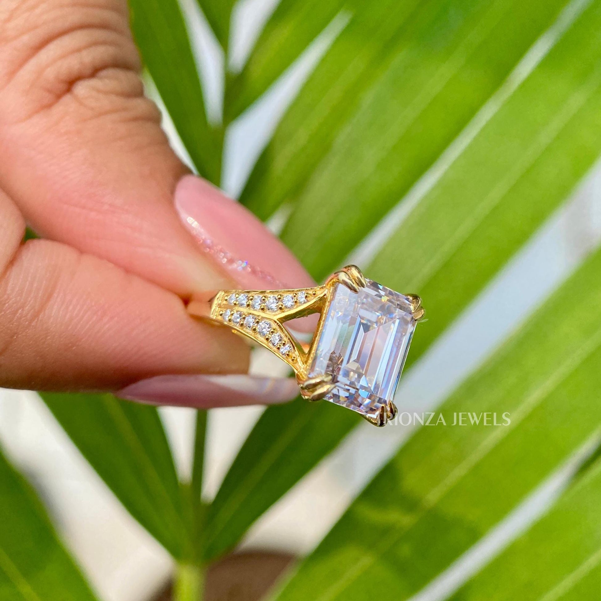 - Stone: Emerald Cut Moissanite