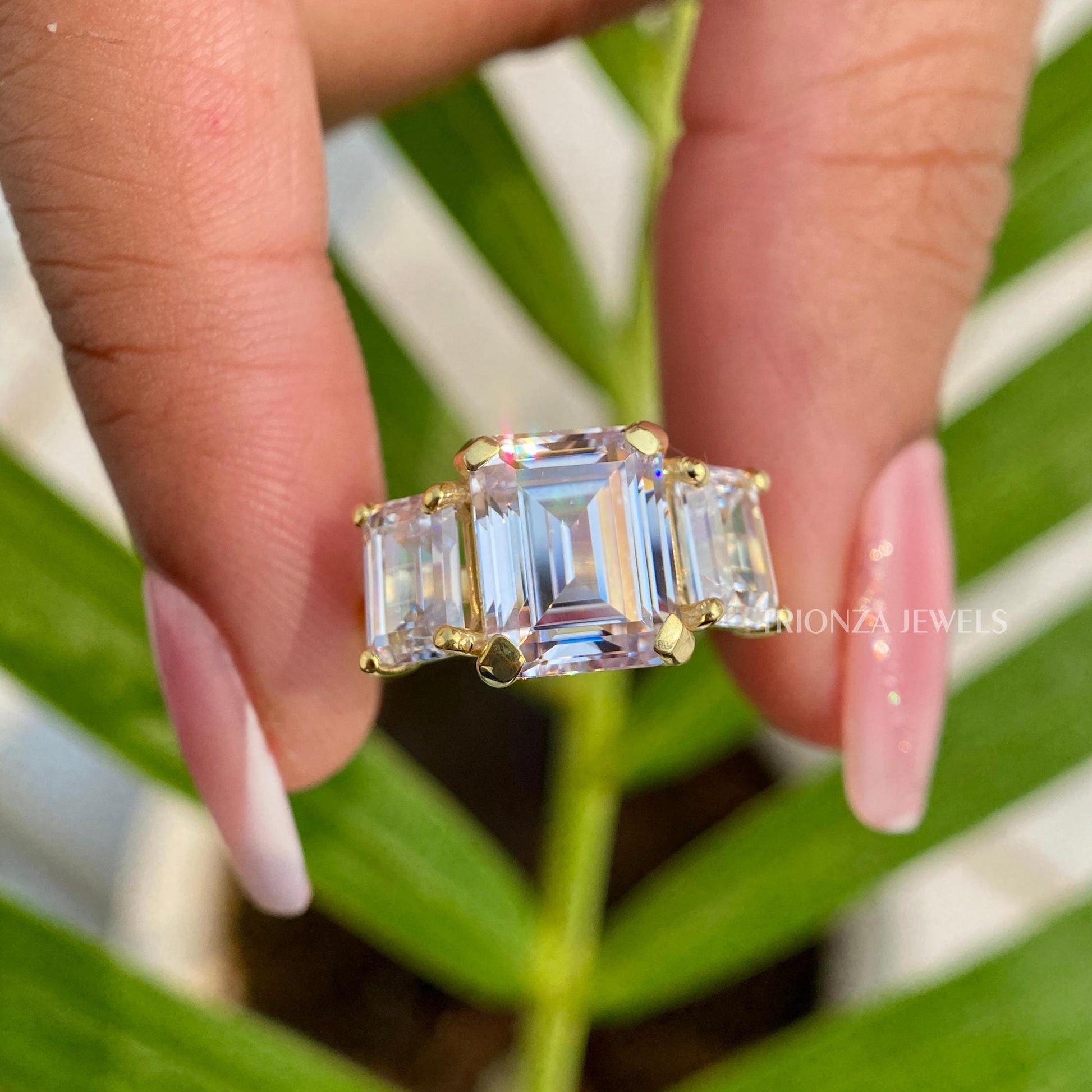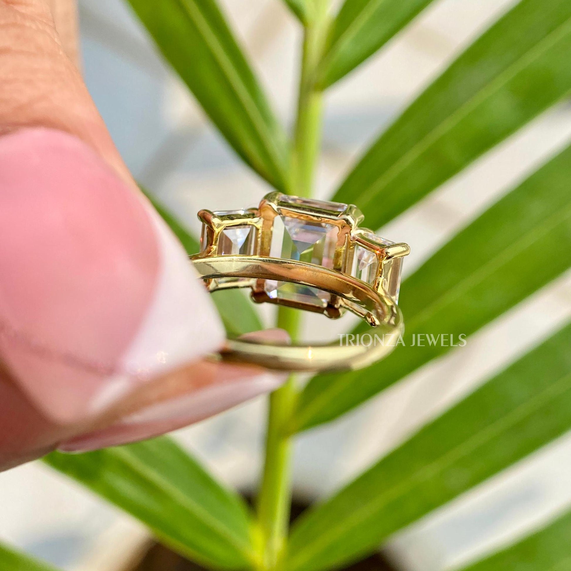 Discover our exquisite Emerald Cut Moissanite Three Stone Engagement Ring, a perfect symbol of love for weddings, anniversaries, or a special gift for your wife. Each ring is a handmade piece of fine jewelry, showcasing beautiful Moissanite stones known for their brilliance and ethical sourcing.