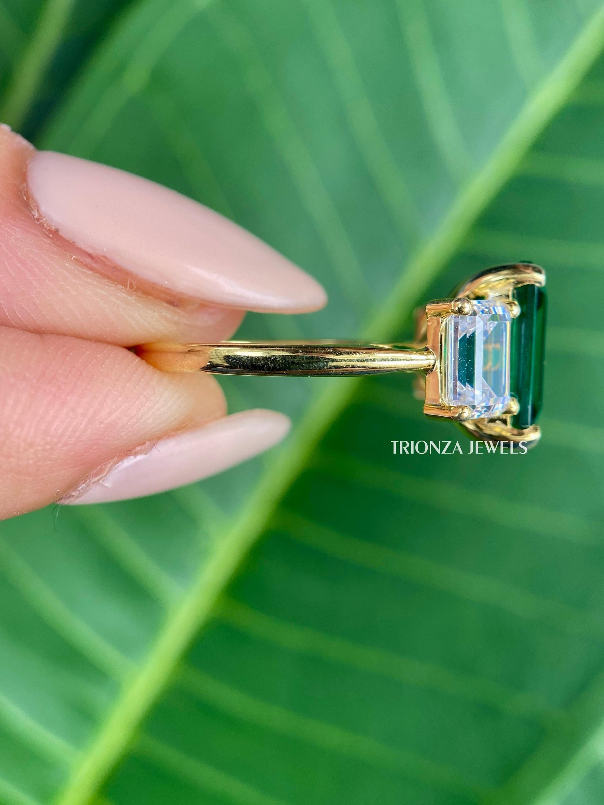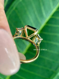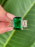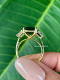 Discover our stunning Green Emerald Moissanite Three Stone Engagement Ring, featuring an impressive 8.02 Total Weight (TW). This exquisite ring showcases a radiant cut side stone, perfect for proposals, anniversaries, or a special gift for her.