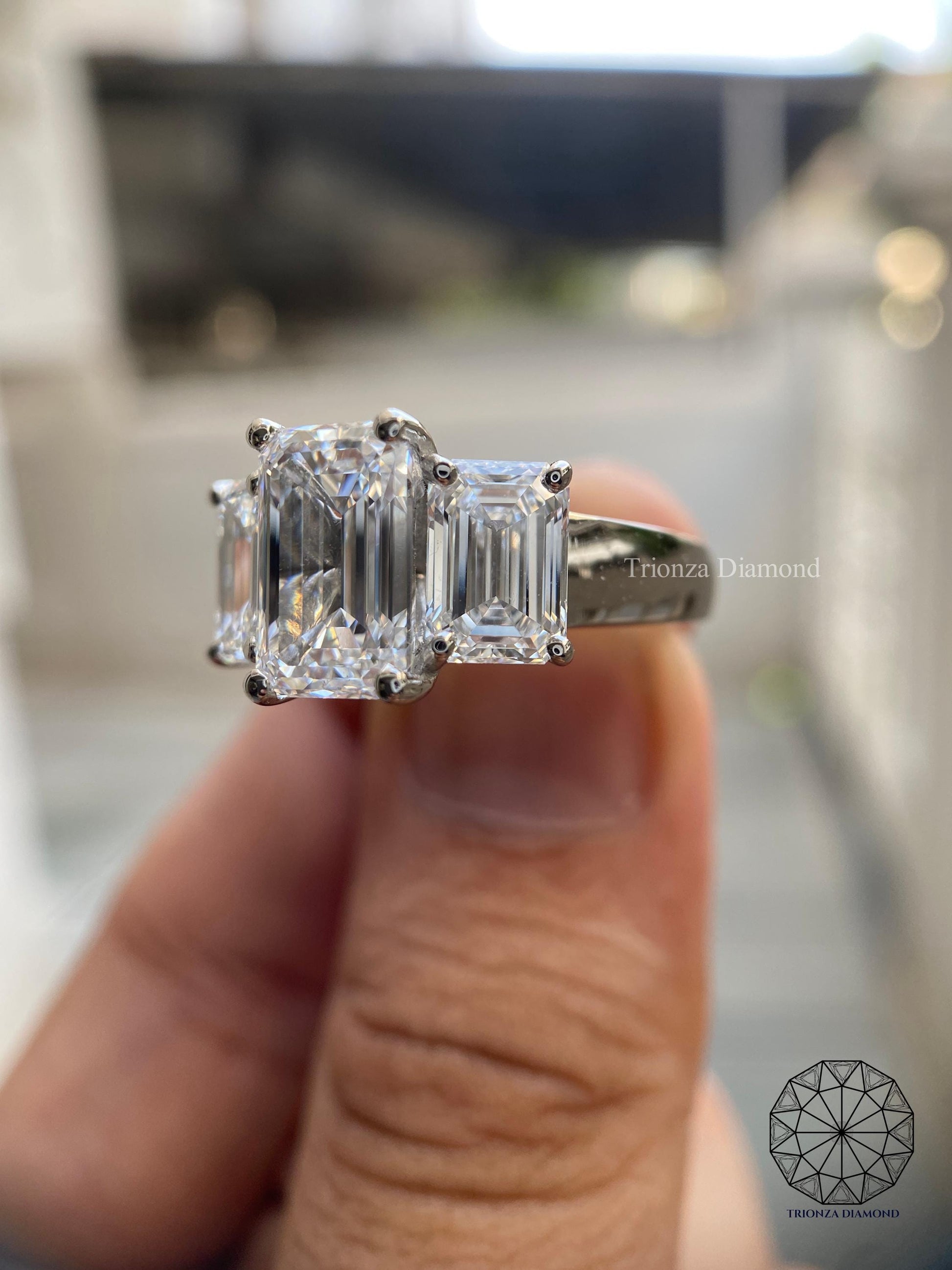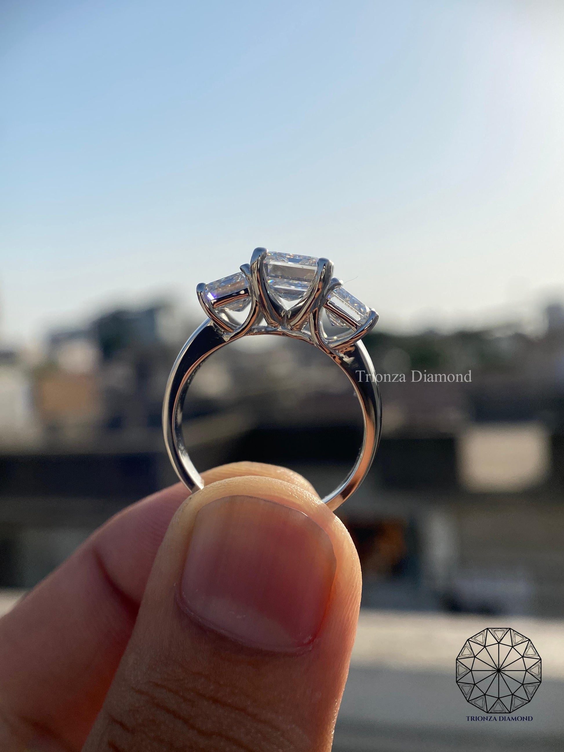 Presenting a stunning IGI Certified Lab Grown Diamond Emerald Three Stone Engagement Ring, meticulously crafted in 18k White Gold. This classic and traditional style ring features exceptional brilliance and ethical sourcing.