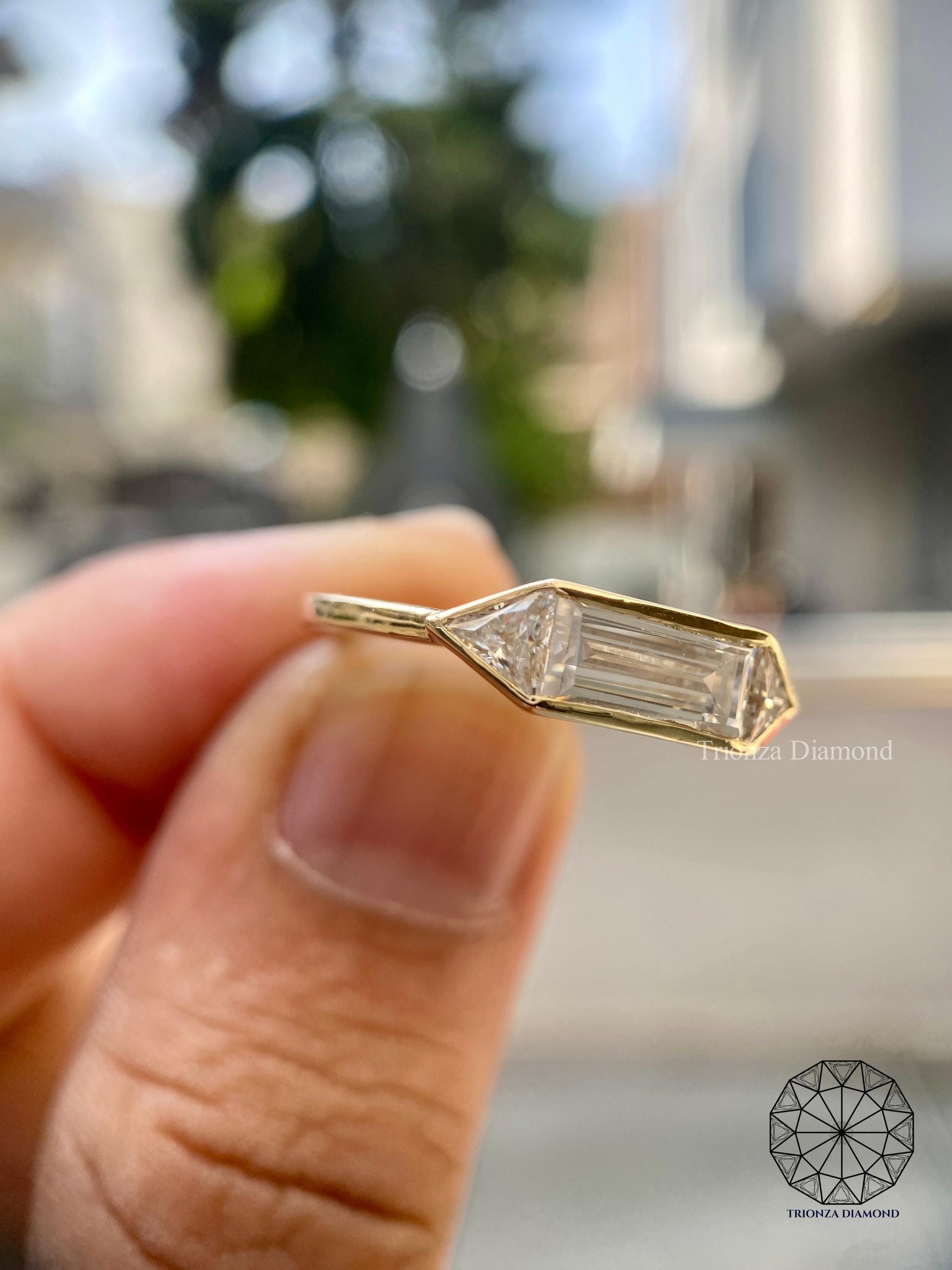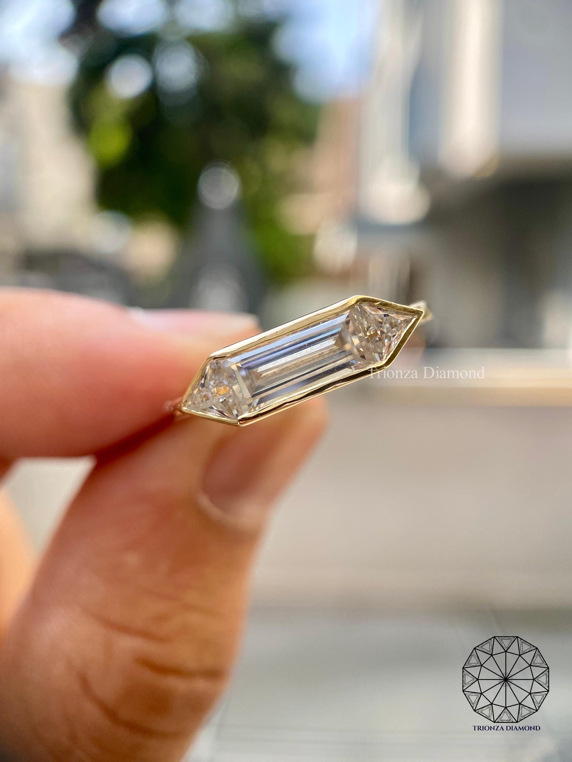 Elevate your style with our stunning F/VS1 East-West Baguette Lab Grown Diamond Ring, featuring elegant Triangle Side Stones. This IGI Certified Lab Diamond ring is expertly crafted in 14K Yellow Gold, making it a perfect choice for an engagement, wedding, or anniversary.