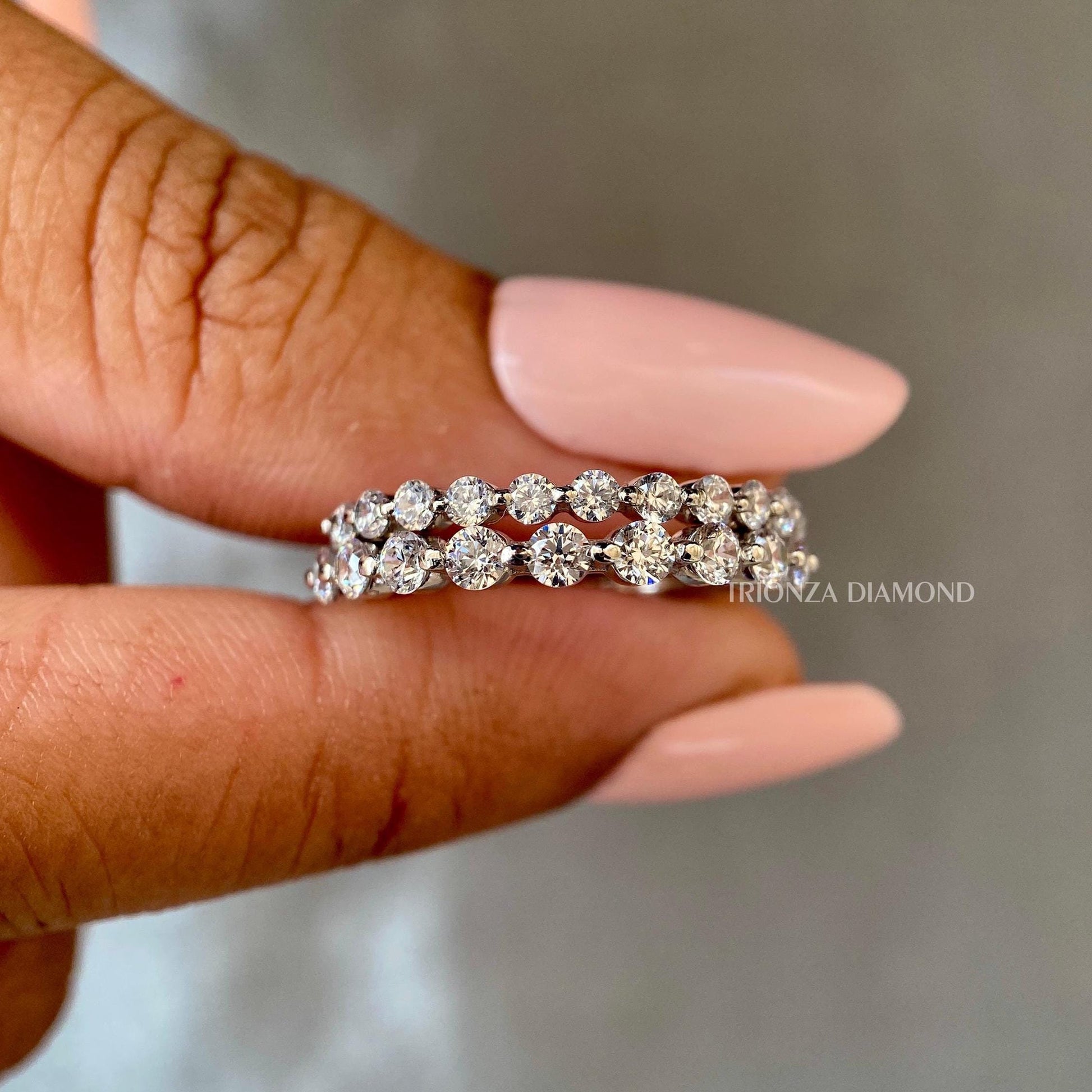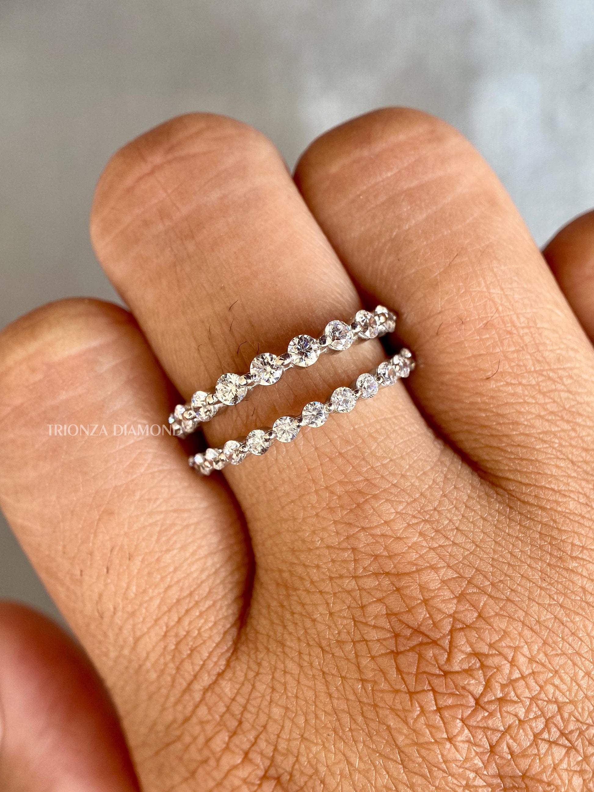 Discover our elegant 1.5 & 2.0 MM Floating Bubble Half Eternity Wedding Band, featuring dazzling round cut lab-created diamonds. This single prong diamond band makes a perfect matching engagement band for her, or a beautiful stackable wedding ring.