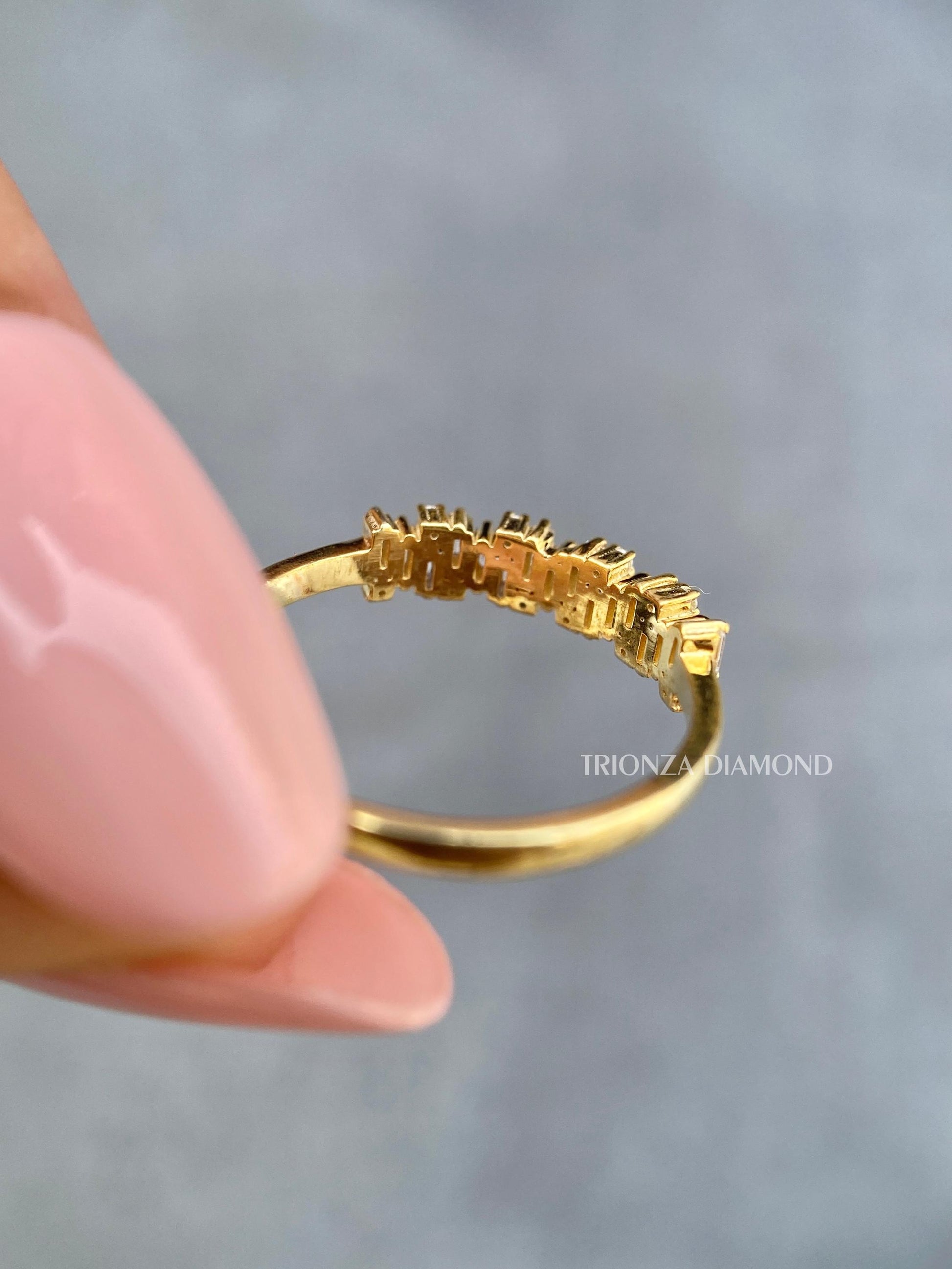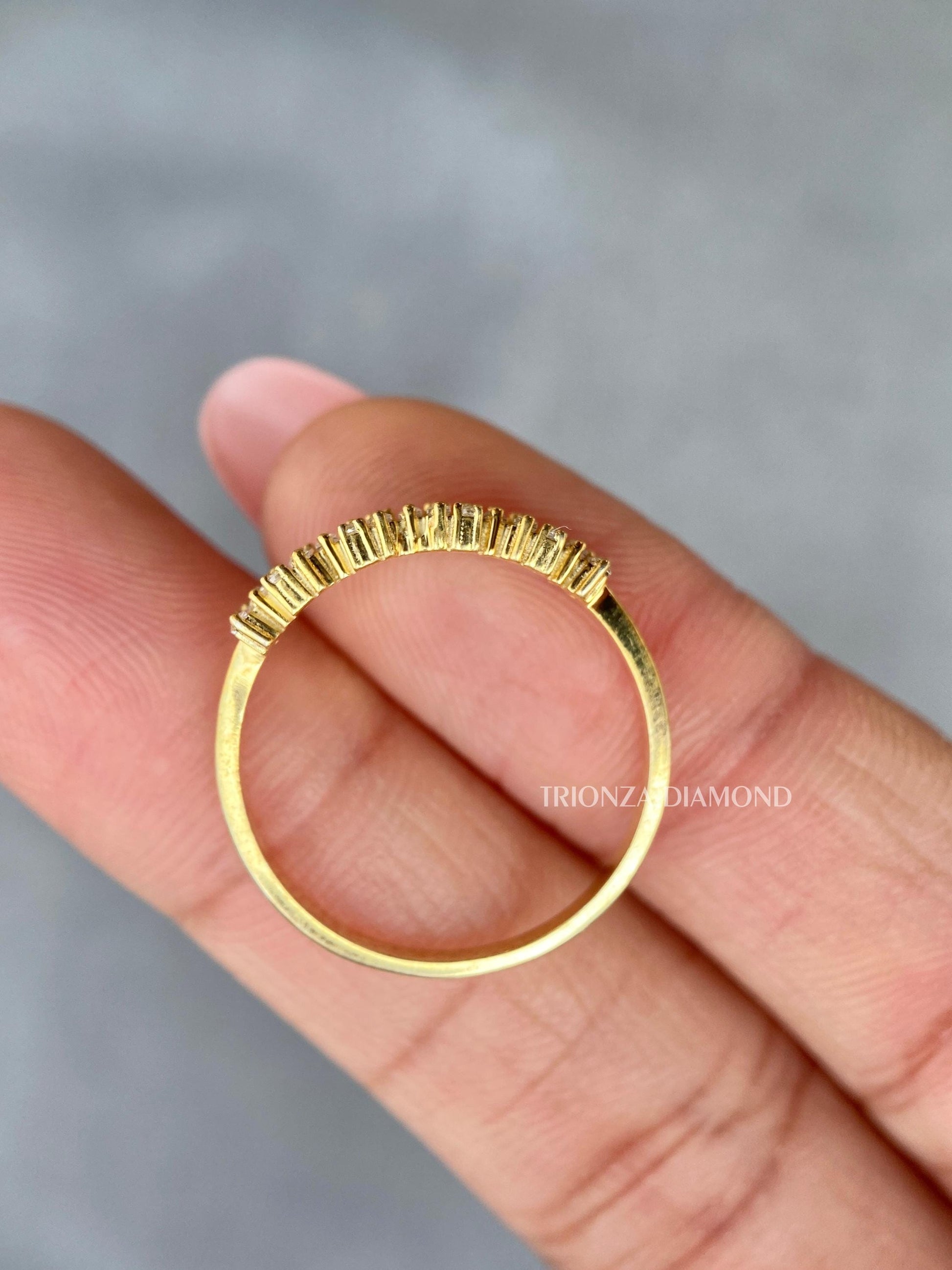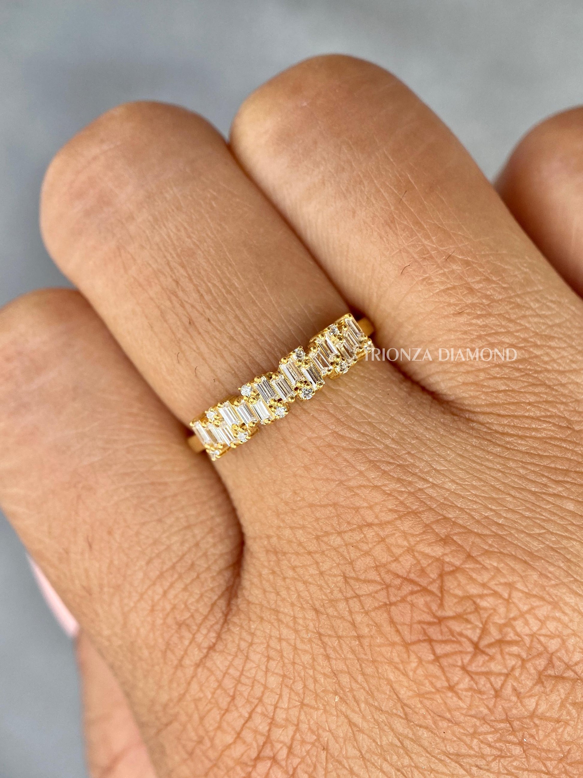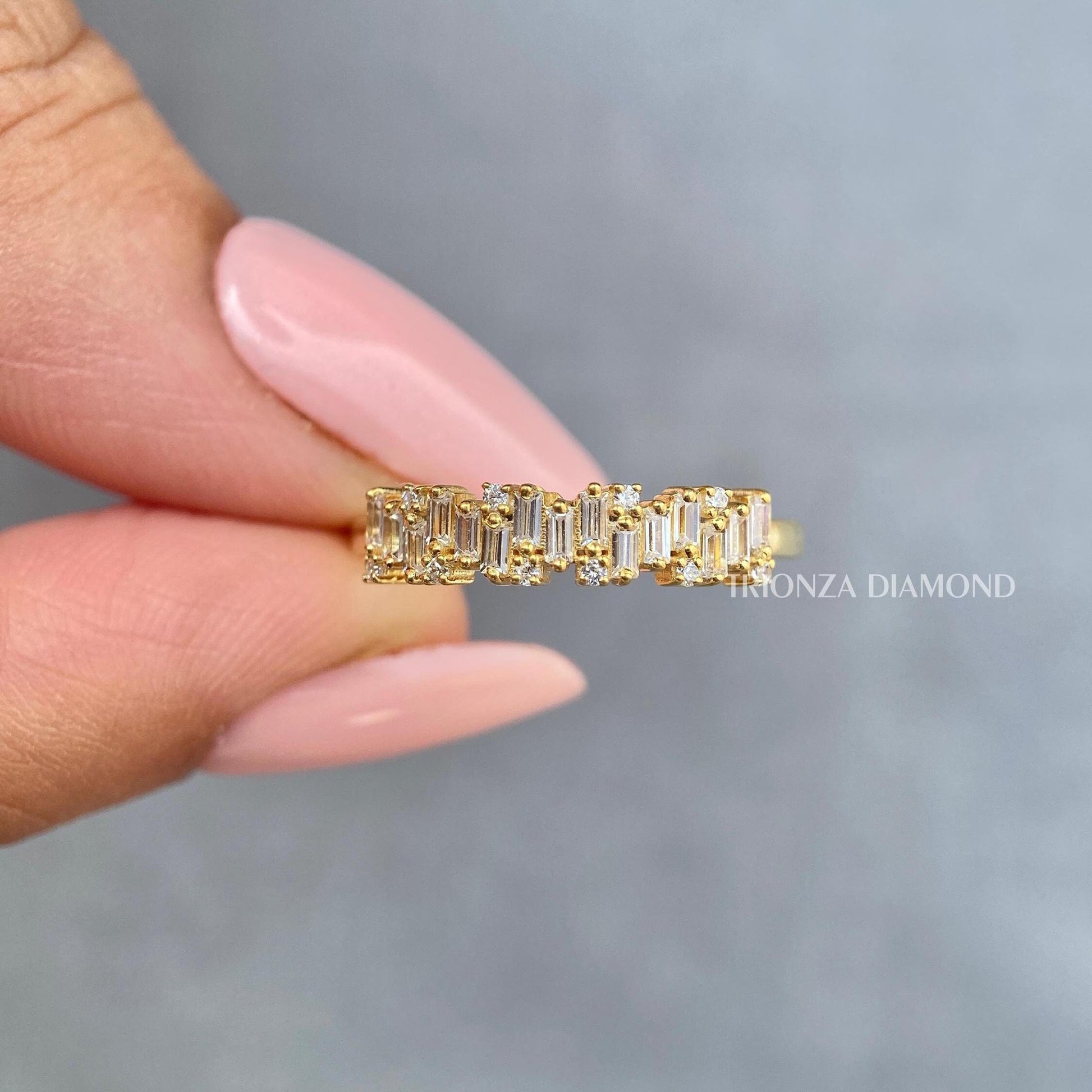 Discover our exquisite Baguette & Round Cut Lab Grown Diamond Half Eternity Band. This dainty gold stacking ring offers a sparkling touch, perfect for daily wear, as a beautiful wedding band, or to complement your bridal stack. It’s designed to enhance every hand with elegance.