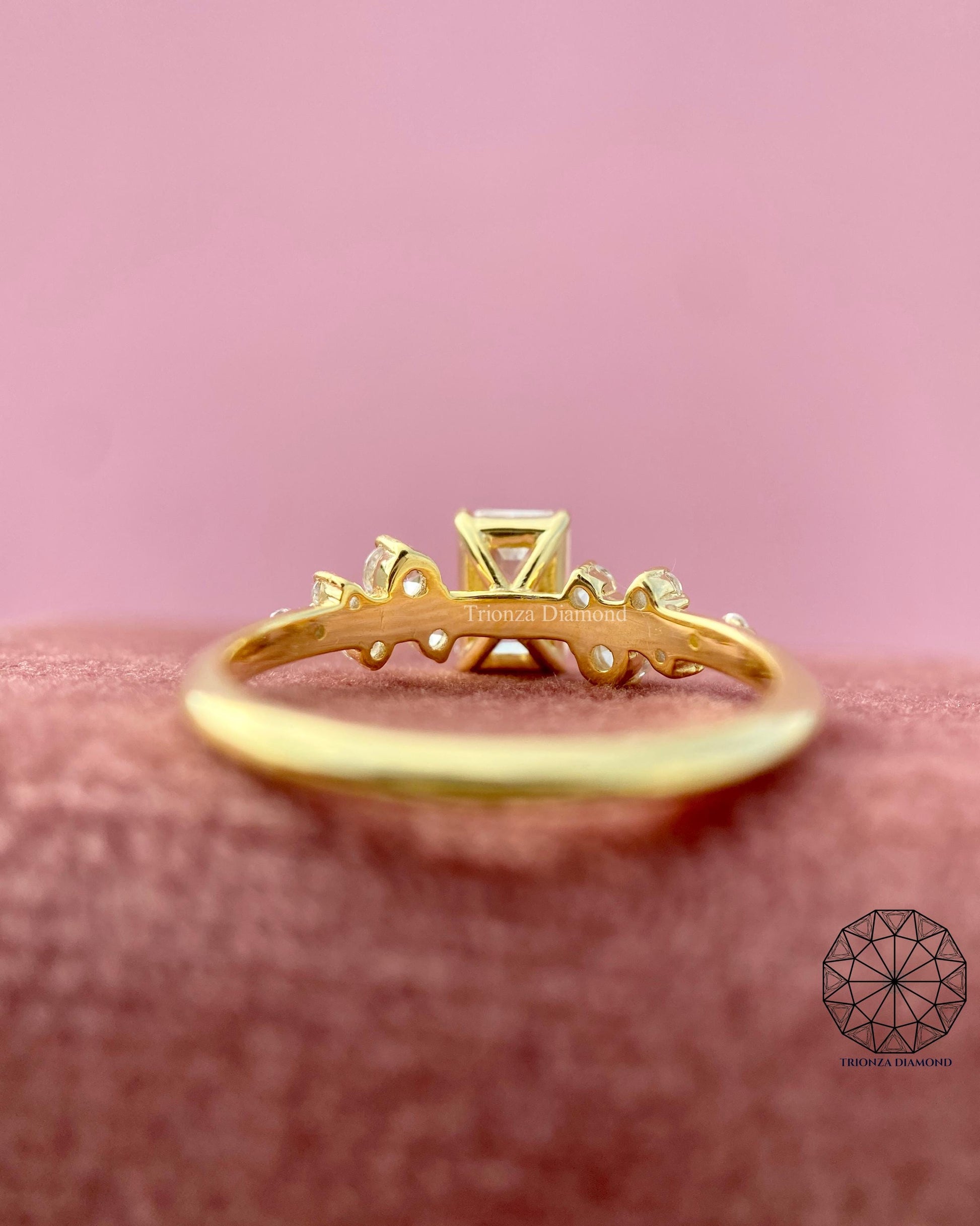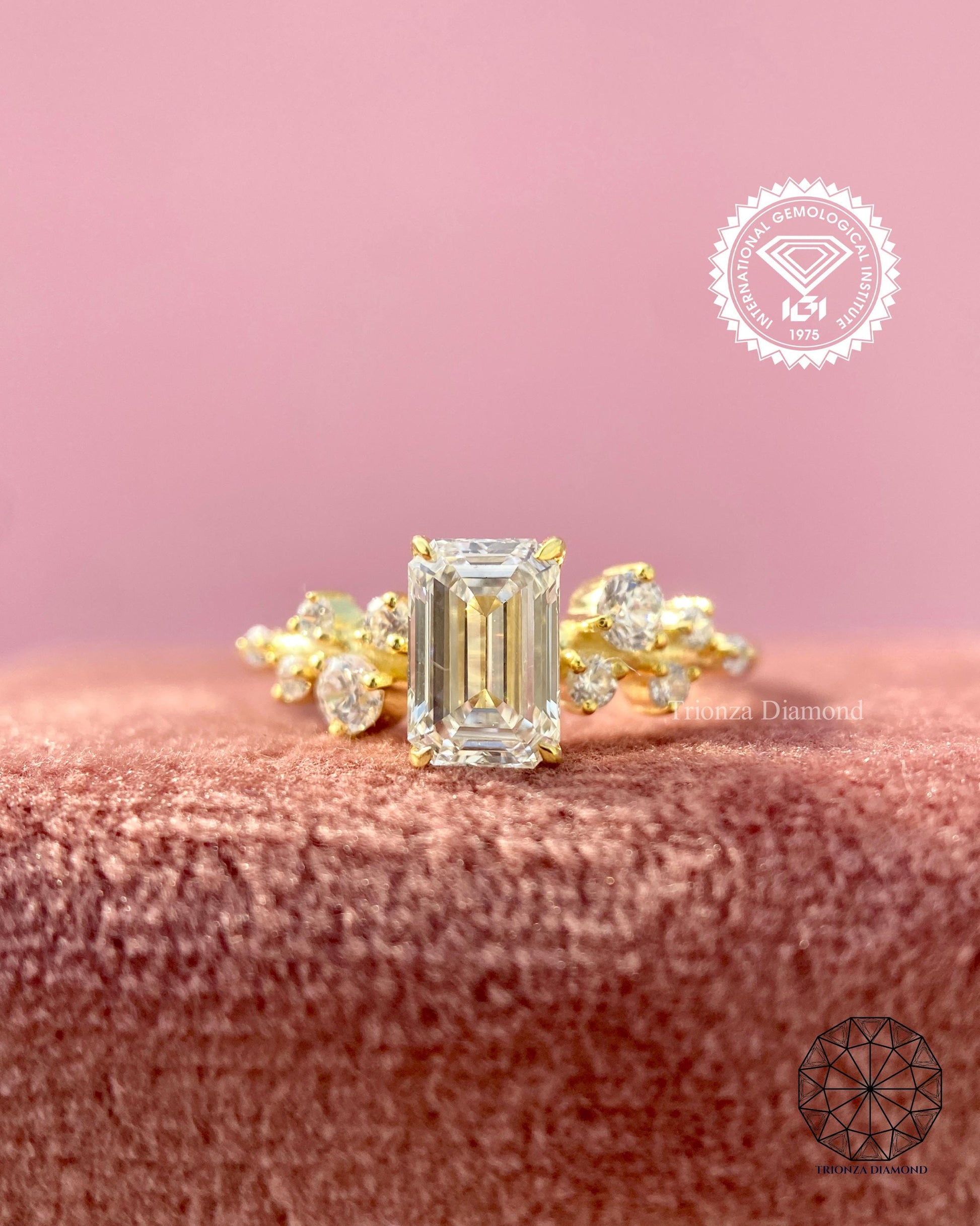 Discover the exquisite Lab Grown Emerald Diamond Engagement Ring in 18k Yellow Gold by Trionza Diamond. This unique snowdrift design features a stunning IGI Certified emerald cut lab grown diamond, complemented by delicate round cut accent diamonds, creating a truly exceptional piece for women. Perfect as an engagement ring, wedding ring, or a special promise ring.