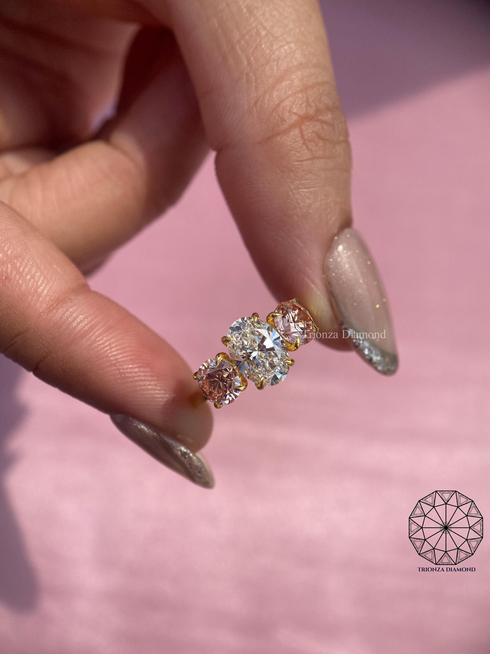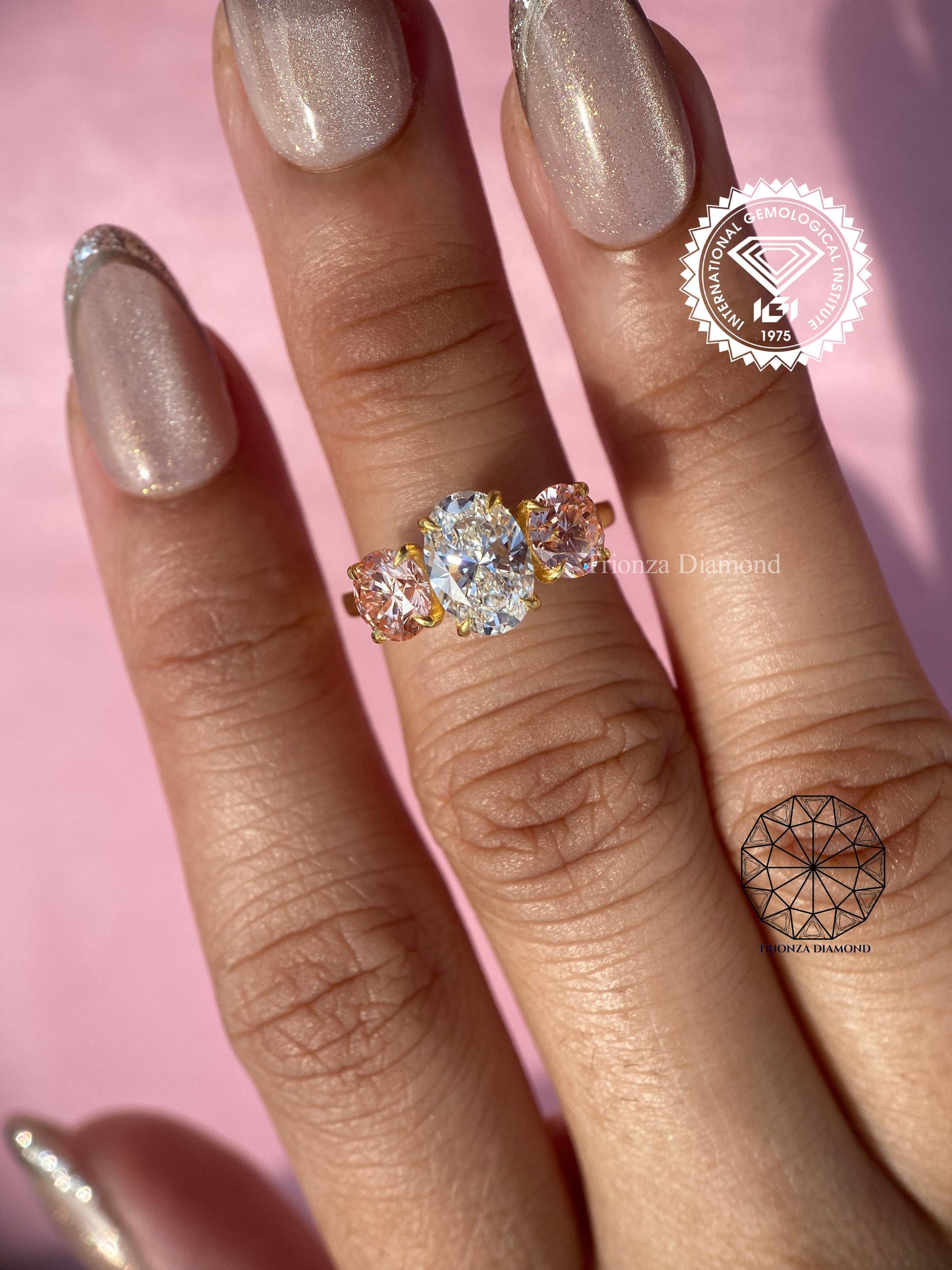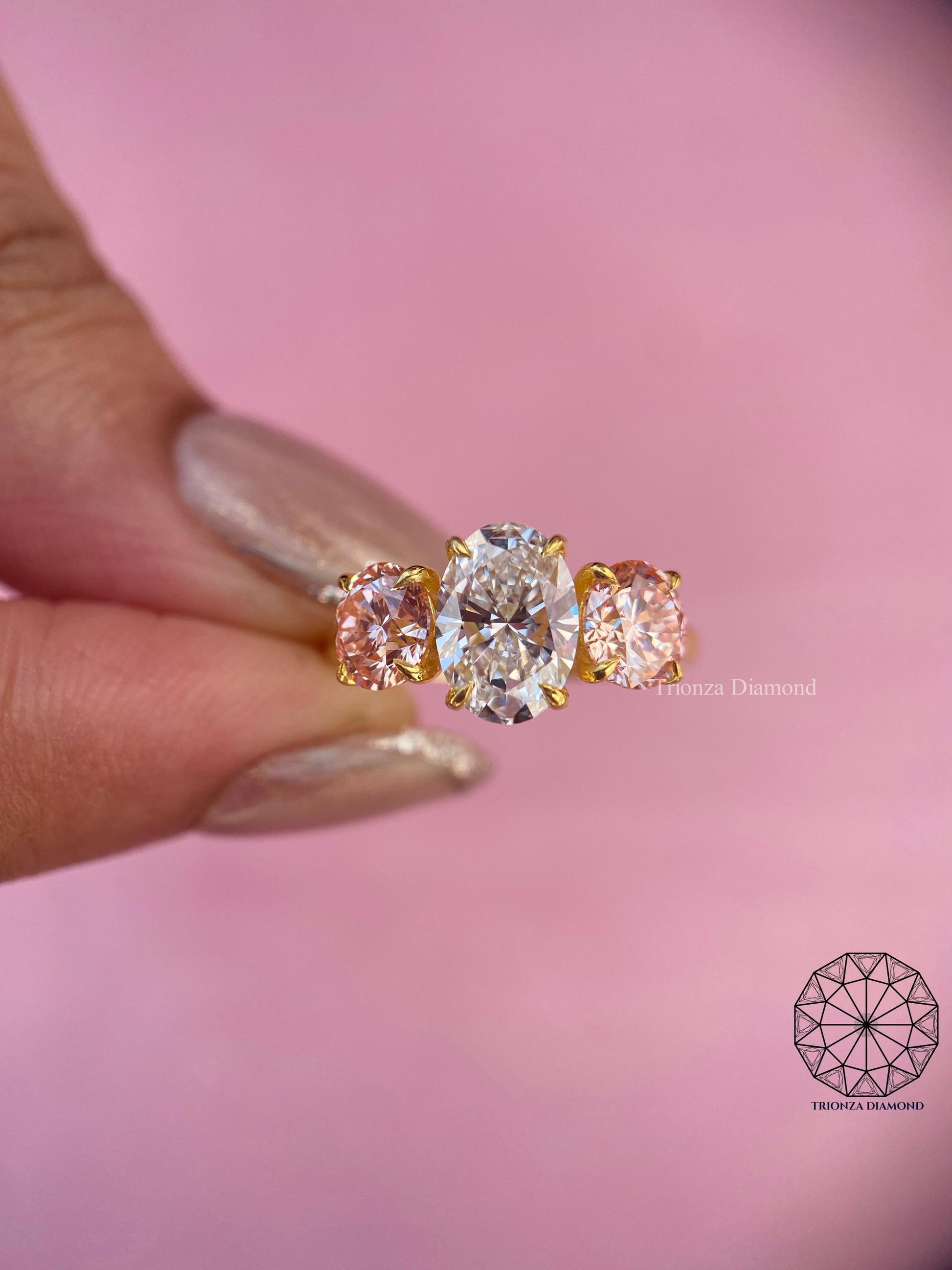 Discover this stunning IGI Certified Oval Three Stone Lab Grown Diamond Engagement Ring, perfect as a wedding ring, trilogy ring, or anniversary gift for her. Featuring an oval cut lab grown diamond with round pink side diamonds, this claw prong set ring is meticulously handcrafted by Trionza Diamond.
