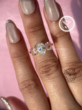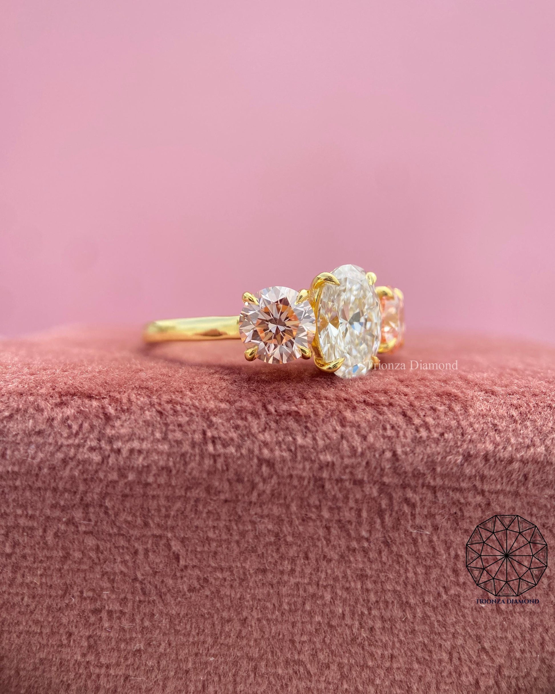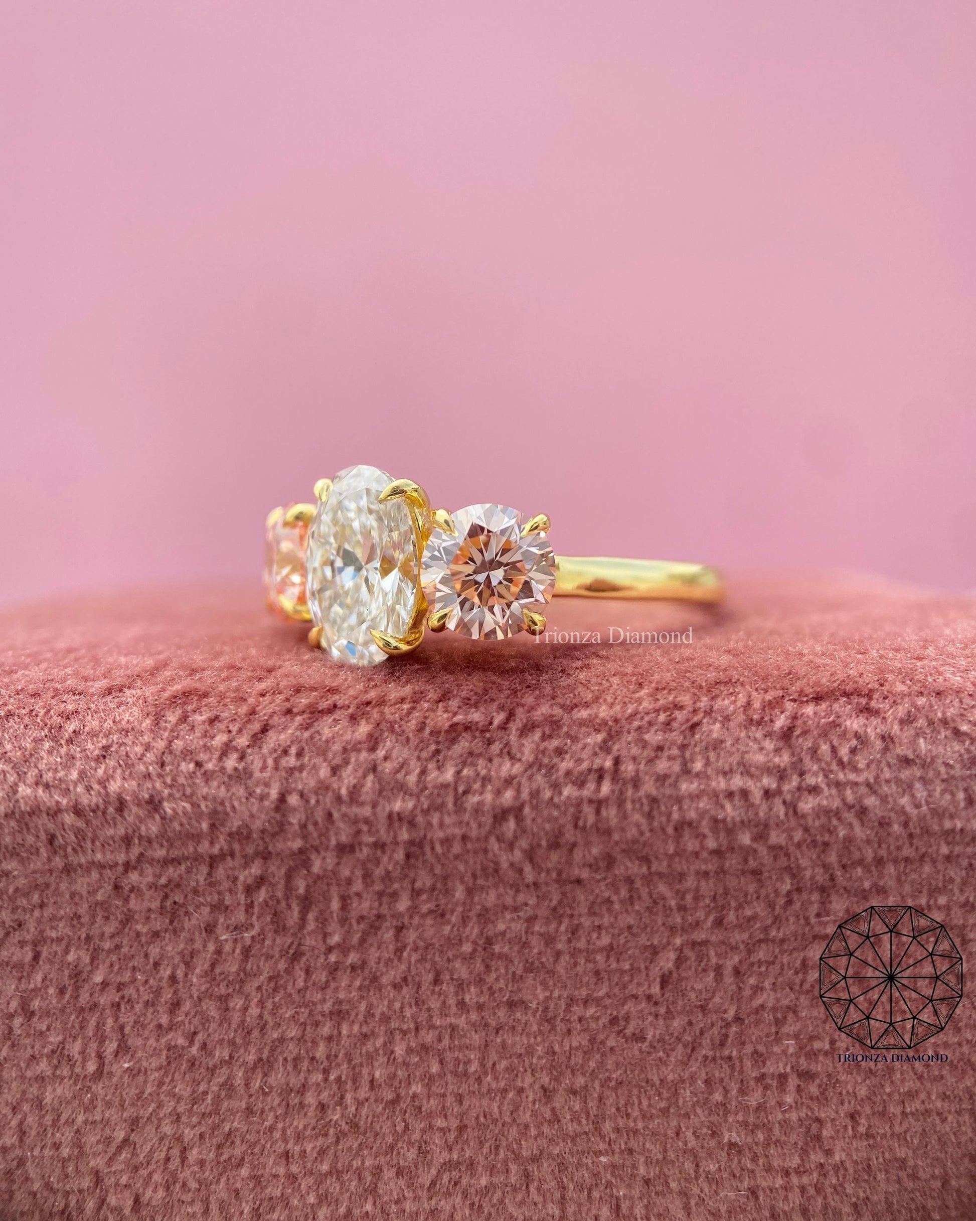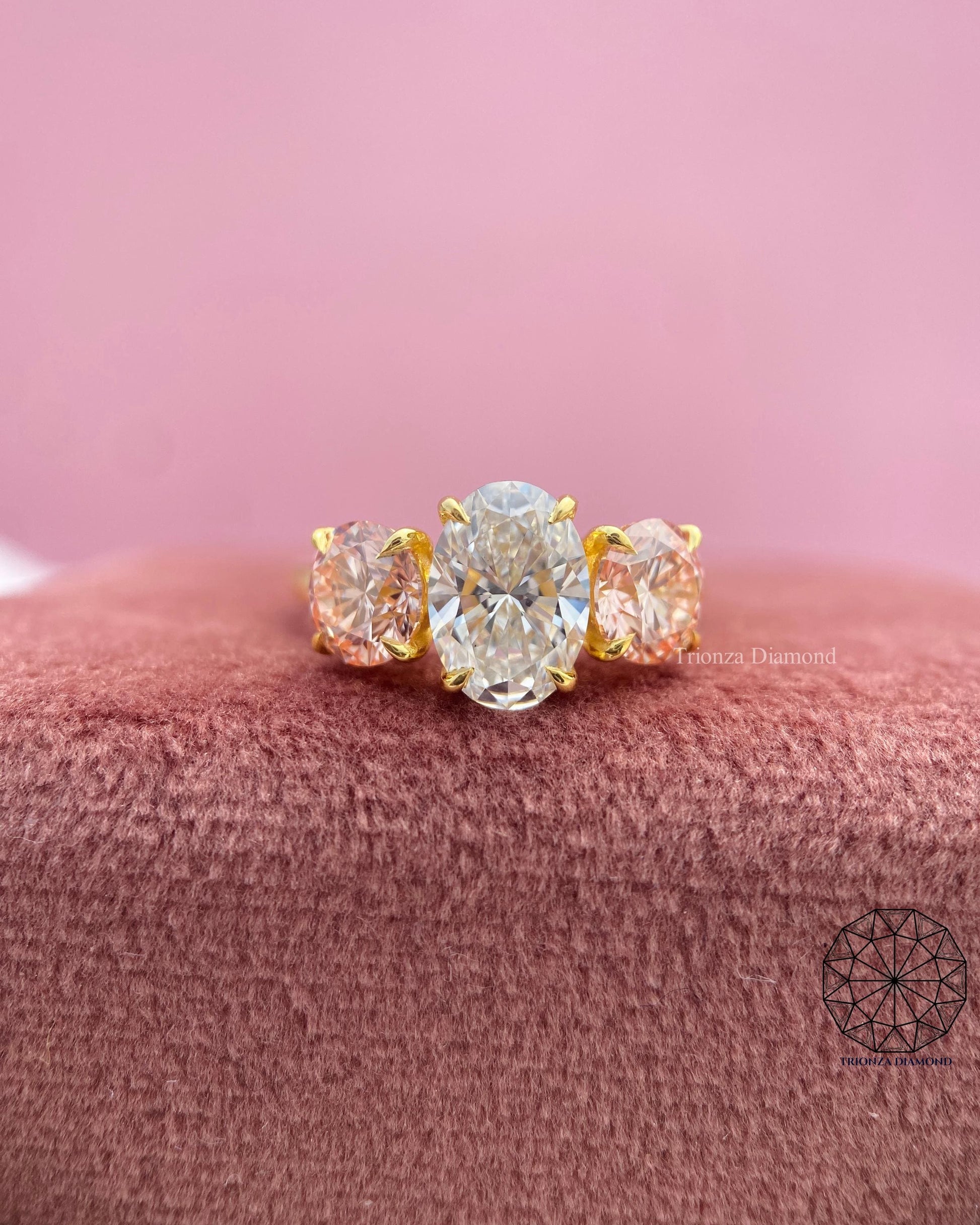 Discover this stunning IGI Certified Oval Three Stone Lab Grown Diamond Engagement Ring, perfect as a wedding ring, trilogy ring, or anniversary gift for her. Featuring an oval cut lab grown diamond with round pink side diamonds, this claw prong set ring is meticulously handcrafted by Trionza Diamond.