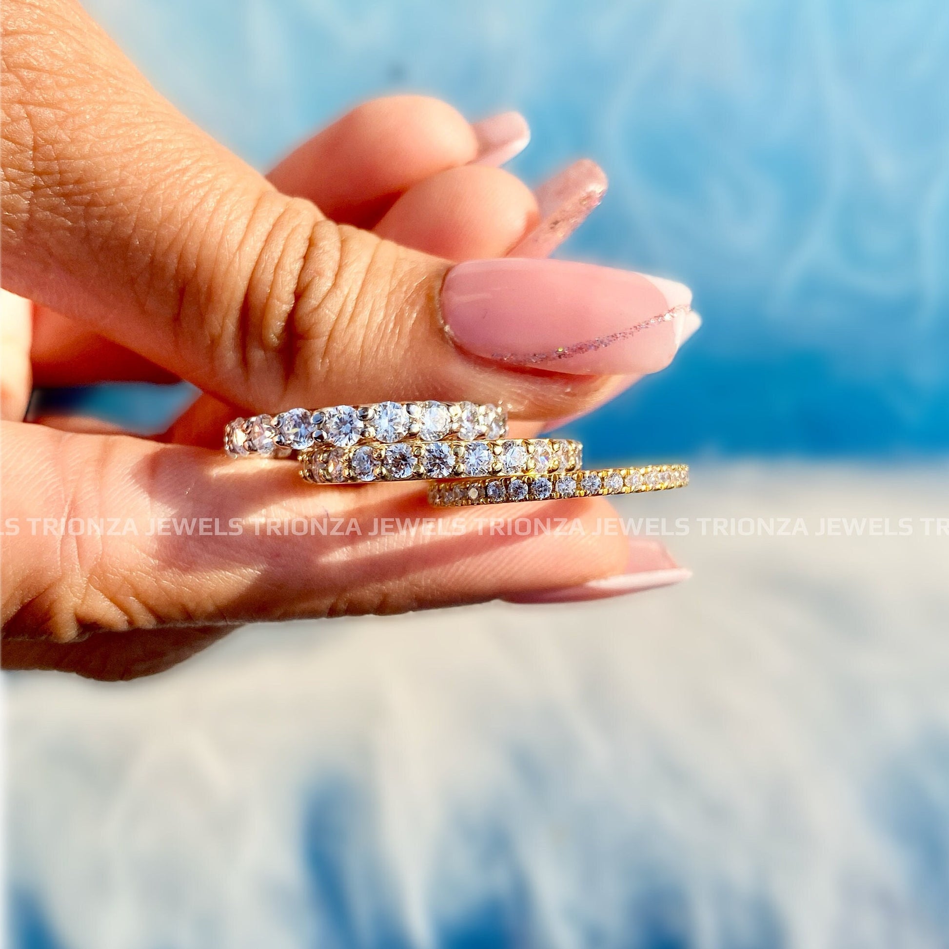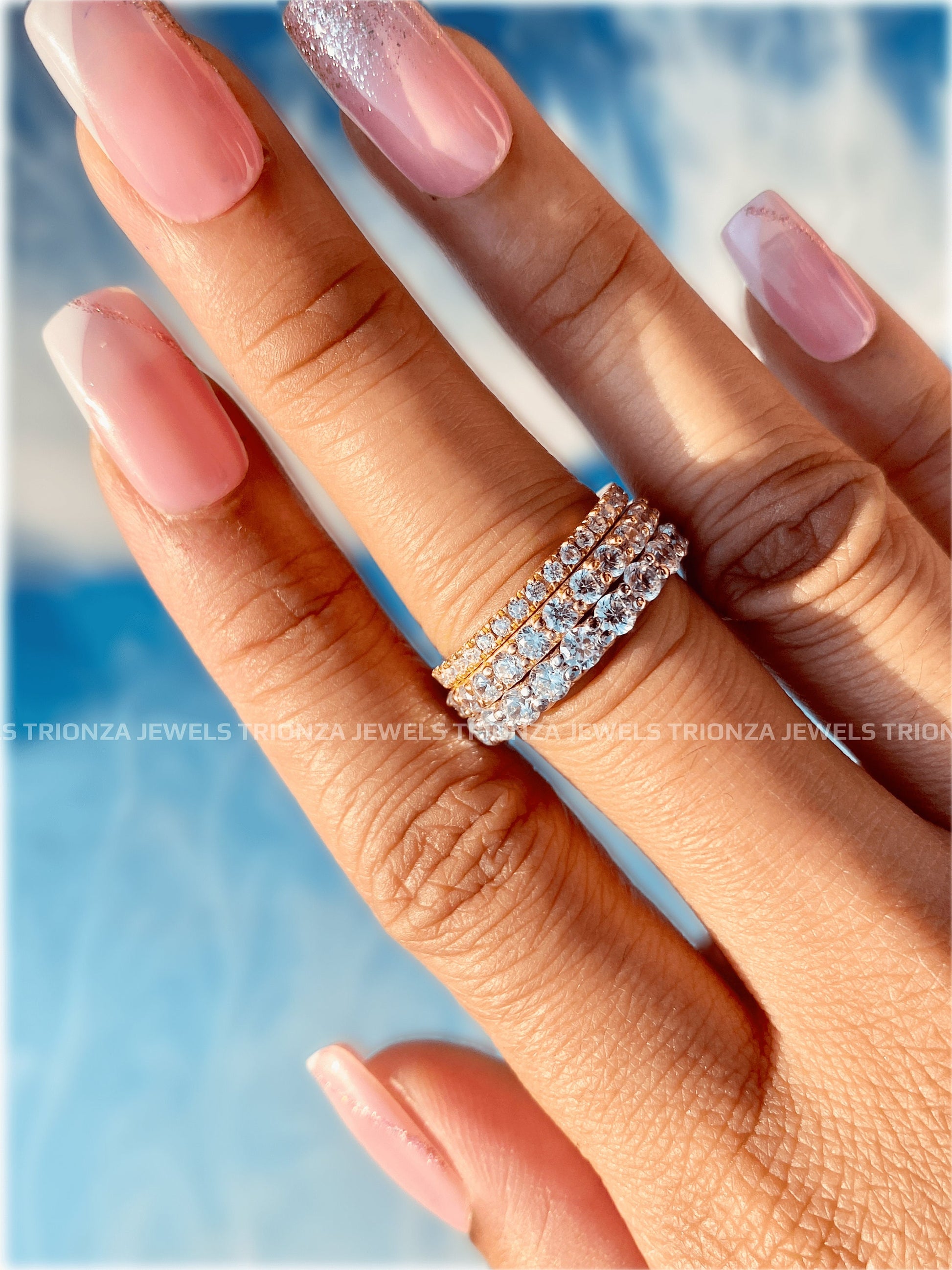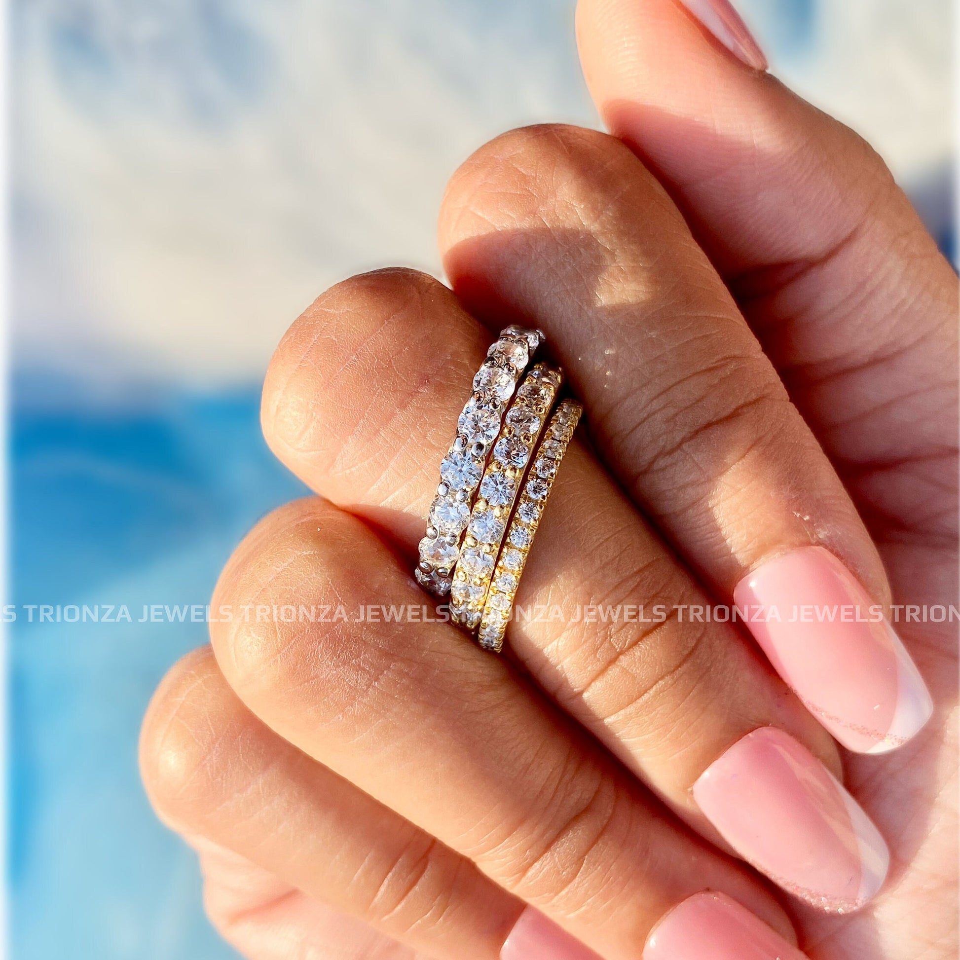 Discover our stunning Micro Pave Moissanite Full Eternity Wedding Band, perfect as a stackable ring or a meaningful anniversary gift. Handcrafted by TRIONZA JEWELS, this eco-friendly and ethical diamond alternative offers brilliant sparkle and exceptional quality.
