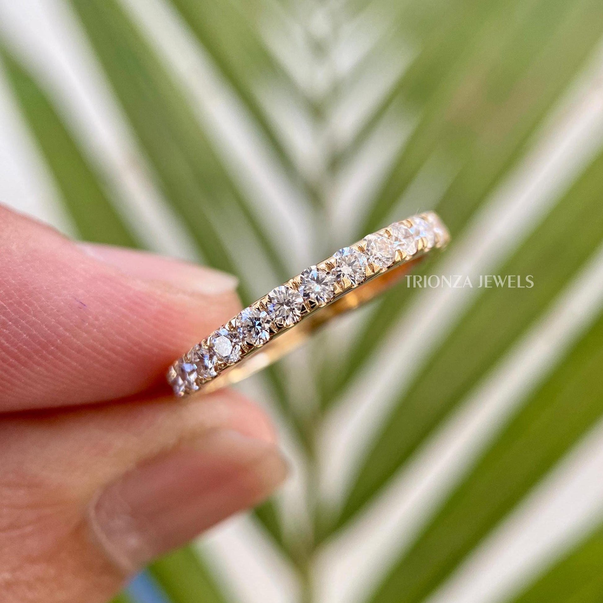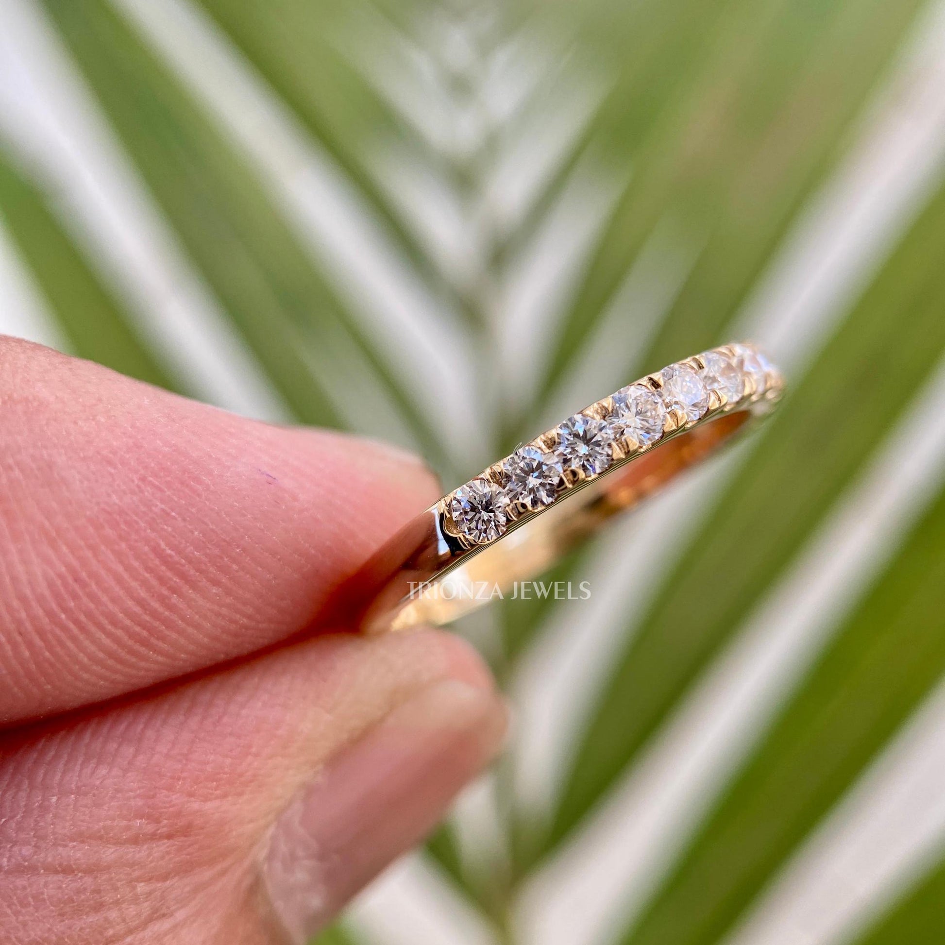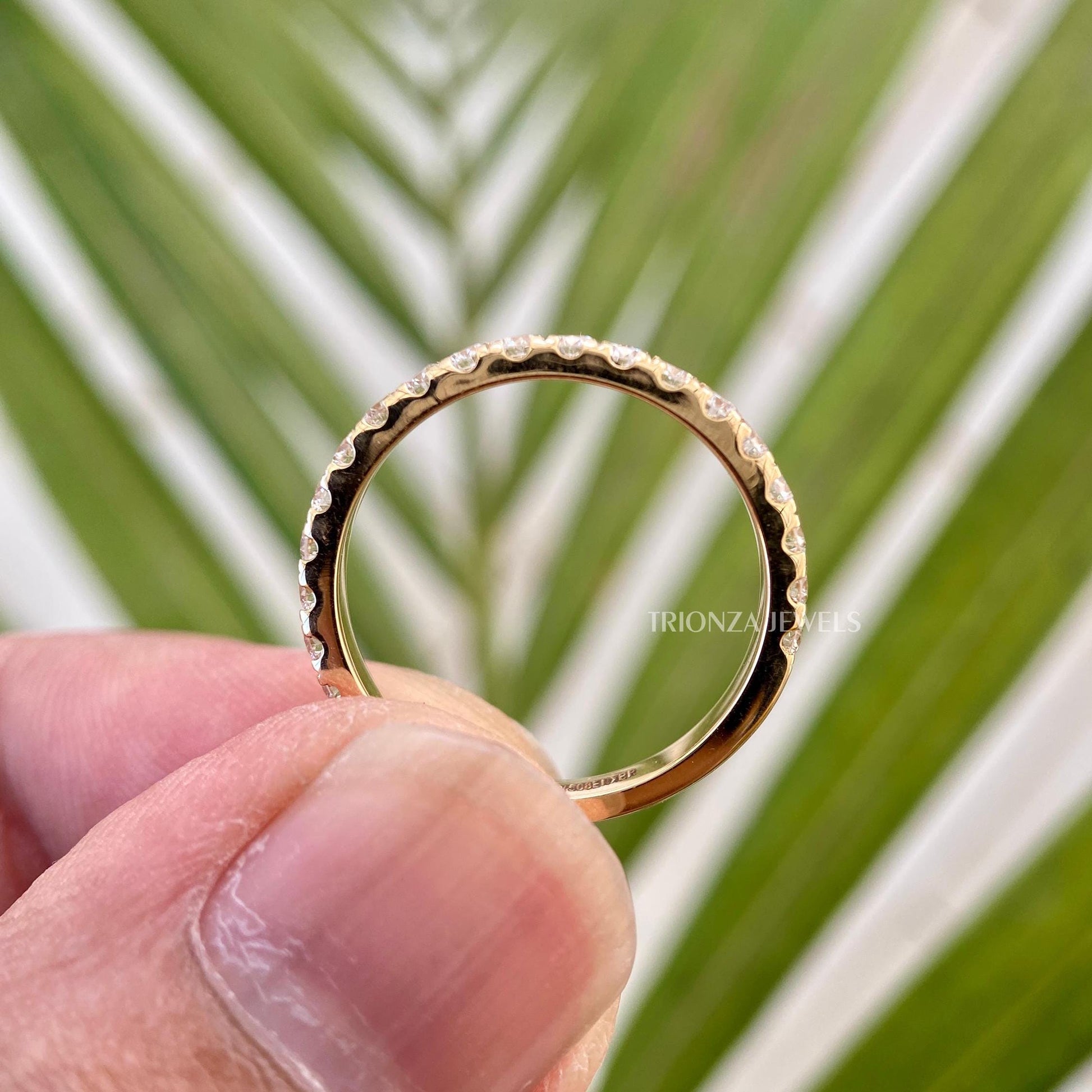 Discover our exquisite Micro Pave Moissanite Wedding Band, a 2.5mm Half Eternity Stackable Ring perfect for anniversaries, engagements, or as a thoughtful gift. This thin matching wedding band is conflict-free and an environmentally friendly choice.
