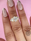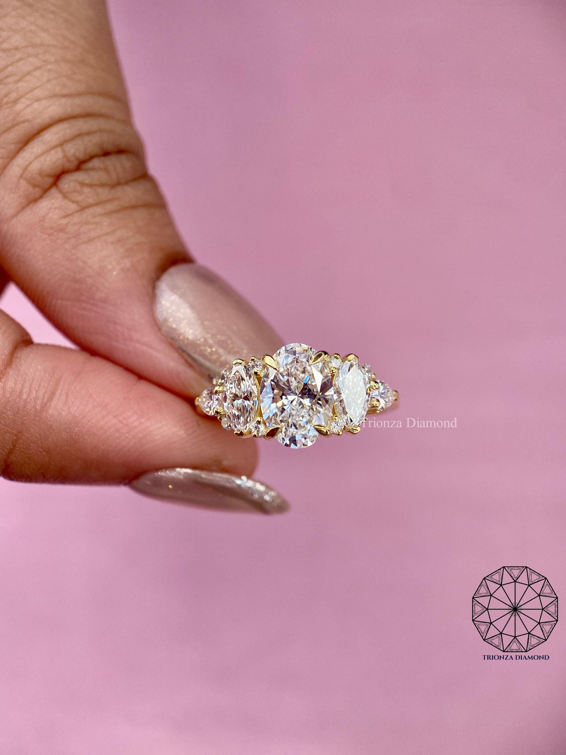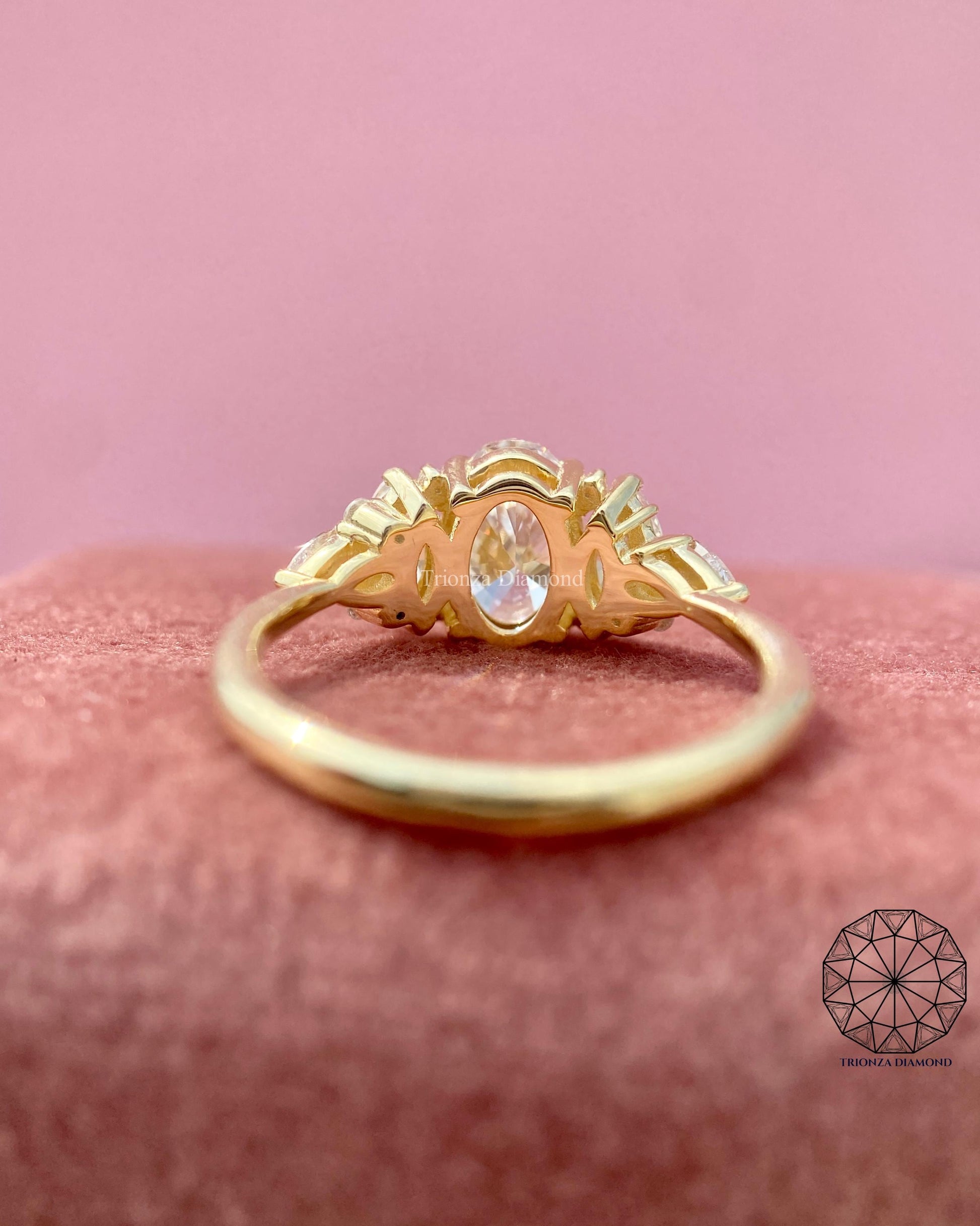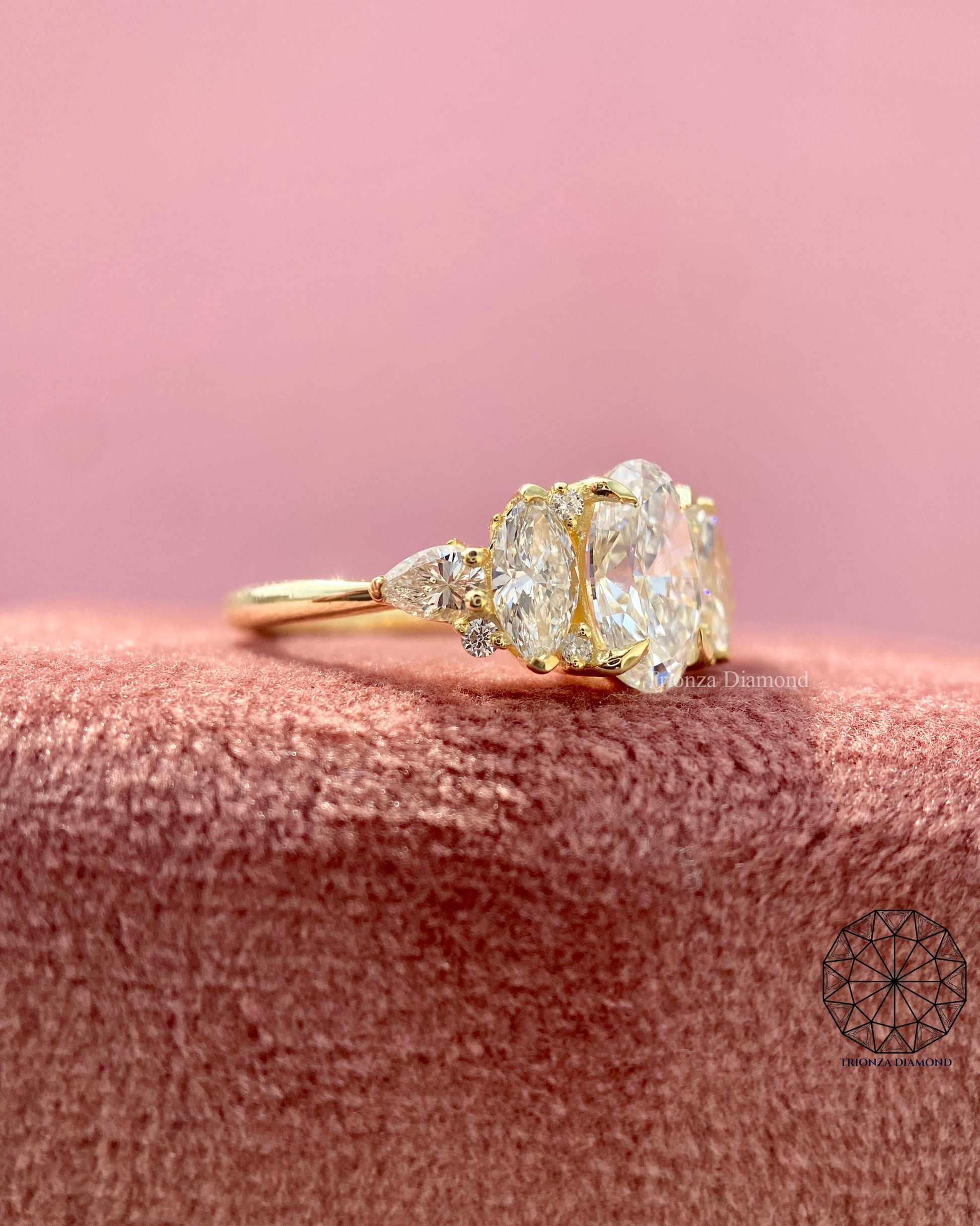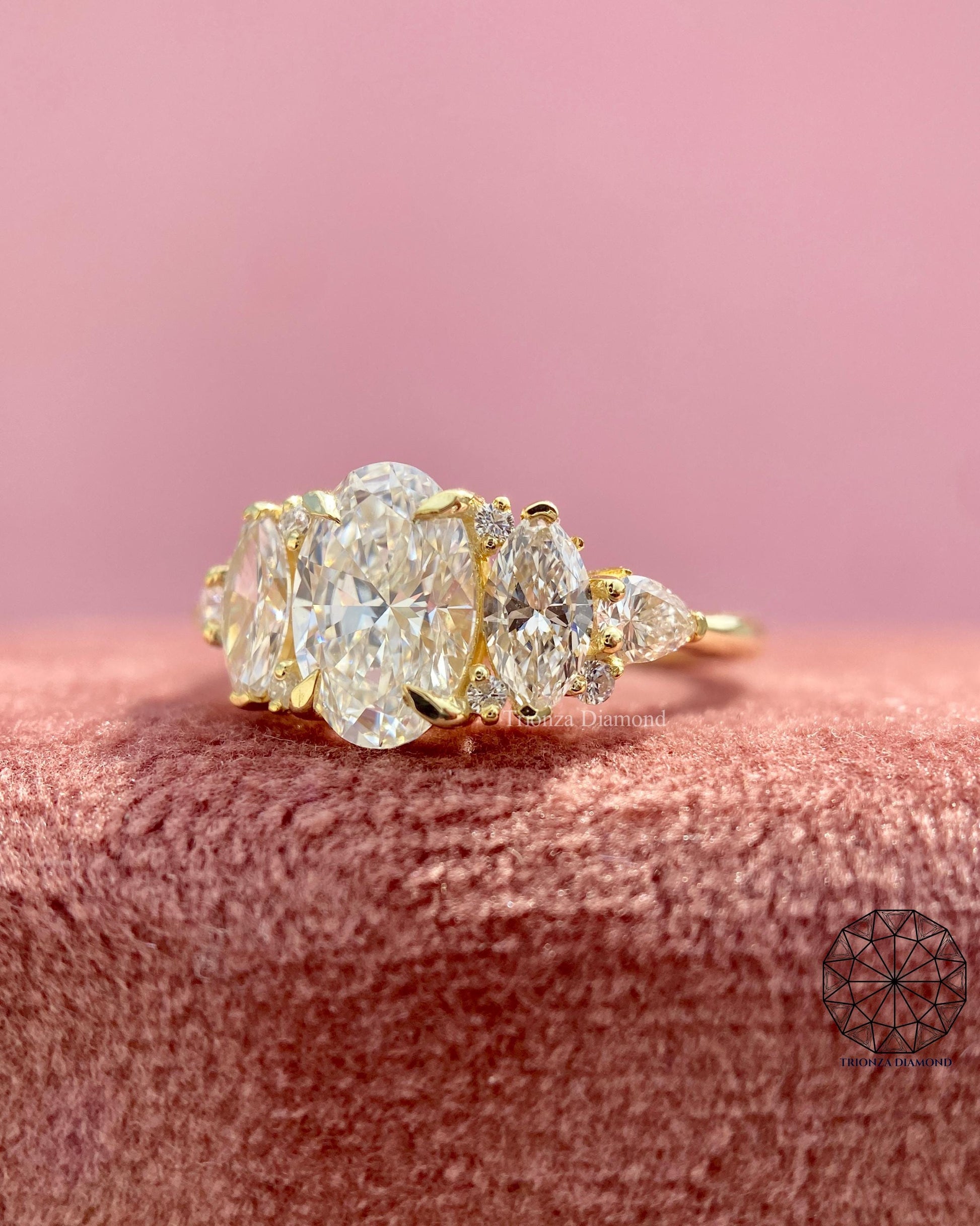 Introducing our stunning Oval Cluster Engagement Ring, featuring a total carat weight of 2 TCW in radiant 14k Yellow Gold. This exquisite ring showcases a beautiful combination of oval cut, marquise, and pear-shaped lab-grown diamonds, making it a truly unique and brilliant choice for a proposal or wedding.