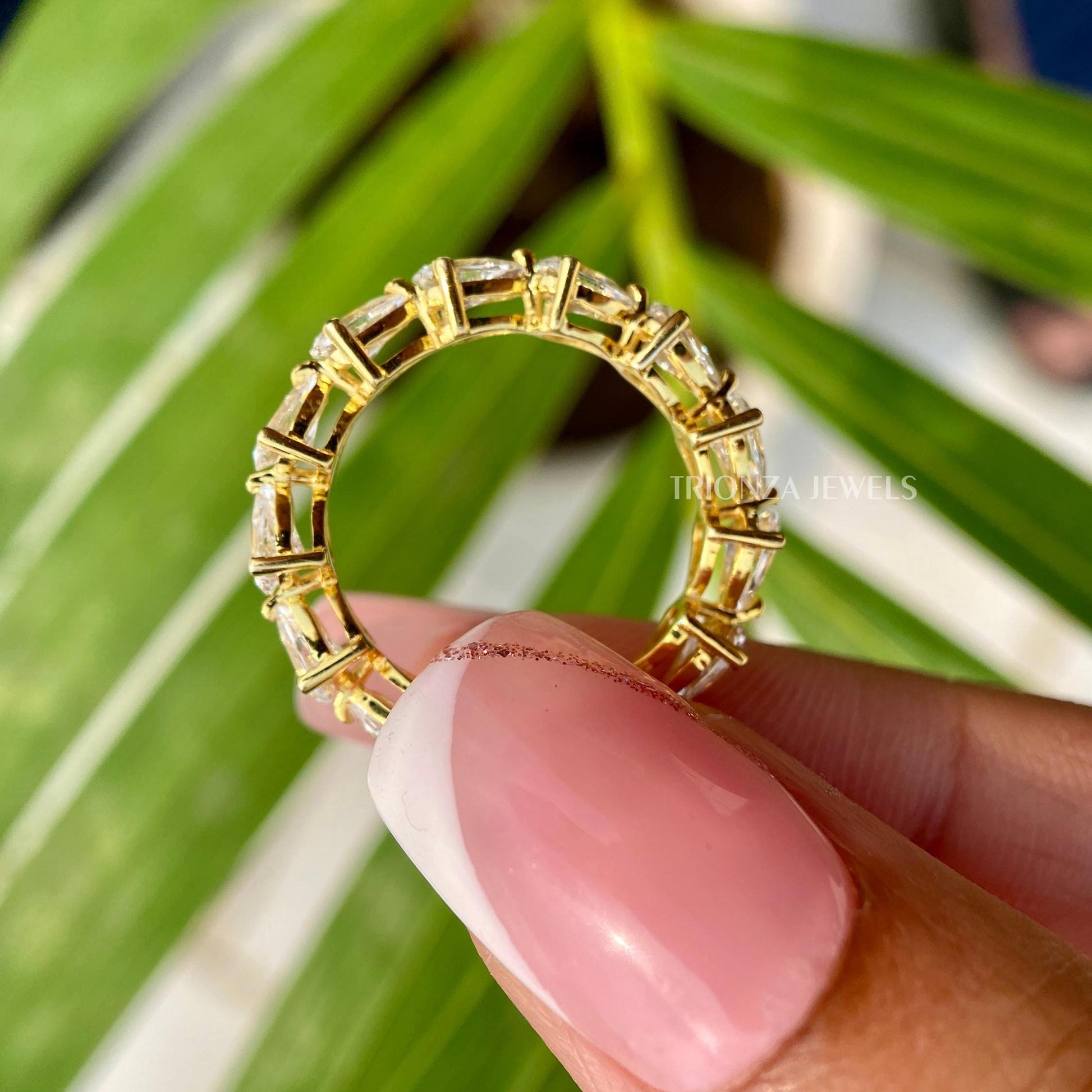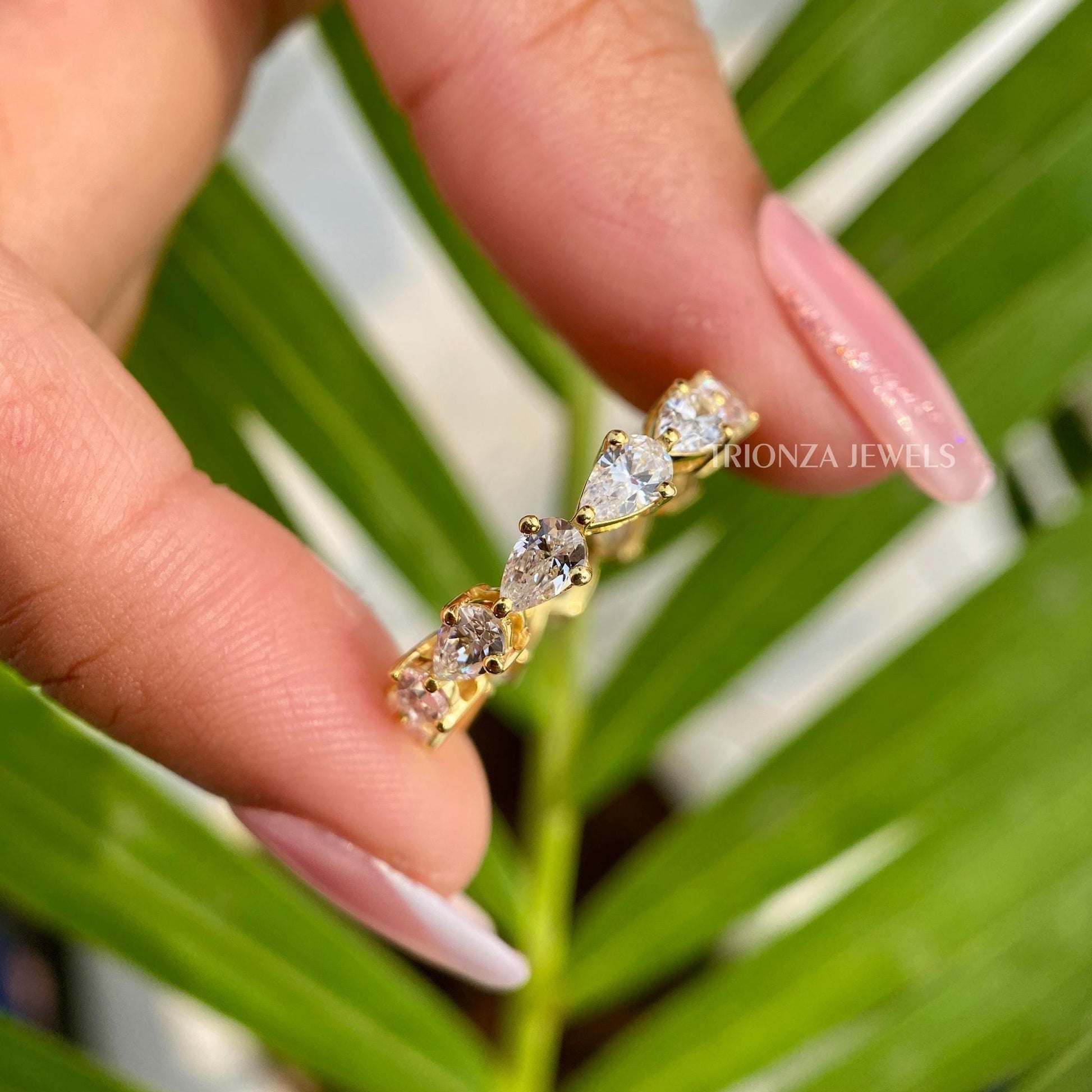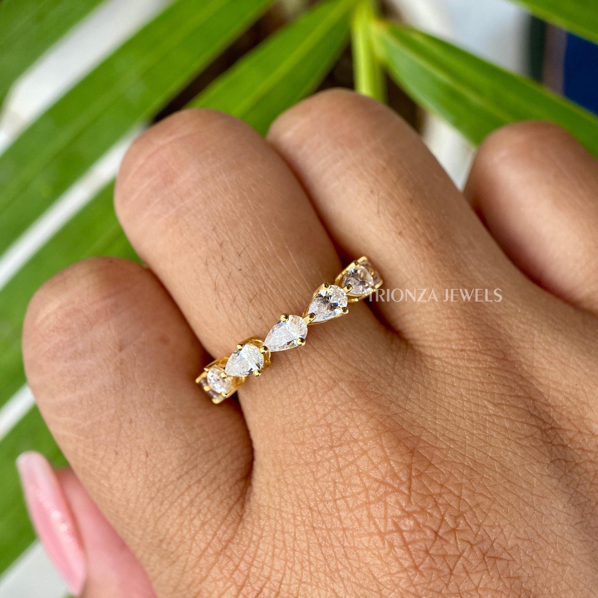 Discover our exquisite Pear Cut Full Eternity Moissanite Stacking Band Ring. This elegant East-West Pear Cut Wedding Band is perfect for women, serving as a beautiful anniversary eternity band, a gorgeous Art Deco proposal ring, or a personalized wedding band. Crafted as handmade jewelry, it also makes a thoughtful Christmas gift or a stunning moissanite engagement ring. Explore our fine moissanite jewelry, tailored for women and customizable for her.