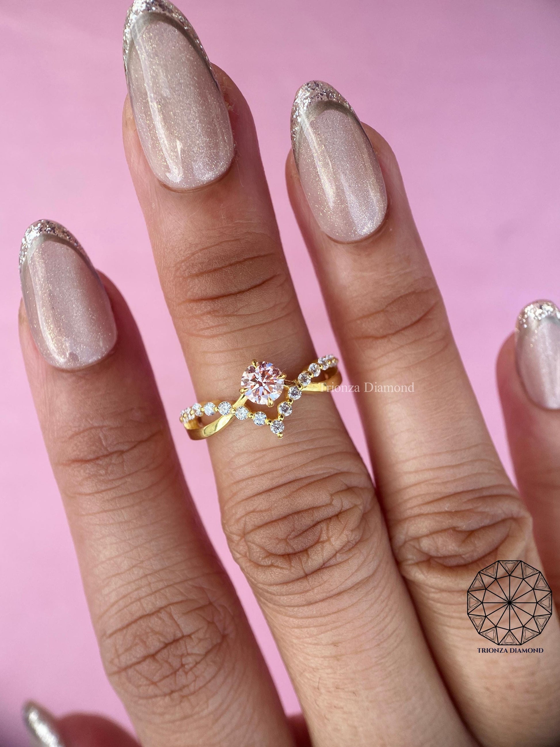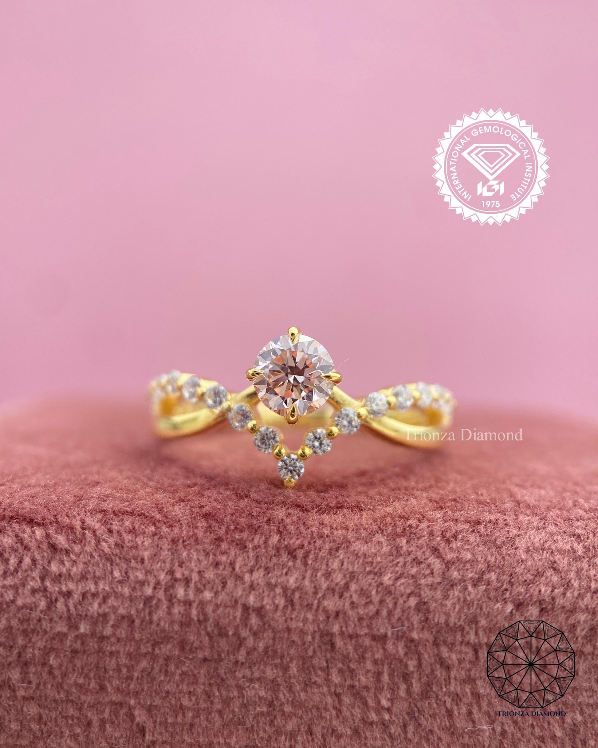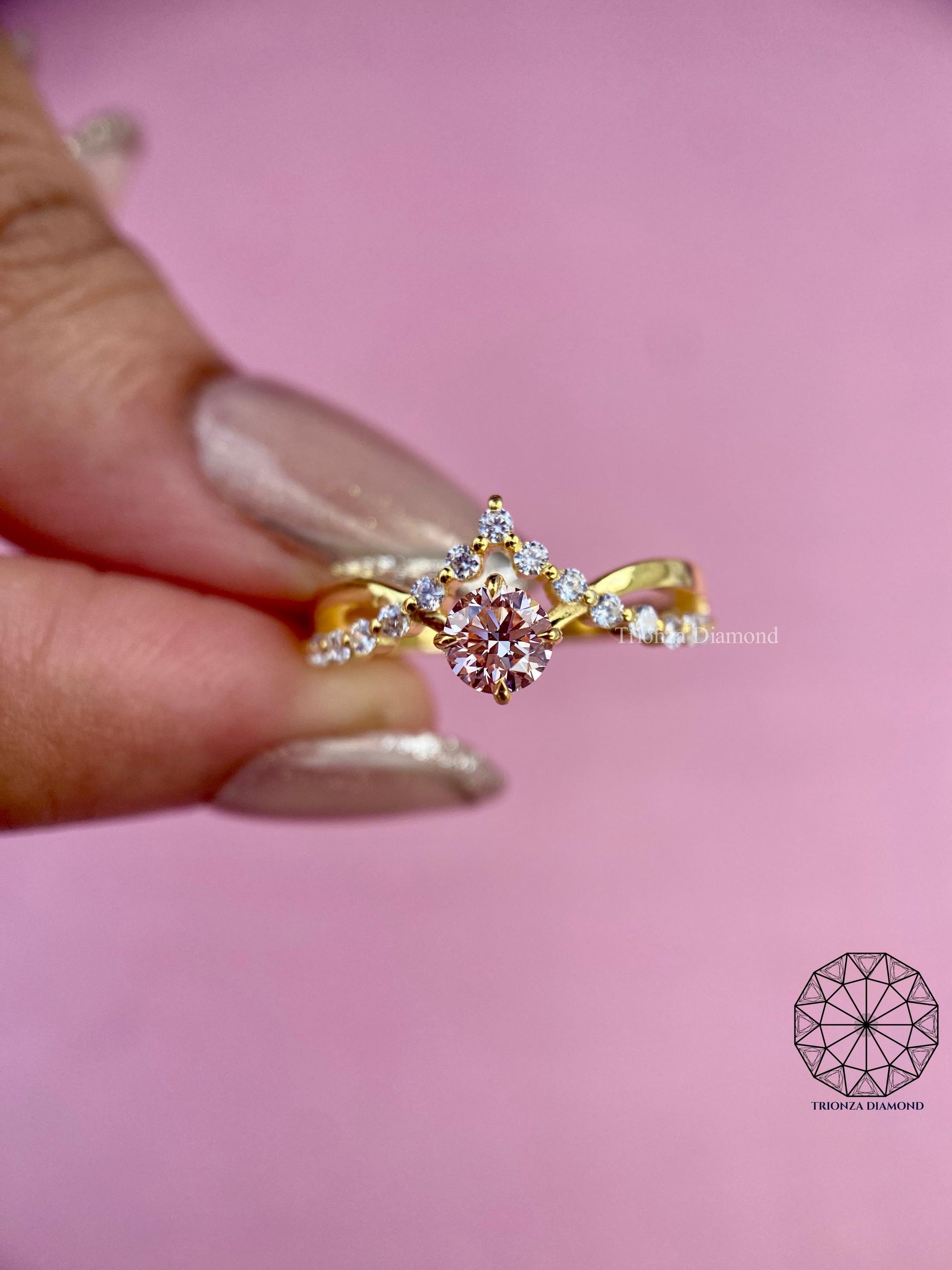 Celebrate your love with this stunning IGI Certified Round Lab-Grown Pink Diamond Engagement Ring, perfect for everyday wear or special occasions. This 14k Solid Yellow Gold Wedding Ring features a twisted band with a crown-style pink fancy diamond, an ideal anniversary gift for her. Handcrafted with love by Trionza Diamond.