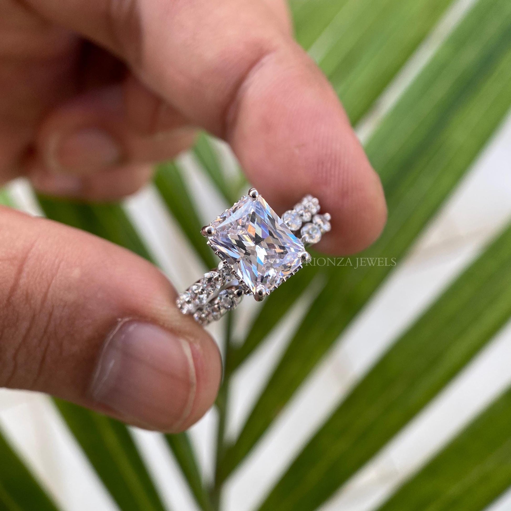 Celebrate your love with this stunning 2.51 CT unique radiant cut bridal set. Featuring a hidden halo design, this moissanite engagement ring is crafted in 18K solid gold, making it a perfect promise ring, wedding ring, or anniversary gift for her.