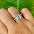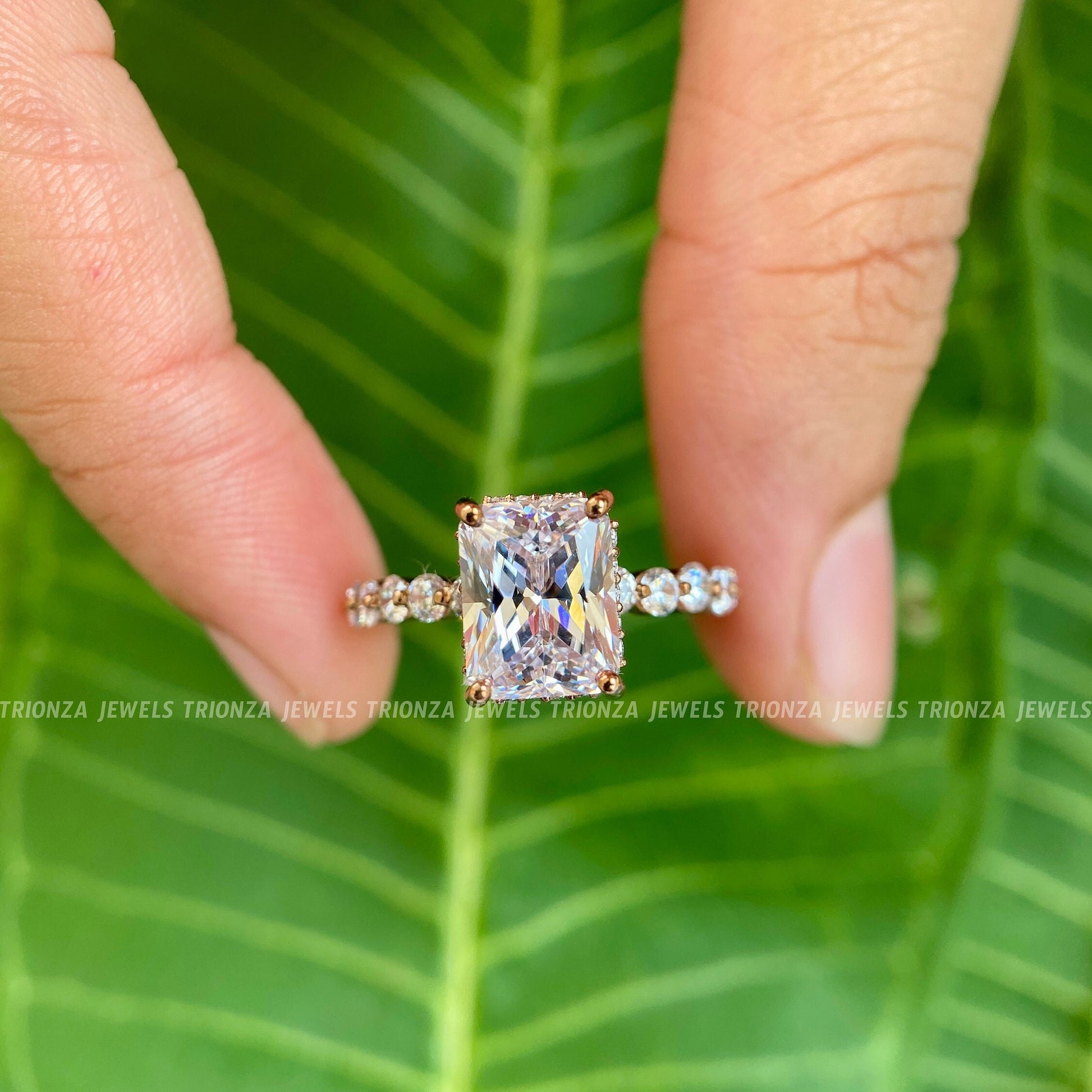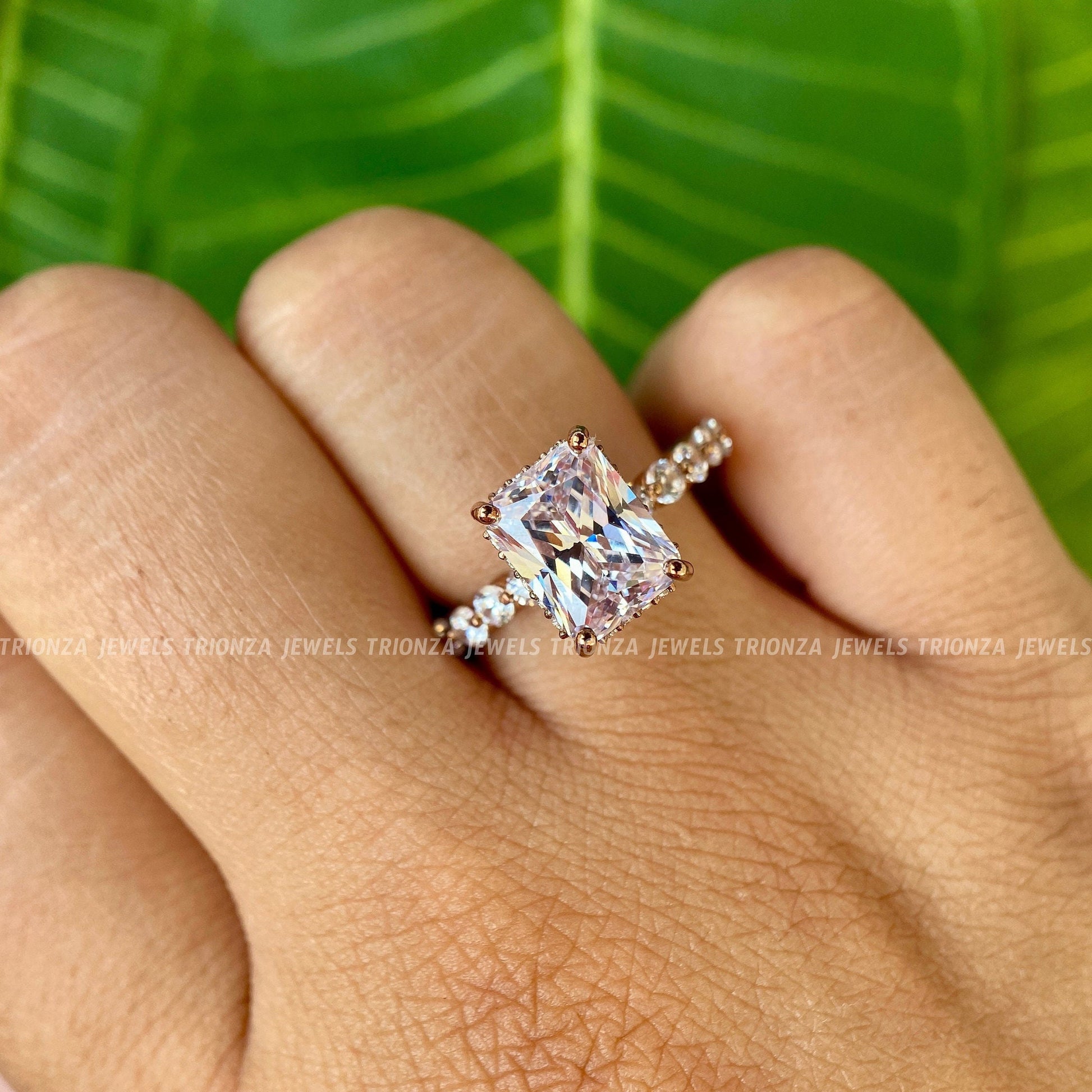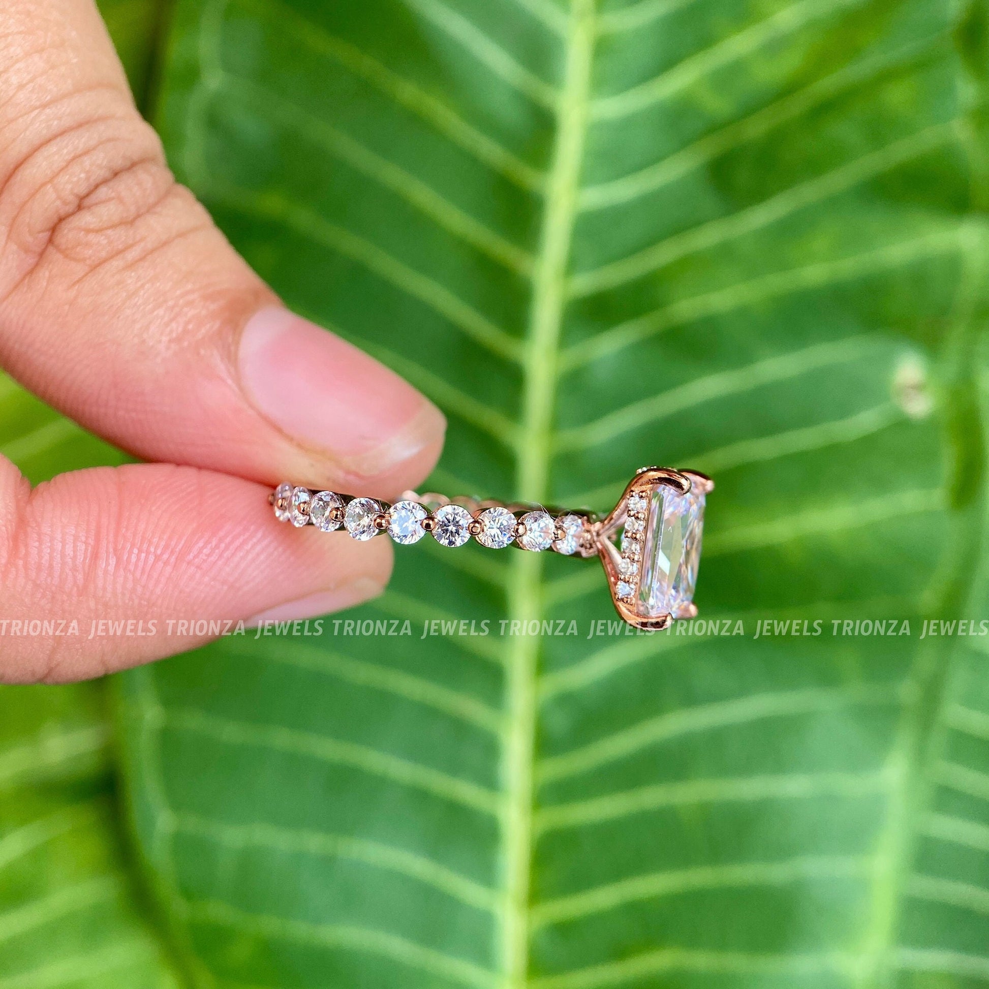 Discover our exquisite Radiant Moissanite Diamond Ring, featuring a stunning radiant-cut moissanite main stone and a beautifully spaced round moissanite diamond band. Crafted in solid gold, this ring makes an unforgettable gift for her, perfect for proposals, engagements, weddings, anniversaries, or Valentine's Day.