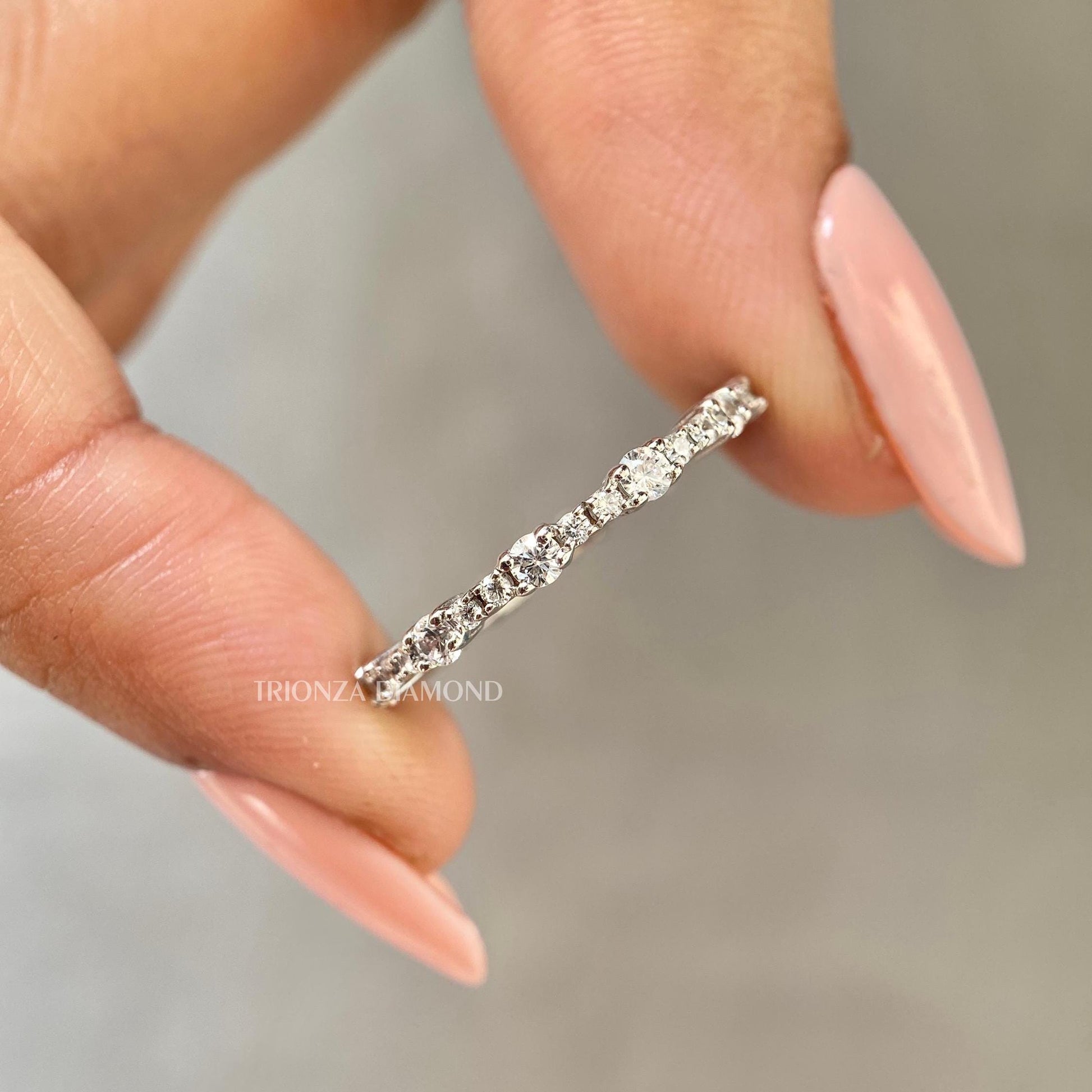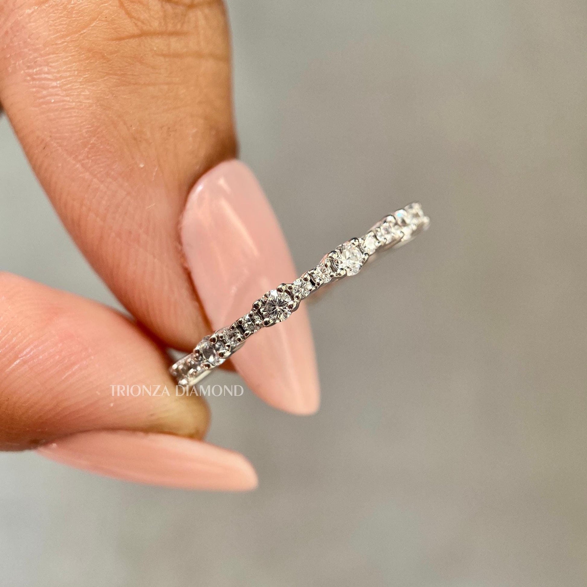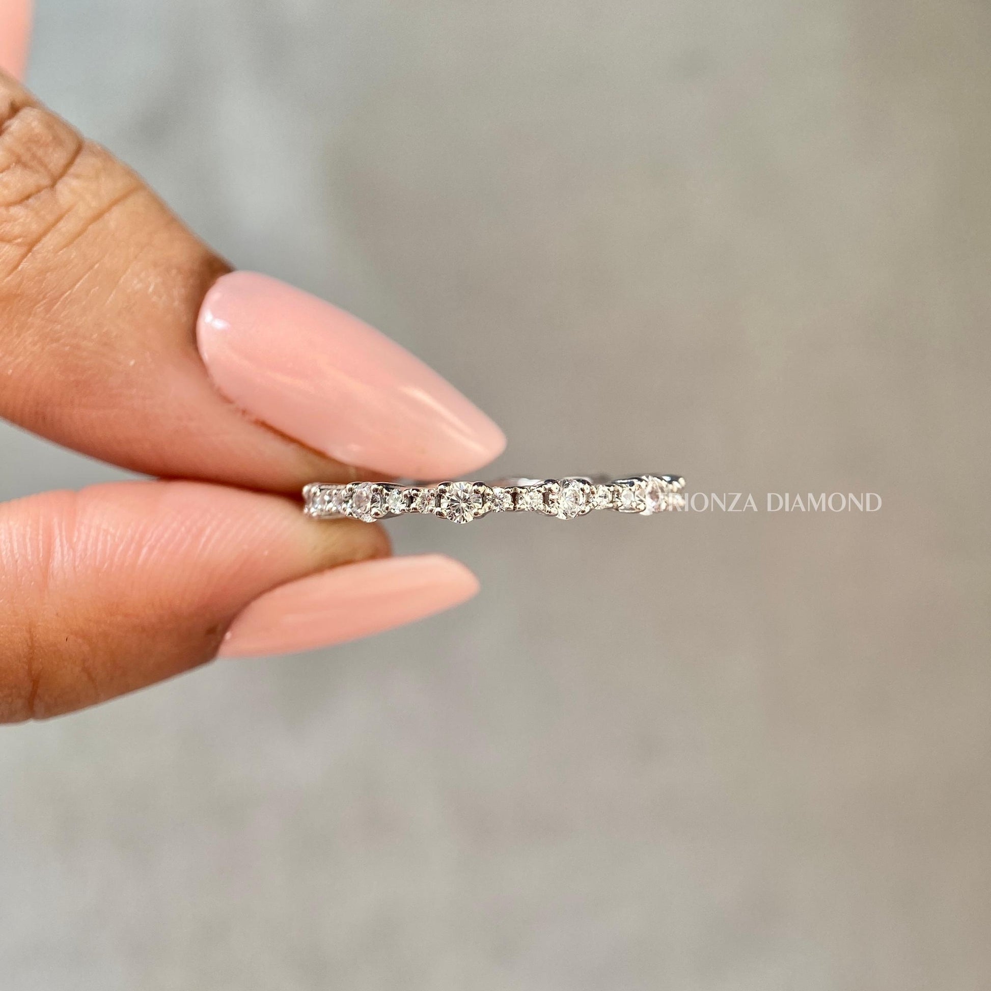 Discover our exquisite Round Cut Lab Diamond Full Eternity Band, a dainty lab-grown diamond wedding ring perfect for stacking or as a delicate bridal ring. Each precision-set stone ensures continuous sparkle and brilliance, ideal for pairing with engagement rings or wearing solo.