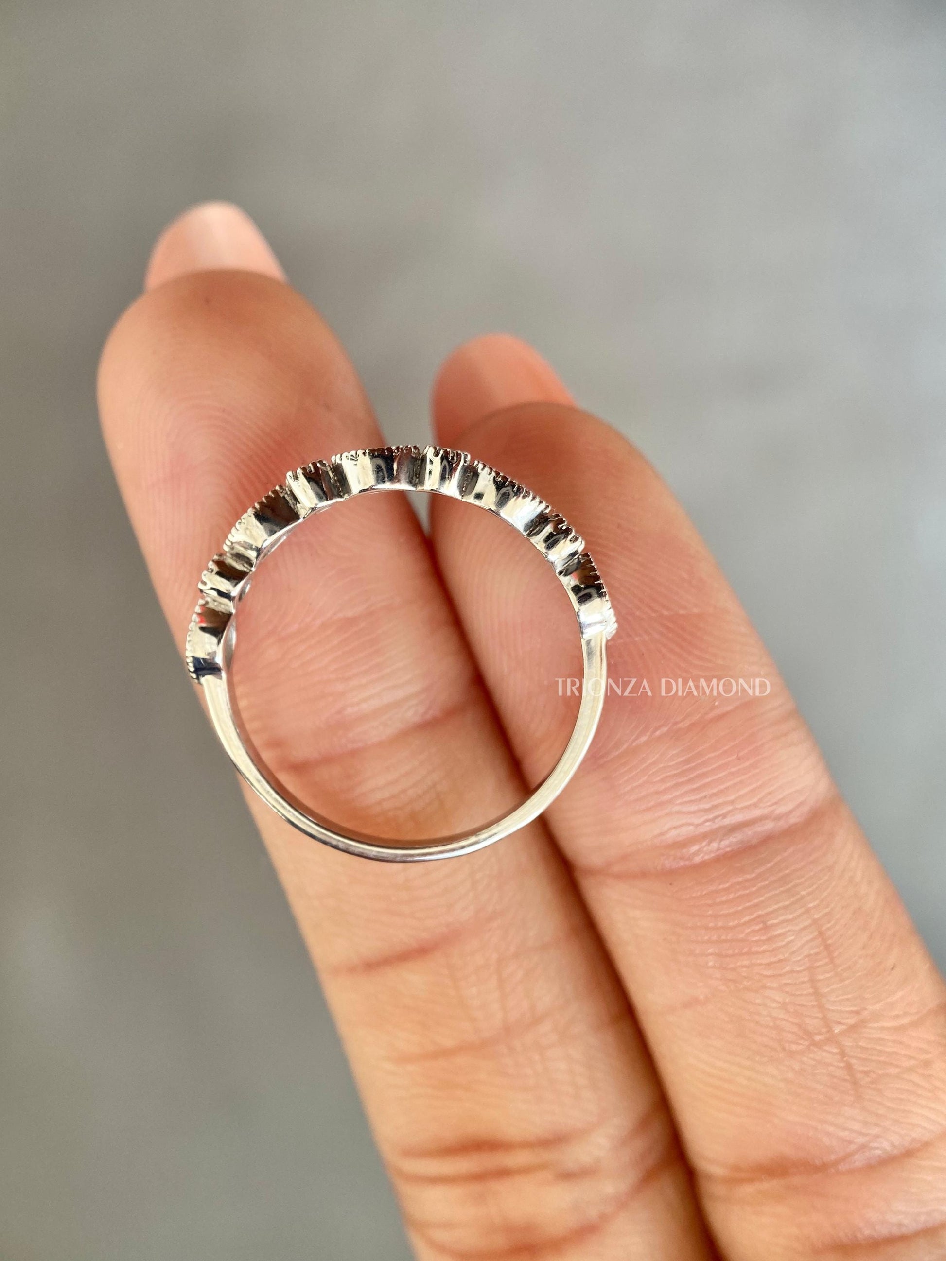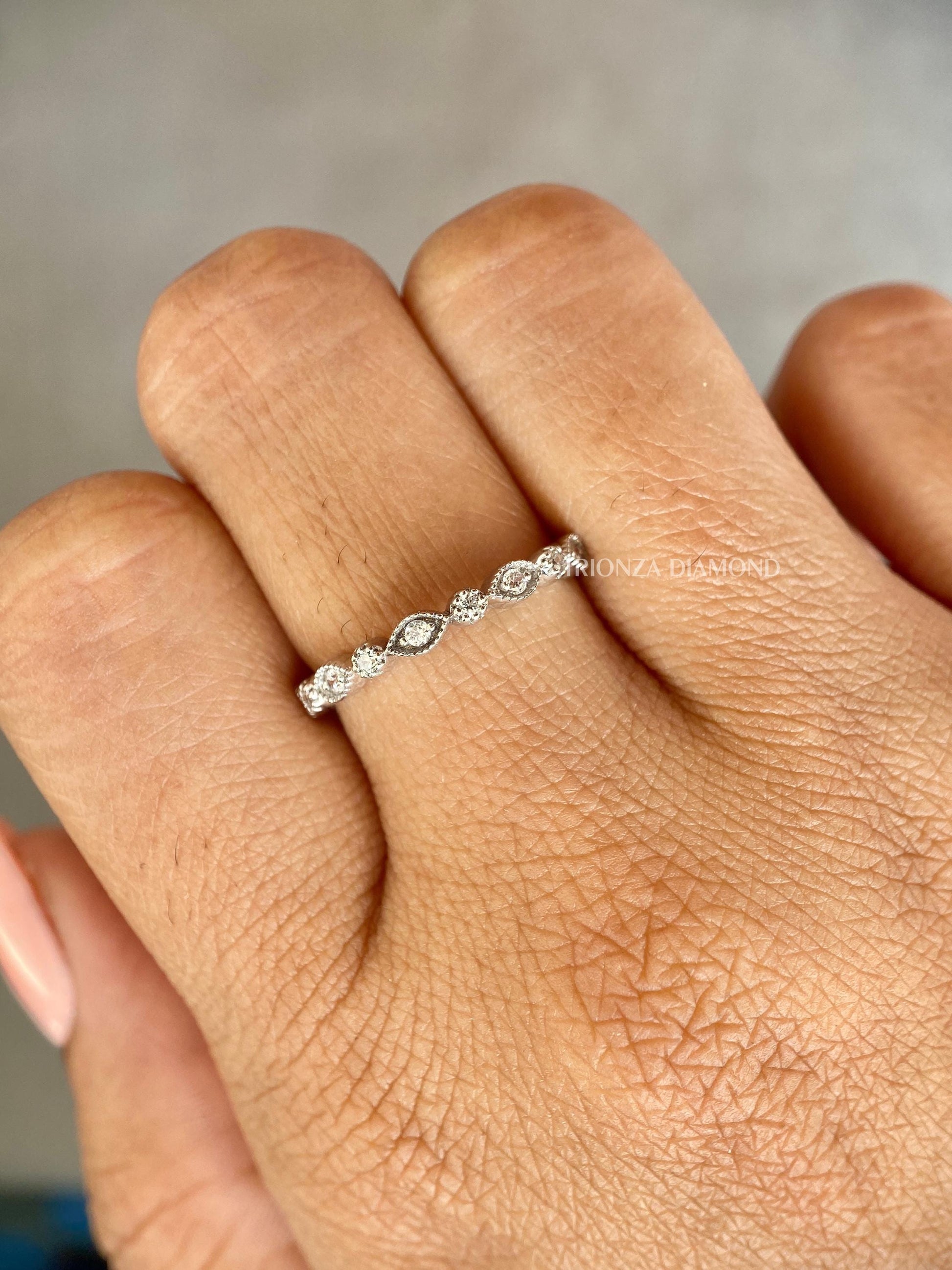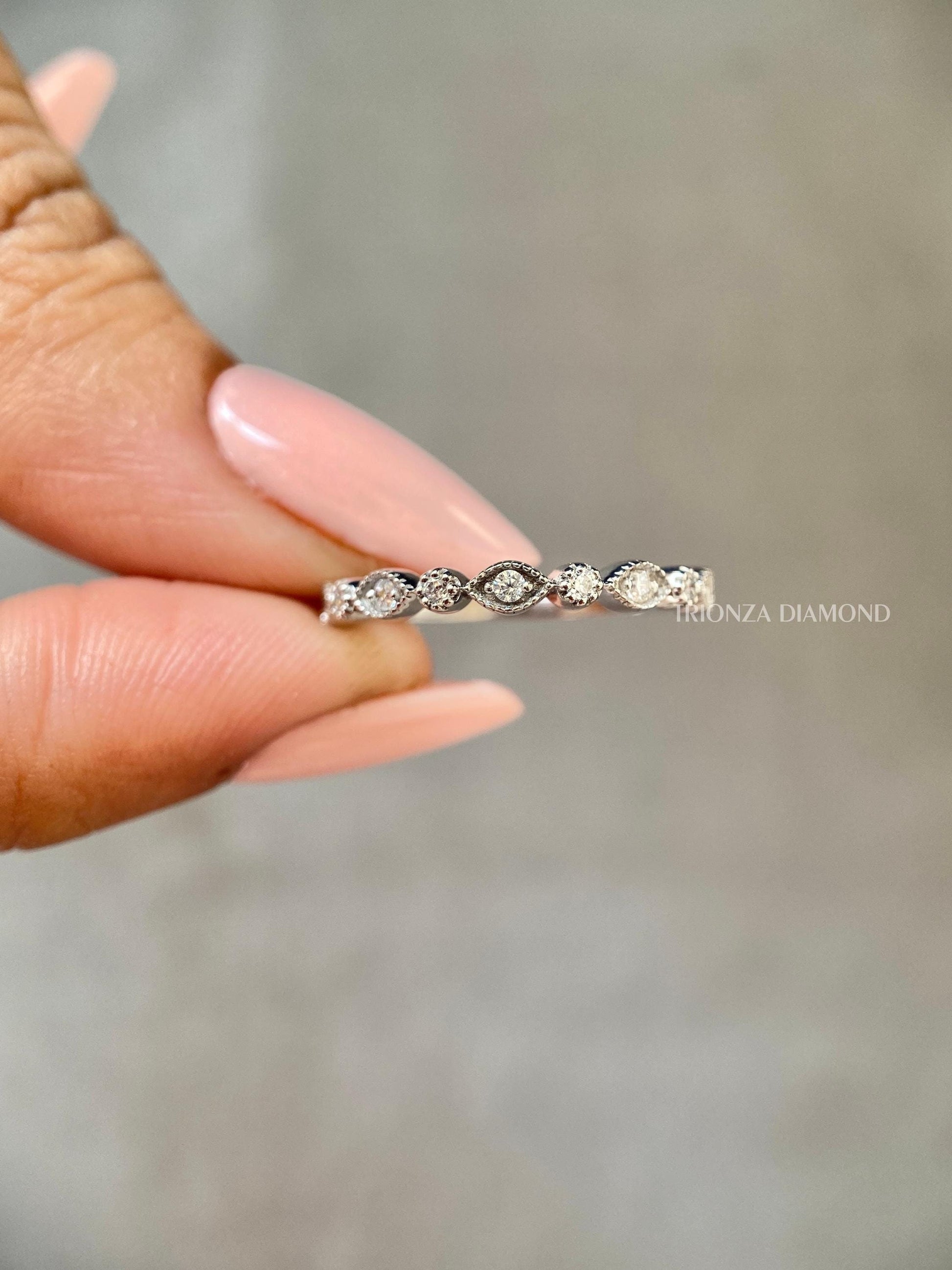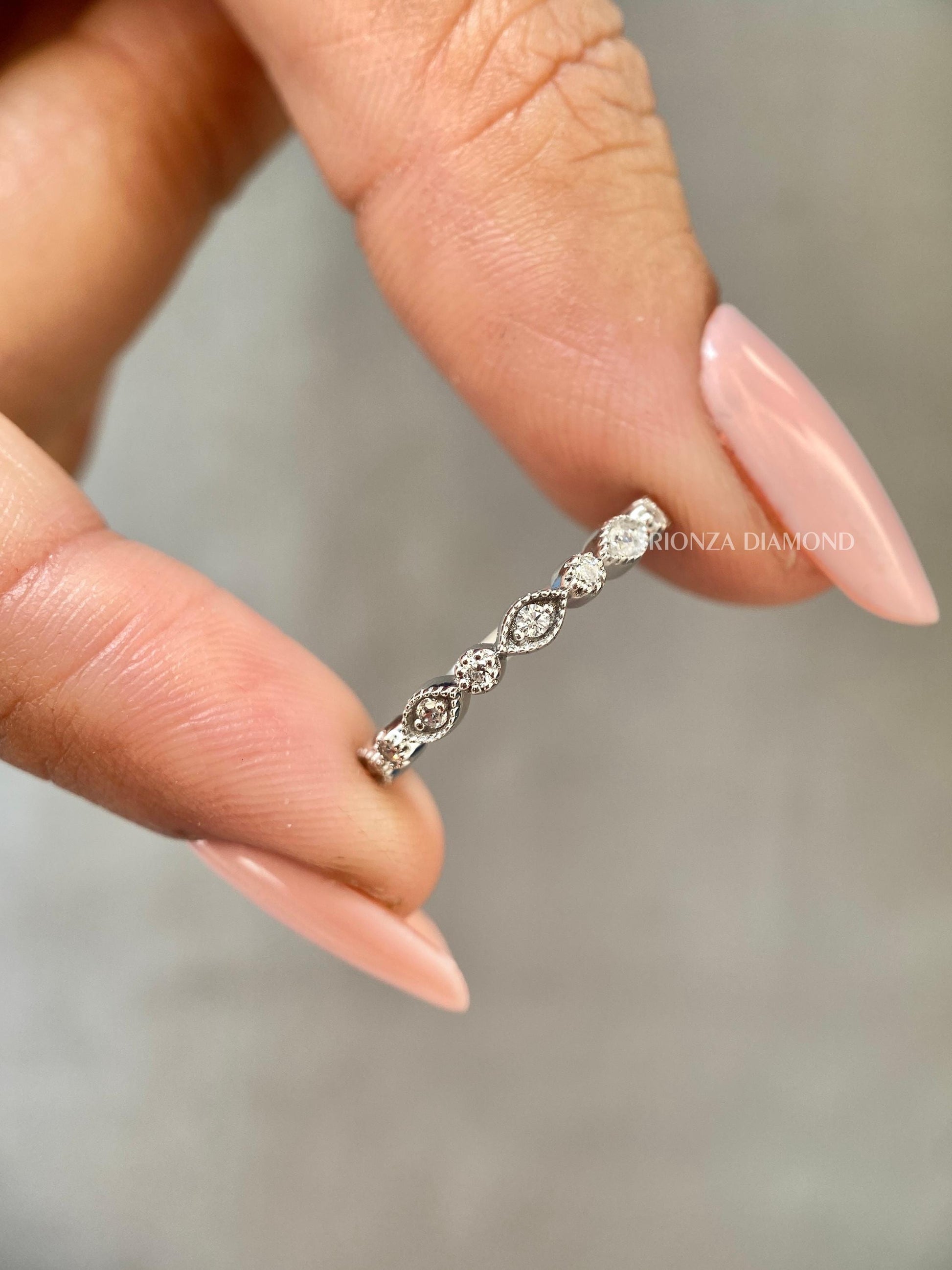 This exquisite vintage style wedding ring features a 0.25 TW round cut lab-grown diamond, set with intricate milgrain detailing and a secure bezel setting, creating a stunning eternity band. It's a perfect stackable band for women, ideal for proposals, anniversaries, or as a timeless wedding ring.