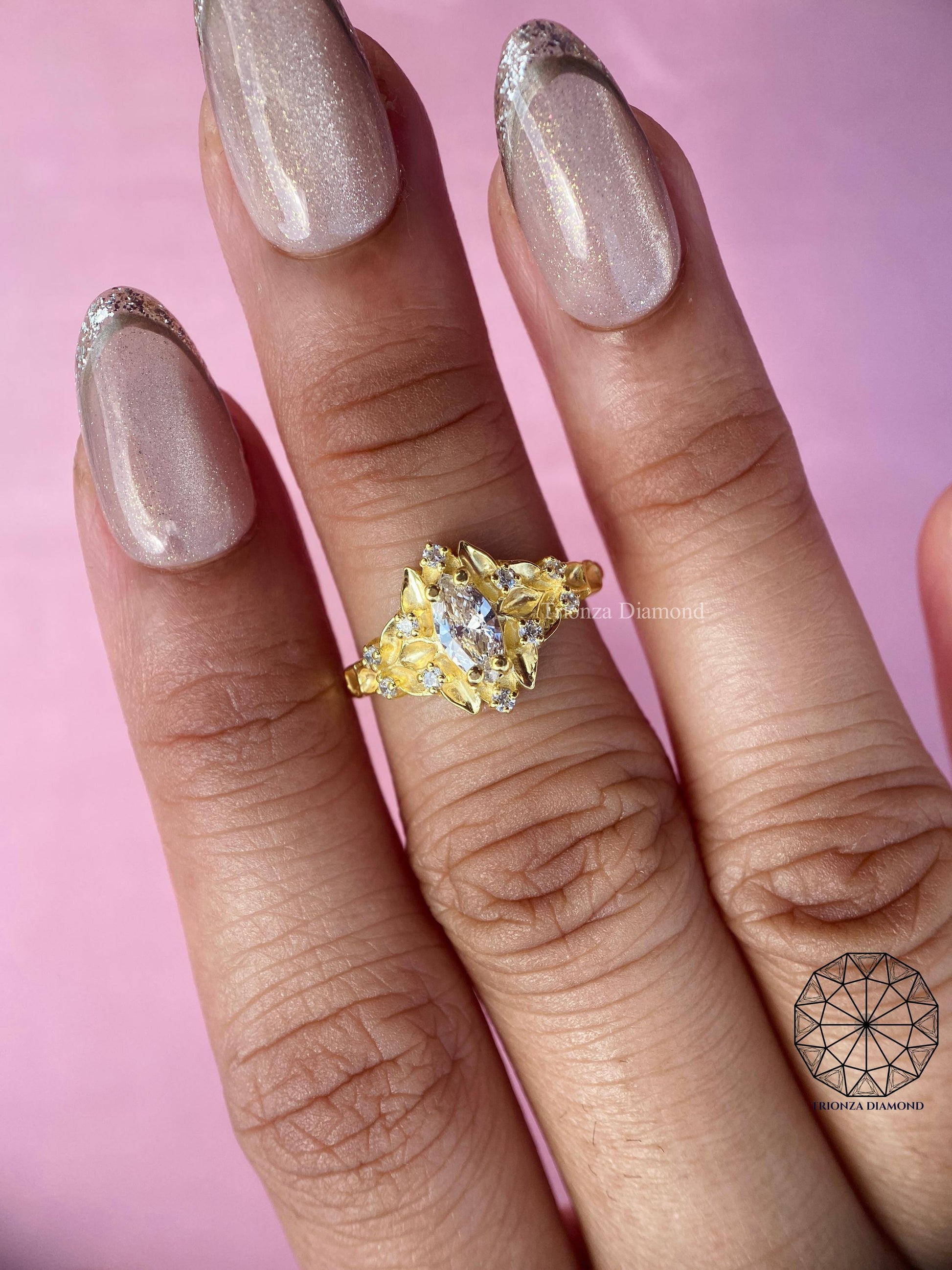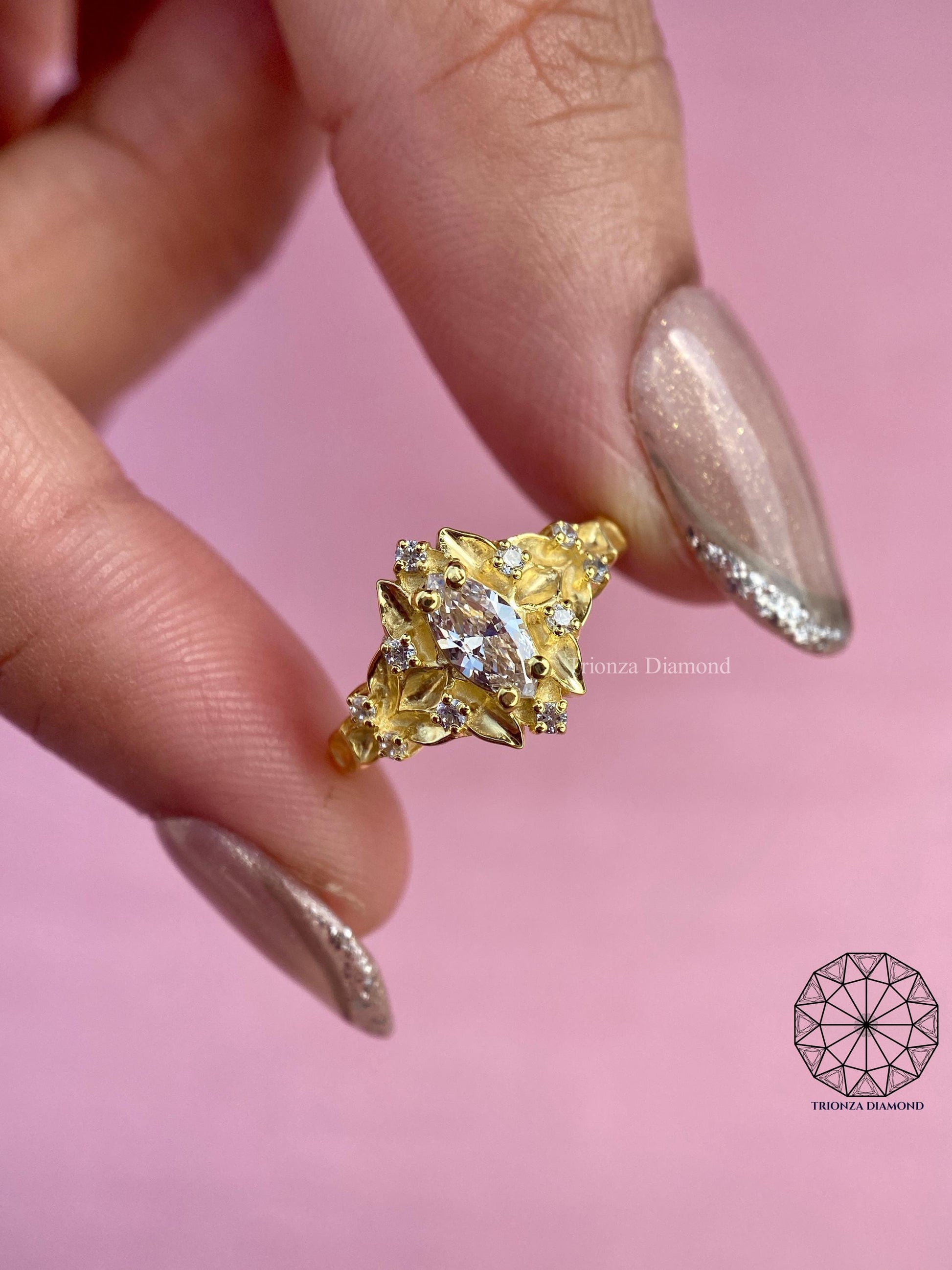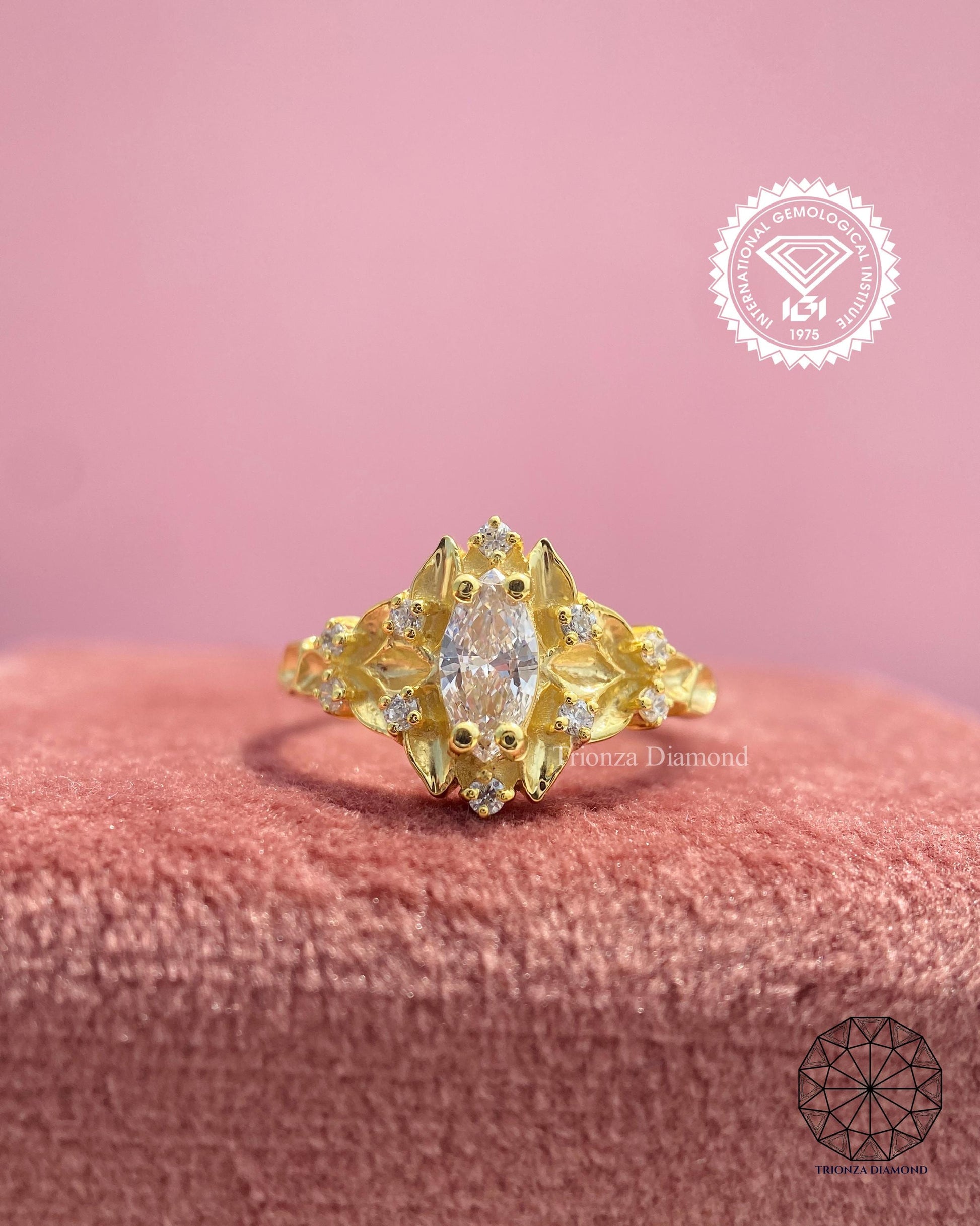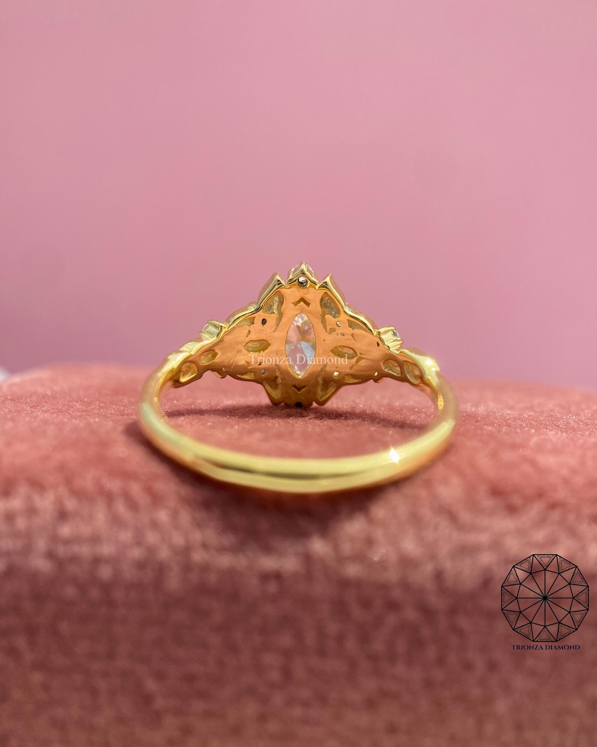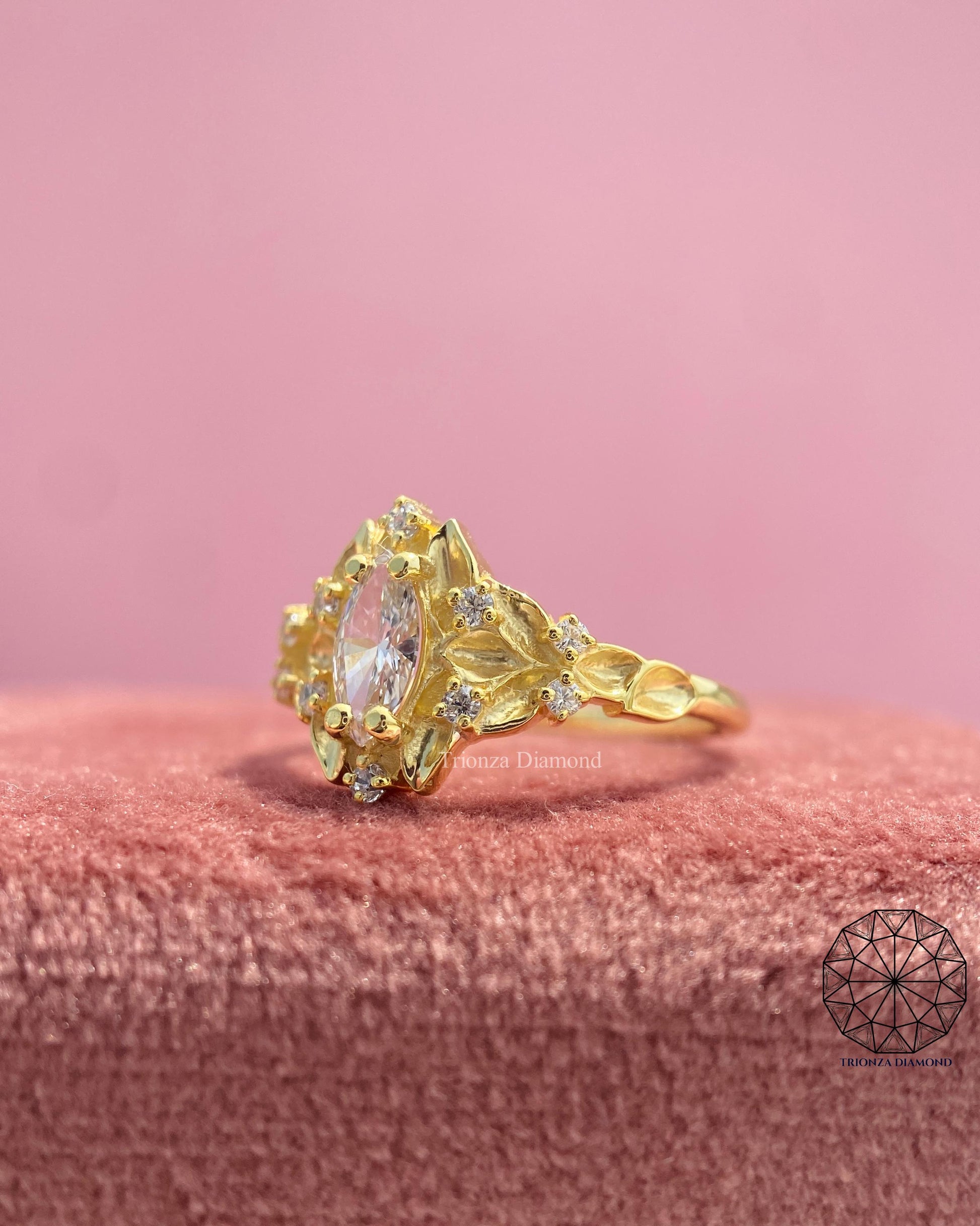 This stunning marquise vintage engagement ring features a 0.30 CT marquise cut lab grown diamond in a nature-inspired leaf style setting. A perfect Christmas gift for her, meticulously crafted with love by Trionza Diamond.