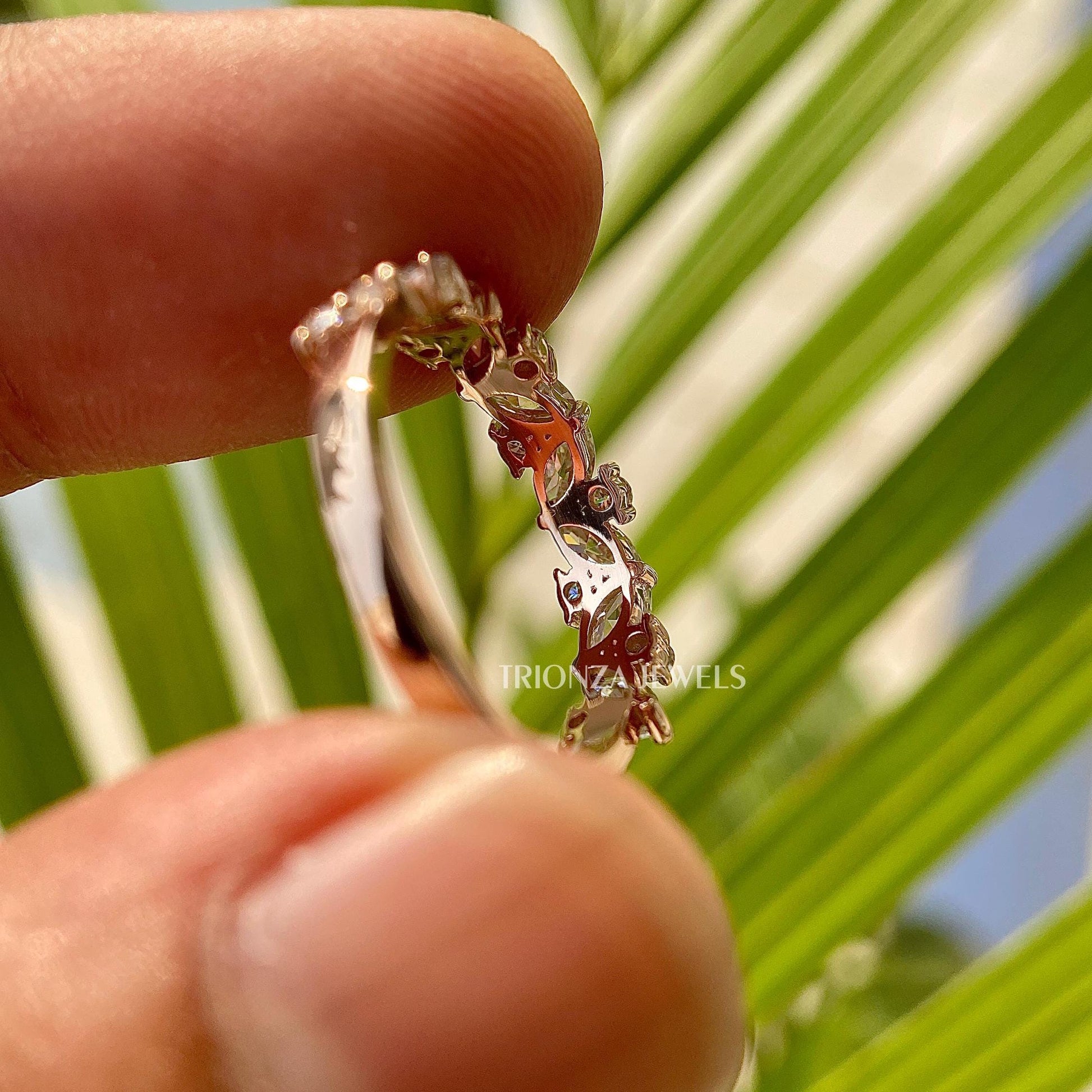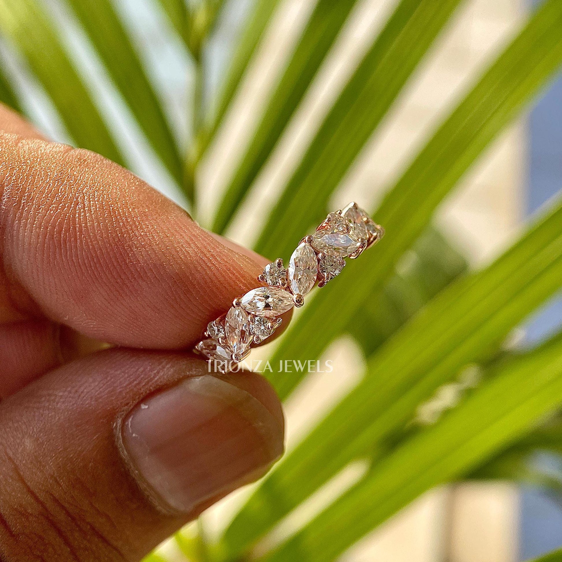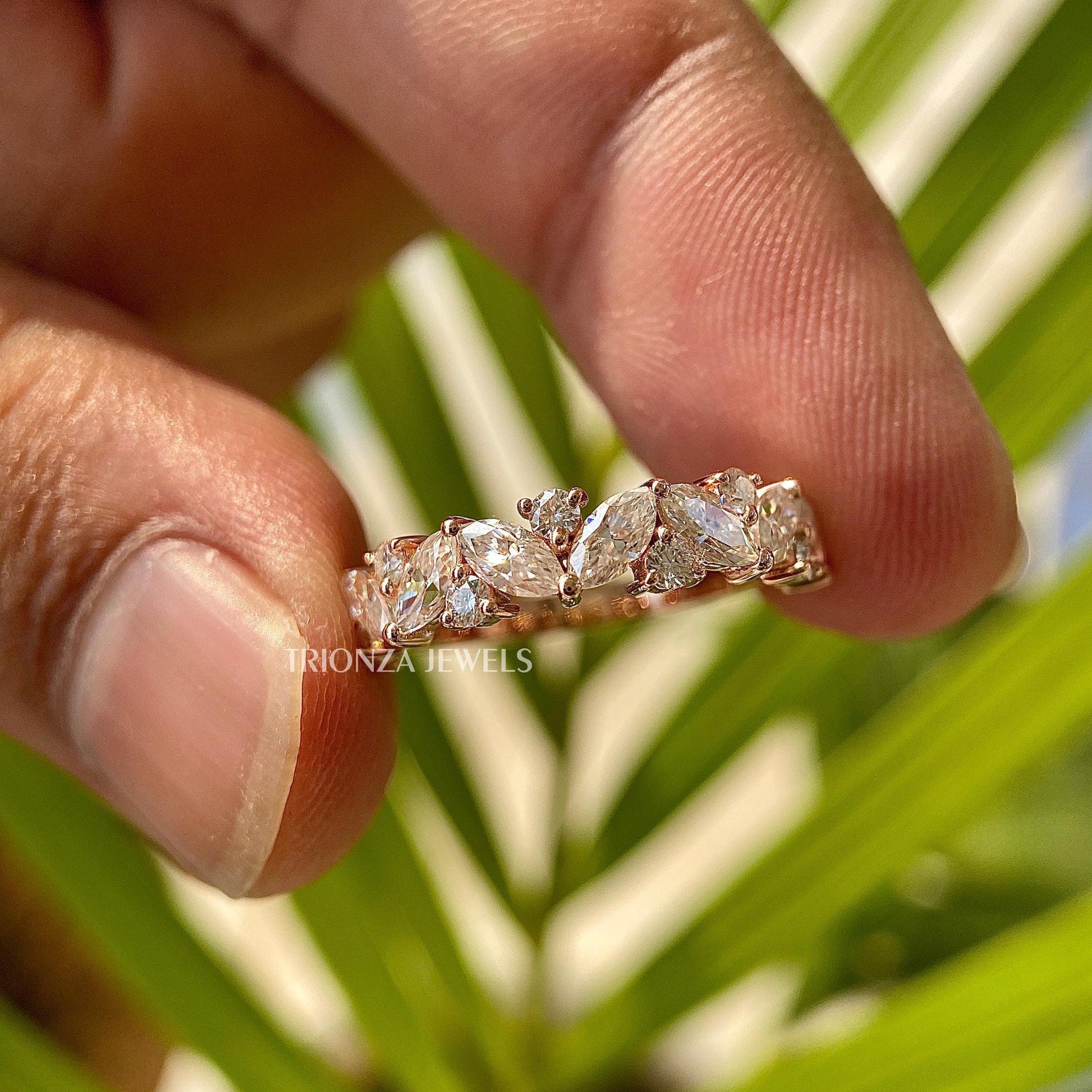 Discover the exquisite Vintage Moissanite Wedding Band from TRIONZA JEWELS! This Half Eternity Rose Gold Ring features stunning Marquise & Round Cut Moissanite gemstones, making it a perfect Women's Promise Ring, Anniversary Bridal Band, or a special Christmas Handmade Jewelry gift.