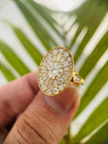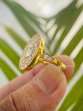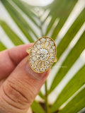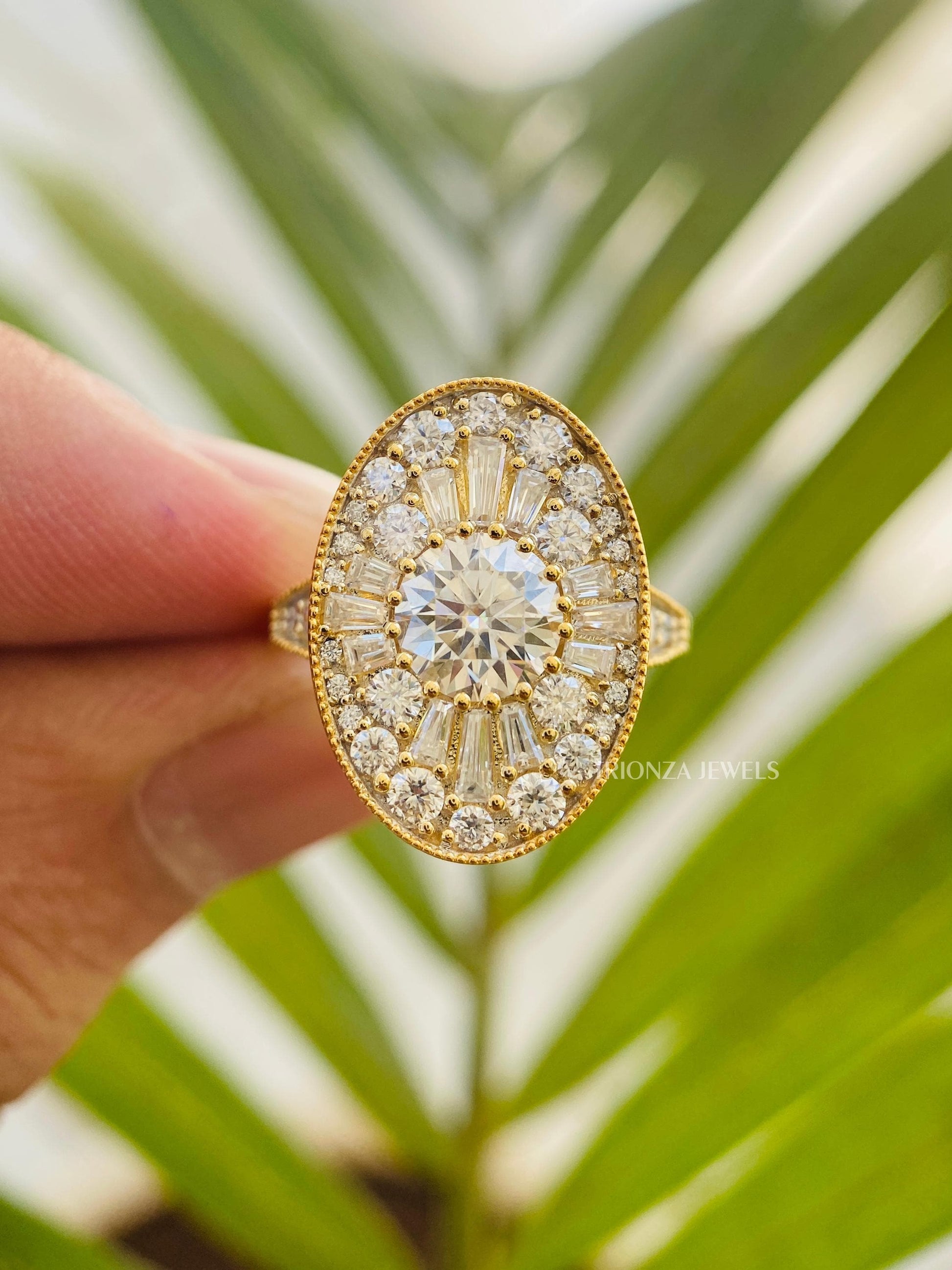 Discover timeless elegance with our Vintage Oval Halo Moissanite Engagement Ring. Featuring a dazzling round-cut moissanite center stone complemented by an exquisite baguette halo, this 14K gold statement ring offers an antique-inspired design perfect for your special moment. Each piece from TRIONZA JEWELS is handcrafted with confidence-driven and environmentally-friendly moissanite, also known as Eco-Friendly Diamond, Ethical Diamond, Sustainable Diamond, or Man-Made Diamond.