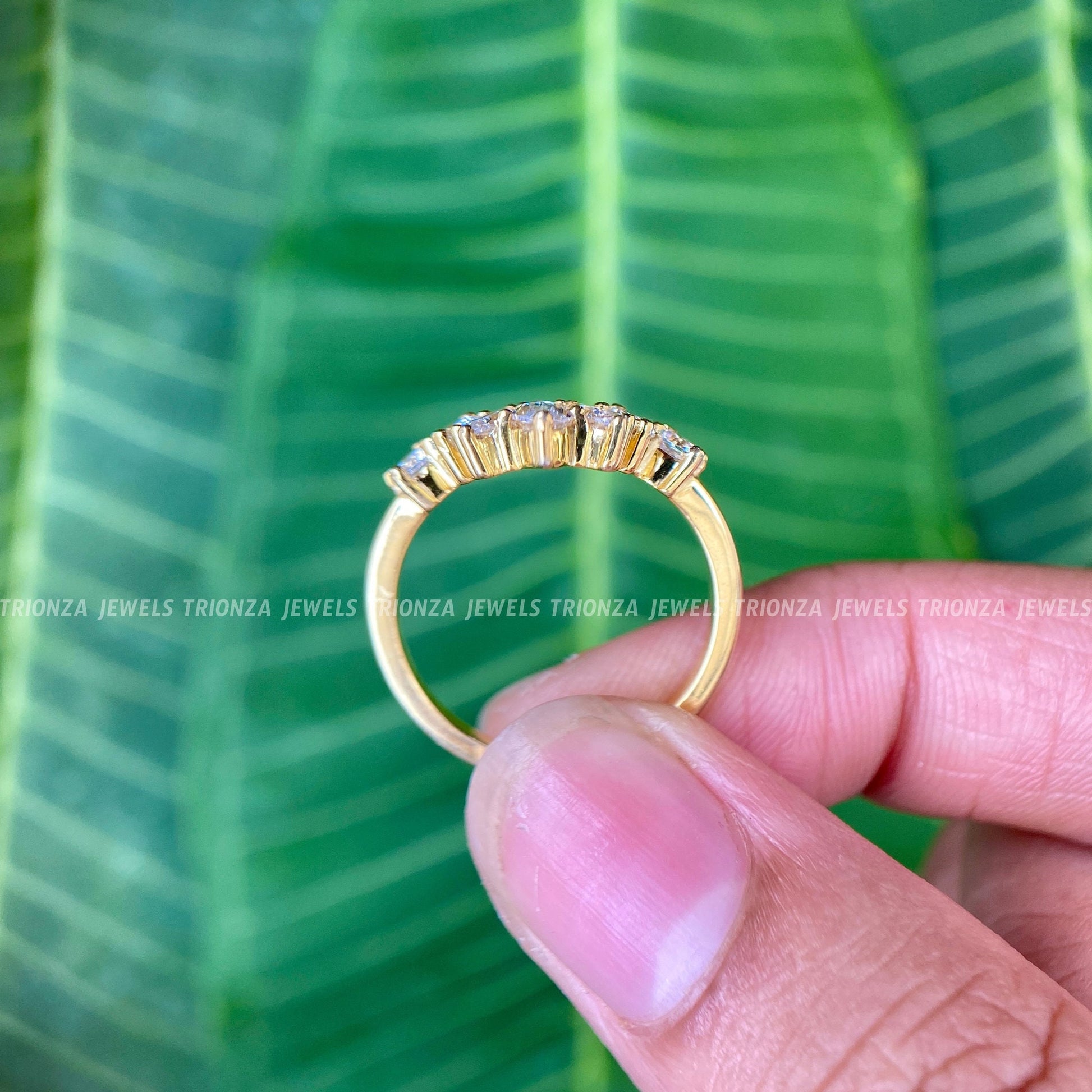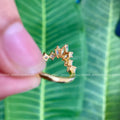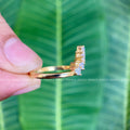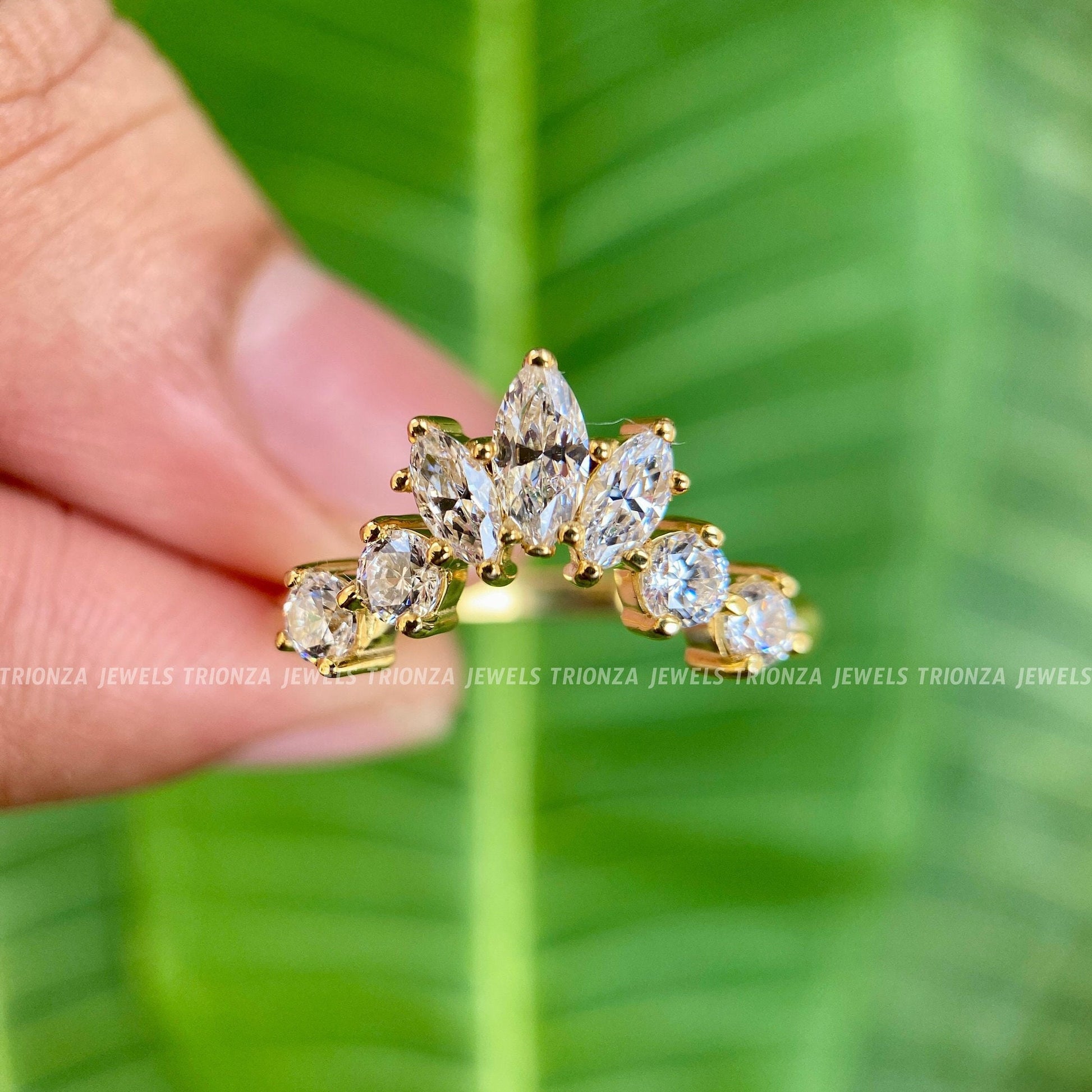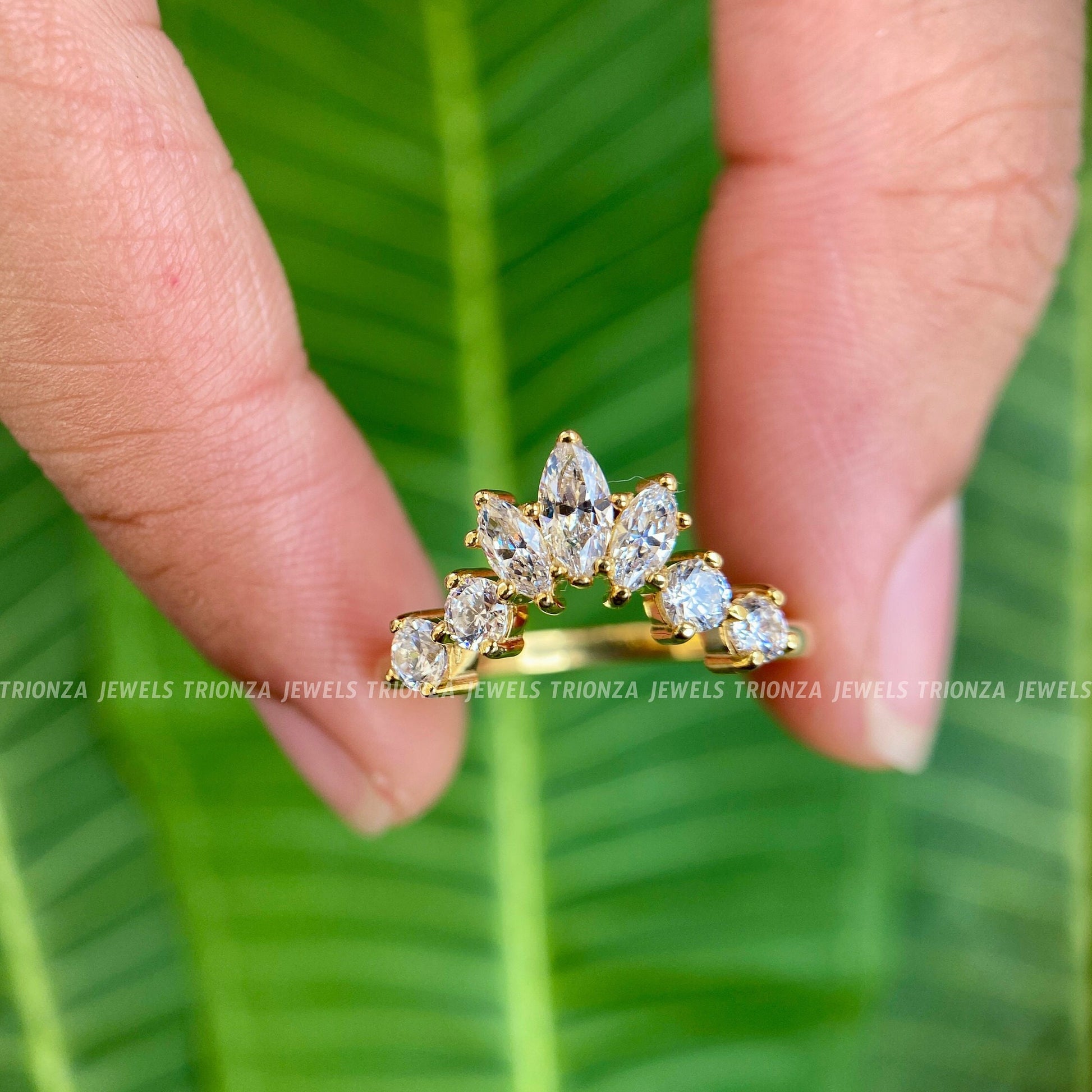 This stunning vintage-inspired tiara ring features marquise and round cut moissanite stones, set in a 14K yellow gold V-shaped curved matching band. Perfect as an Art Deco wedding band or an elegant anniversary gift.